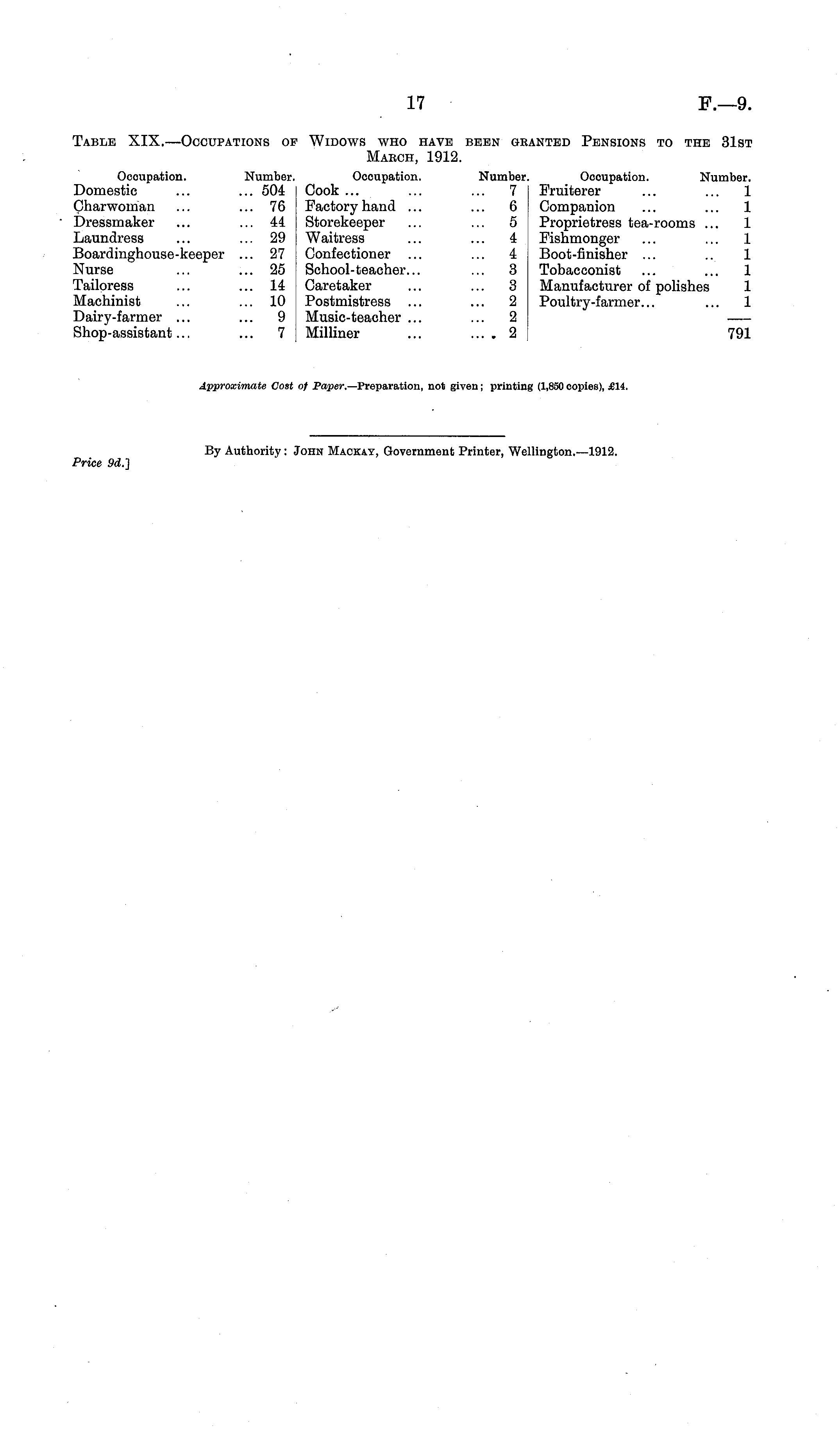 Table XIX.—Occupations of Widows who have been granted Pensions to the 31st March, 1912.