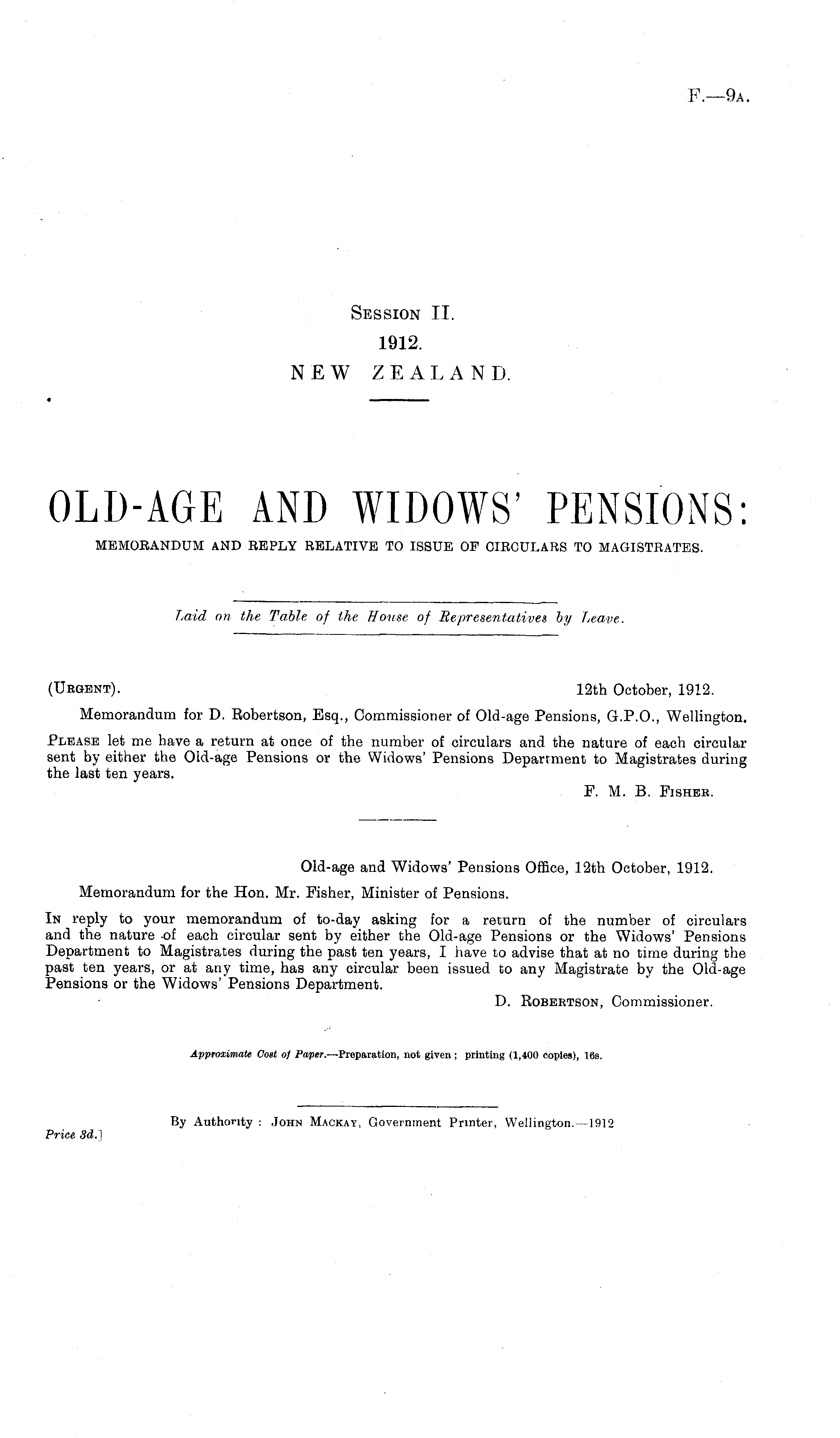 (Urgent). 12th October, 1912. Memorandum for D. Eobertson, Esq., Commissioner of Old-age Pensions, G.P.0., Wellington. Please let me have a return at once of the number of circulars and the nature of each circular sent by either the Old-age Pensions or the Widows' Pensions Department to Magistrates during the last ten years. F. M. B. Fisher. Old-age and Widows' Pensions Office, 12th October, 1912. Memorandum for the Hon. Mr. Fisher, Minister of Pensions. In reply to your memorandum of to-day asking for a return of the number of circulars and the nature -of each circular sent by either the Old-age Pensions or the Widows' Pensions Department to Magistrates during the past ten years, I have to advise that at no time during the past ten years, or at any time, has any circular been issued to any Magistrate by the Old-age Pensions or the Widows' Pensions Department. D. Eobertson, Commissioner.