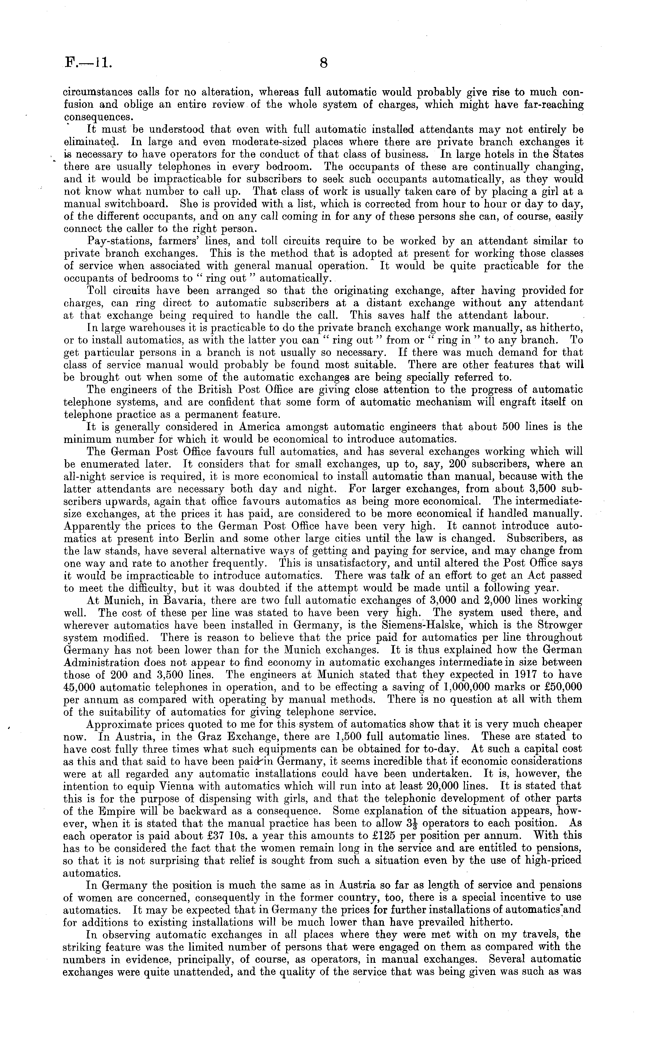 circumstances calls for no alteration, whereas full automatic would probably give rise to much confusion and oblige an entire review of the whole system of charges, which might have far-reaching consequences. It must be understood that even with full automatic installed attendants may not entirely be eliminated. In large and even moderate-sized places where there are private branch exchanges it is necessary to have operators for the conduct of that class of business. In large hotels in the States there are usually telephones in every bedroom. The occupants of these are continually changing, and it would be impracticable for subscribers to seek such occupants automatically, as they would not know what number to call up. That class of work is usually taken care of by placing a girl at a manual switchboard. She is provided with a list, which is corrected from hour to hour or day to day, of the different occupants, and on any call coming in for any of these persons she can, of course, easily connect the caller to the right person. Pay-stations, farmers' lines, and toll circuits require to be worked by an attendant similar to private branch exchanges. This is the method that is adopted at present for working those classes of service when associated with general manual operation. It would be quite practicable for the occupants of bedrooms to " ring out " automatically. Toll circuits have been arranged so that the originating exchange, after having provided for charges, can ring direct to automatic subscribers at a distant exchange without any attendant at that exchange being required to handle the call. This saves half the attendant labour. In large warehouses it is practicable to do the private branch exchange work manually, as hitherto, or to install automatics, as with the latter you can " ring out " from or " ring in "to any branch. To get particular persons in a branch is not usually so necessary. If there was much demand for that class of service manual would probably be found most suitable. There are other features that will be brought out when some of the automatic exchanges are being specially referred to. The engineers of the British Post Office are giving close attention to the progress of automatic telephone systems, and are confident that some form of automatic mechanism will engraft itself on telephone practice as a permanent feature. It is generally considered in America amongst automatic engineers that about 500 lines is the minimum number for which it would be economical to introduce automatics. The German Post Office favours full automatics, and has several exchanges working which will be enumerated later. It considers that for small exchanges, up to, say, 200 subscribers, where an all-night service is required, it is more economical to install automatic than manual, because with the latter attendants are necessary both day and night. For larger exchanges, from about 3,500 subscribers upwards, again that office favours automatics as being more economical. The intermediatesize exchanges, at the prices it has paid, are considered to be more economical if handled manually. Apparently the prices to the German Post Office have been very high. It cannot introduce automatics at present into Berlin and some other large cities until the law is changed. Subscribers, as the law stands, have several alternative ways of getting and paying for service, and may change from one way and rate to another frequently. This is unsatisfactory, and until altered the Post Office says it would be impracticable to introduce automatics. There was talk of an effort to get an Act passed to meet the difficulty, but it was doubted if the attempt would be made until a following year. At Munich, in Bavaria, there are two full automatic exchanges of 3,000 and 2,000 lines working well. The cost of these per line was stated to have been very high. The system used there, and wherever automatics have been installed in Germany, is the Siemens-Halske, which is the Strowger system modified. There is reason to believe that the price paid for automatics per line throughout Germany has not been lower than for the Munich exchanges. It is thus explained how the German Administration does not appear to find economy in automatic exchanges intermediate in size between those of 200 and 3,500 lines. The engineers at Munich stated that they expected in 1917 to have 45,000 automatic telephones in operation, and to be effecting a saving of 1,000,000 marks or £50,000 per annum as compared with operating by manual methods. There is no question at all with them of the suitability of automatics for giving telephone service. Approximate prices quoted to me for this system of automatics show that it is very much cheaper now. In Austria, in the Graz Exchange, there are 1,500 full automatic lines. These are stated to have cost fully three times what such equipments can be obtained for to-day. At such a capital cost as this and that said to have been paid-in Germany, it seems incredible that if economic considerations were at all regarded any automatic installations could have been undertaken. It is, however, the intention to equip Vienna with automatics which will run into at least 20,000 lines. It is stated that this is for the purpose of dispensing with girls, and that the telephonic development of other parts of the Empire will be backward as a consequence. Some explanation of the situation appears, however, when it is stated that the manual practice has been to allow operators to each position. As each operator is paid about £37 10s. a year this amounts to £125 per position per annum. With this has to be considered the fact that the women remain long in the service and are entitled to pensions, so that it is not surprising that relief is sought from such a situation even by the use of high-priced automatics. In Germany the position is much the same as in Austria so far as length of service and pensions of women are concerned, cons