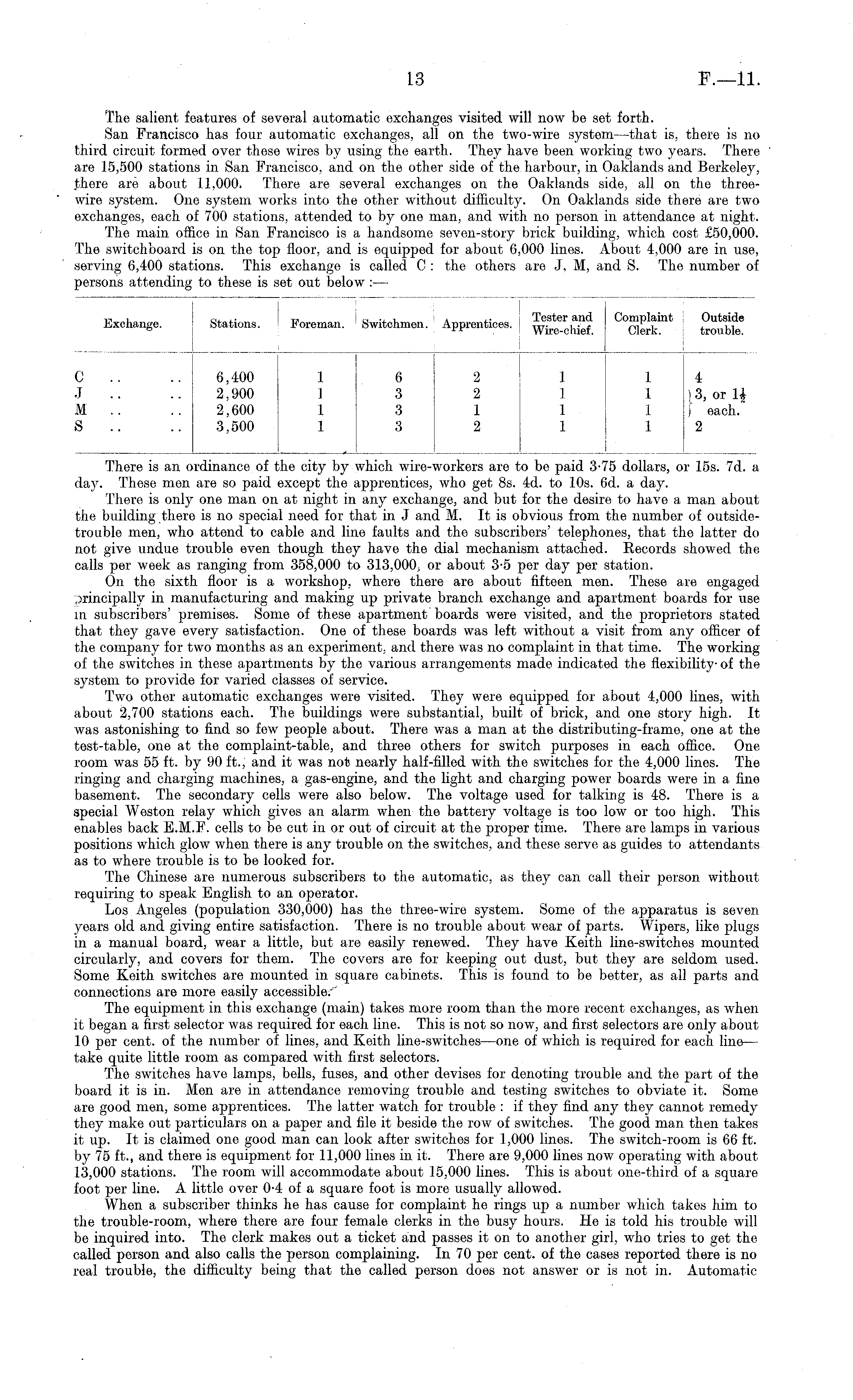 The salient features of several automatic exchanges visited will now be set forth. San Francisco has four automatic exchanges, all on the two-wire system —that is, there is no third circuit formed over these wires by using the earth. They have been working two years. There are 15,500 stations in San Francisco, and on the other side of the harbour, in Oaklands and Berkeley, there are about 11,000. There are several exchanges on the Oaklands side, all on the threewire system. One system works into the other without difficulty. On Oaklands side there are two exchanges, each of 700 stations, attended to by one man, and with no person in attendance at night. The main office in San Francisco is a handsome seven-story brick building, which cost £50,000. The switchboard is on the top floor, and is equipped for about 6,000 lines. About 4,000 are in use, serving 6,400 stations. This exchange is called C : the others are J, M, and S. The number of persons attending to these is set out below : —