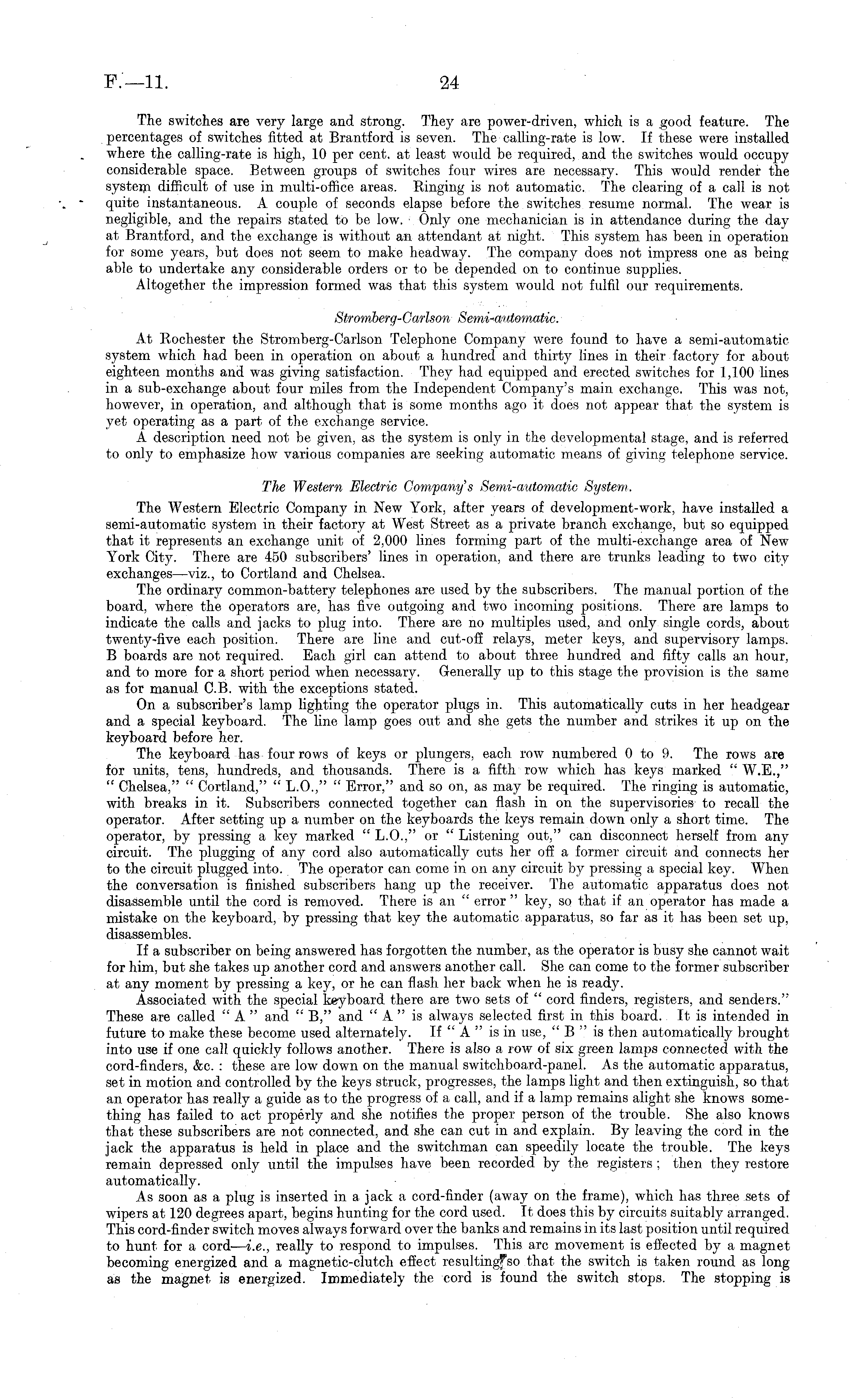 The switches are very large and strong. They are power-driven, which is a good feature. The percentages of switches fitted at Brantford is seven. The calling-rate is low. If these were installed where the calling-rate is high, 10 per cent, at least would be required, and the switches would occupy considerable space. Between groups of switches four wires are necessary. This would render the system difficult of use in multi-office areas. Ringing is not automatic. The clearing of a call is not quite instantaneous. A couple of seconds elapse before the switches resume normal. The wear is negligible, and the repairs stated to be low. Only one mechanician is in attendance during the day at Brantford, and the exchange is without an attendant at night. This system has been in operation for some years, but does not seem to make headway. The company does not impress one as being able to undertake any considerable orders or to be depended on to continue supplies. Altogether the impression formed was that this system would not fulfil our requirements. Stromberg-Carlson Semi-automatic. At Rochester the Stromberg-Carlson Telephone Company were found to have a semi-automatic system which had been in operation on about a hundred and thirty lines in their factory for about eighteen months and was giving satisfaction. They had equipped and erected switches for 1,100 lines in a sub-exchange about four miles from the Independent Company's main exchange. This was not, however, in operation, and although that is some months ago it does not appear that the system is yet operating as a part of the exchange service. A description need not be given, as the system is only in the developmental stage, and is referred to only to emphasize how various companies are seeking automatic means of giving telephone service. The Western Electric Company's Semi-automatic System. The Western Electric Company in New York, after years of development-work, have installed a semi-automatic system in their factory at West Street as a private branch exchange, but so equipped that it represents an exchange unit of 2,000 lines forming part of the multi-exchange area of New York City. There are 450 subscribers' lines in operation, and there are trunks leading to two city exchanges —viz., to Cortland and Chelsea. The ordinary common-battery telephones are used by the subscribers. The manual portion of the board, where the operators are, has five outgoing and two incoming positions. There are lamps to indicate the calls and jacks to plug into. There are no multiples used, and only single cords, about twenty-five each position. There are line and cut-off relays, meter keys, and supervisory lamps. B boards are not required. Each girl can attend to about three hundred and fifty calls an hour, and to more for a short period when necessary. Generally up to this stage the provision is the same as for manual C.B. with the exceptions stated. On a subscriber's lamp lighting the operator plugs in. This automatically cuts in her headgear and a special keyboard. The line lamp goes out and she gets the number and strikes it up on the keyboard before her. The keyboard has four rows of keys or plungers, each row numbered oto 9. The rows are for units, tens, hundreds, and thousands. There is a fifth row which has keys marked " W.E.," " Chelsea," " Cortland," " L.0.," " Error," and so on, as may be required. The ringing is automatic, with breaks in it. Subscribers connected together can flash in on the supervisories to recall the operator. After setting up a number on the keyboards the keys remain down only a short time. The operator, by pressing a key marked " L.0.," or " Listening out," can disconnect herself from any circuit. The plugging of any cord also automatically cuts her off a former circuit and connects her to the circuit plugged into. The operator can come in on any circuit by pressing a special key. When the conversation is finished subscribers hang up the receiver. The automatic apparatus does not disassemble until the cord is removed. There is an " error " key, so that if an operator has made a mistake on the keyboard, by pressing that key the automatic apparatus, so far as it has been set up, disassembles. If a subscriber on being answered has forgotten the number, as the operator is busy she cannot wait for him, but she takes up another cord and answers another call. She can come to the former subscriber at any moment by pressing a key, or he can flash her back when he is ready. Associated with the special keyboard there are two sets of " cord finders, registers, and senders." These are called "A " and " B," and "A " is always selected first in this board. It is intended in future to make these become used alternately. If "A"is in use, "B" is then automatically brought into use if one call quickly follows another. There is also a row of six green lamps connected with the cord-finders, &c. : these are low down on the manual switchboard-panel. As the automatic apparatus, set in motion and controlled by the keys struck, progresses, the lamps light and then extinguish, so that an operator has really a guide as to the progress of a call, and if a lamp remains alight she knows something has failed to act properly and she notifies the proper person of the trouble. She also knows that these subscribers are not connected, and she can cut in and explain. By leaving the cord in the jack the apparatus is held in place and the switchman can speedily locate the trouble. The keys remain depressed only until the impulses have been recorded by the registers ; then they restore automatically. As soon as a plug is inserted in a jack a cord-finder (away on the frame), which has three sets of wipers at 120 degrees apart, begins hunting for the cord used. It does this by circuits suitably arranged. This cord-finder switch moves always forward over the banks and remains in its last position until required to hunt for a cord- — i.e., really to respond to impu