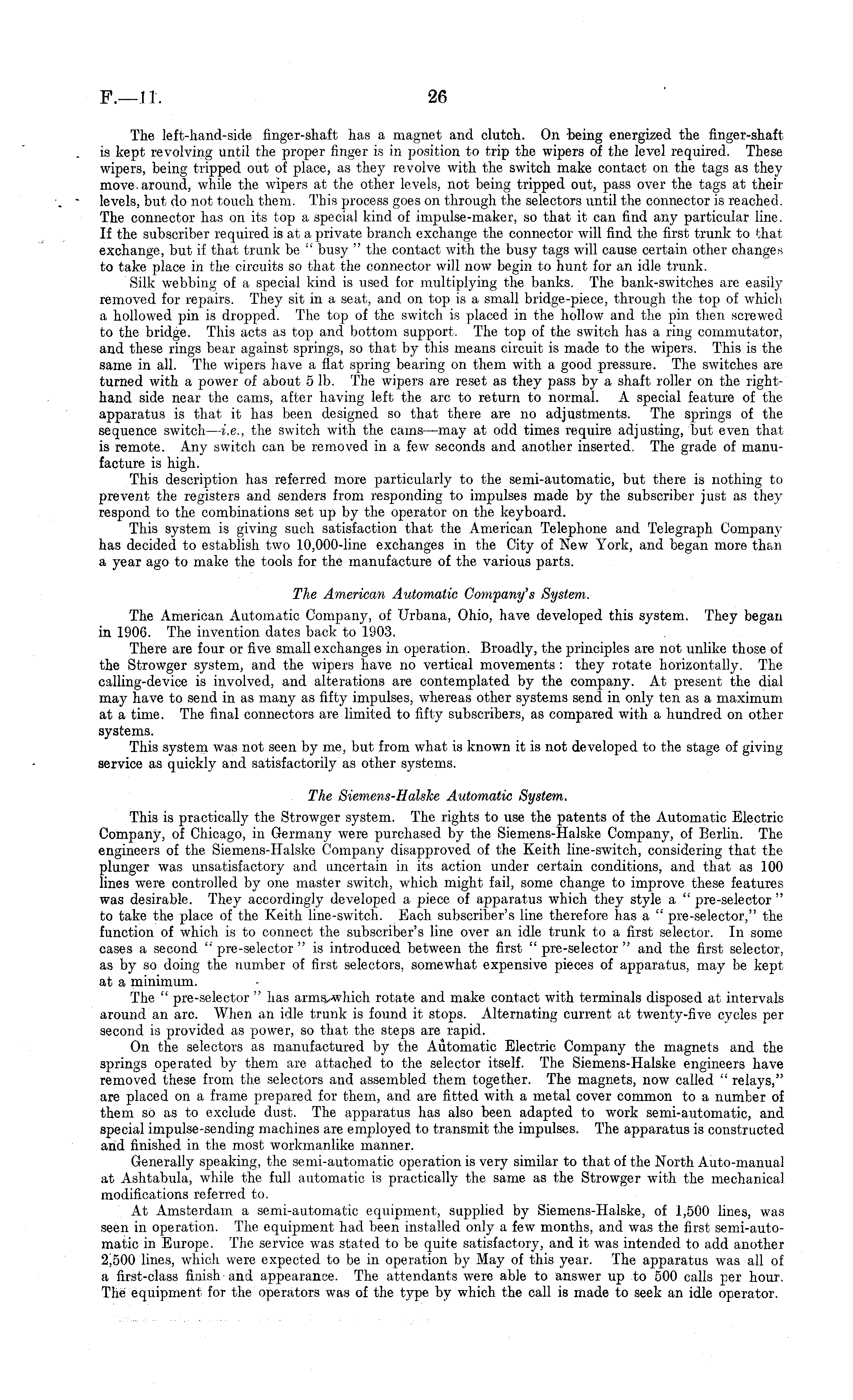 The left-hand-side finger-shaft has a magnet and clutch. On being energized the finger-shaft is kept revolving until the proper finger is in position to trip the wipers of the level required. These wipers, being tripped out of place, as they revolve with the switch make contact on the tags as they move around, while the wipers at the other levels, not being tripped out, pass over the tags at their levels, but do not touch them. This process goes on through the selectors until the connector is reached. The connector has on its top a special kind of impulse-maker, so that it can find any particular line. If the subscriber required is at a private branch exchange the connector will find the first trunk to that exchange, but if that trunk be " busy " the contact with the busy tags will cause certain other changes to take place in the circuits so that the connector will now begin to hunt for an idle trunk. Silk webbing of a special kind is used for multiplying the banks. The bank-switches are easily removed for repairs. They sit in a seat, and on top is a small bridge-piece, through the top of which a hollowed pin is dropped. The top of the switch is placed in the hollow and the pin then screwed to the bridge. This acts as top and bottom support. The top of the switch has a ring commutator, and these rings bear against springs, so that by this means circuit is made to the wipers. This is the same in all. The wipers have a flat spring bearing on them with a good pressure. The switches are turned with a power of about 5 lb. The wipers are reset as they pass by a shaft roller on the righthand side near the cams, after having left the arc to return to normal. A special feature of the apparatus is that it has been designed so that there are no adjustments. The springs of the sequence switch — i.e., the switch with the cams—may at odd times require adjusting, but even that is remote. Any switch can be removed in a few seconds and another inserted. The grade of manufacture is high. This description has referred more particularly to the semi-automatic, but there is nothing to prevent the registers and senders from responding to impulses made by the subscriber just as they respond to the combinations set up by the operator on the keyboard. This system is giving such satisfaction that the American Telephone and Telegraph Companyhas decided to establish two 10,000-line exchanges in the City of New York, and began more than a year ago to make the tools for the manufacture of the various parts. The American Automatic Company's System. The American Automatic Company, of Urbana, Ohio, have developed this system. They began in 1906. The invention dates back to 1903. There are four or five small exchanges in operation. Broadly, the principles are not unlike those of the Strowger system, and the wipers have no vertical movements : they rotate horizontally. The calling-device is involved, and alterations are contemplated by the company. At present the dial may have to send in as many as fifty impulses, whereas other systems send in only ten as a maximum at a time. The final connectors are limited to fifty subscribers, as compared with a hundred on other systems. This system was not seen by me, but from what is known it is not developed to the stage of giving service as quickly and satisfactorily as other systems. The Siemens-Halske Automatic System. This is practically the Strowger system. The rights to use the patents of the Automatic Electric Company, of Chicago, in Germany were purchased by the Siemens-Halske Company, of Berlin. The engineers of the Siemens-Halske Company disapproved of the Keith line-switch, considering that the plunger was unsatisfactory and uncertain in its action under certain conditions, and that as 100 lines were controlled by one master switch, which might fail, some change to improve these features was desirable. They accordingly developed a piece of apparatus which they style a " pre-selector " to take the place of the Keith line-switch. Each subscriber's line therefore has a " pre-selector," the function of which is to connect the subscriber's line over an idle trunk to a first selector. In some cases a second " pre-selector " is introduced between the first " pre-selector " and the first selector, as by so doing the number of first selectors, somewhat expensive pieces of apparatus, may be kept at a minimum. The " pre-selector " has rotate and make contact with terminals disposed at intervals around an arc. When an idle trunk is found it stops. Alternating current at twenty-five cycles per second is provided as power, so that the steps are rapid. On the selectors as manufactured by the Automatic Electric Company the magnets and the springs operated by them are attached to the selector itself. The Siemens-Halske engineers have removed these from the selectors and assembled them together. The magnets, now called " relays," are placed on a frame prepared for them, and are fitted with a metal cover common to a number of them so as to exclude dust. The apparatus has also been adapted to work semi-automatic, and special impulse-sending machines are employed to transmit the impulses. The apparatus is constructed and finished in the most workmanlike manner. Generally speaking, the semi-automatic operation is very similar to that of the North Auto-manual at Ashtabula, while the full automatic is practically the same as the Strowger with the mechanical modifications referred to. xit Amsterdam a semi-automatic equipment, supplied by Siemens-Halske, of 1,500 lines, was seen in operation. The equipment had been installed only a few months, and was the first semi-auto-matic in Europe. The service was stated to be quite satisfactory, and it was intended to add another 2,500 lines, which were expected to be in operation by May of this year. The apparatus was all of a first-class finish-and appearance. The attendants were able to answer up to 500 calls per hour. The equipment for the operators 