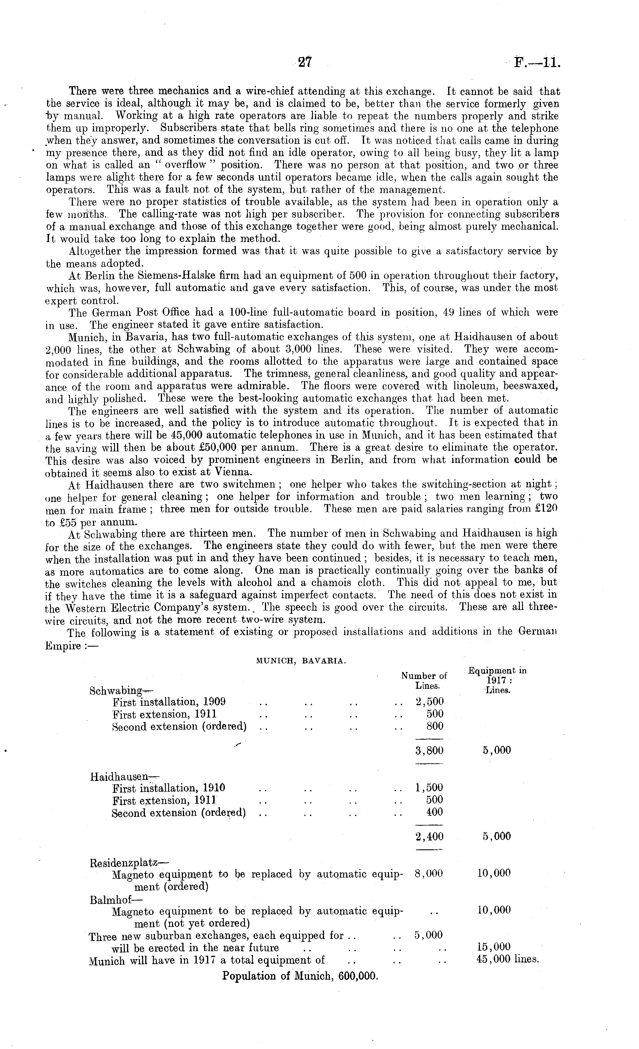 There were three mechanics and a wire-chief attending at this exchange. It cannot be said that the service is ideal, although it may be, and is claimed to be, better than the service formerly given "by manual. Working at a high rate operators are liable to repeat the numbers properly and strike them up improperly. Subscribers state that bells ring sometimes and there is no one at the telephone when they answer, and sometimes the conversation is cut off. It was noticed that calls came in during my presence there, and as they did not find an idle operator, owing to all being busy, they lit a lamp on what is called an " overflow " position. There was no person at that position, and two or three lamps were alight there for a few seconds until operators became idle, when the calls again sought the operators. This was a fault not of the system, but rather of the management. There were no proper statistics of trouble available, as the system had been in operation only a few months. The calling-rate was not high per subscriber. The provision for connecting subscribers of a manual, exchange and those of this exchange together were good, being almost purely mechanical. It would take too long to explain the method. Altogether the impression formed was that it was quite possible to give a satisfactory service by the means adopted. At Berlin the Siemens-Halske firm had an equipment of 500 in operation throughout their factory, which was, however, full automatic and gave every satisfaction. This, of cour.se, was under the most expert control. The German Post Office had a 100-line full-automatic board in position, 49 lines of which were in use. The engineer stated it gave entire satisfaction. Munich, in Bavaria, has two full-automatic exchanges of this system, one at Haidhausen of about 2,000 lines, the other at Schwabing of about 3,000 lines. These were visited. They were accommodated in fine buildings, and the rooms allotted to the apparatus were large and contained space for considerable additional apparatus. The trimness, general cleanliness, and good quality and appearance of the room and apparatus were admirable. The floors were covered with linoleum, beeswaxed, and highly polished. These were the best-looking automatic exchanges that had been met. The engineers are well satisfied with the system and its operation. Tlie number of automatic lines is to be increased, and the policy is to introduce automatic throughout. It is expected that in a few years there will be 45,000 automatic telephones in use in Munich, and it has been estimated that the saving will then be about £50,000 per annum. There is a great desire to eliminate the operator. This desire was also voiced by prominent engineers in Berlin, and from what information could be obtained it seems also to exist at Vienna. At Haidhausen there are two switchmen ; one helper who takes the switching-section at night; one helper for general cleaning ; one helper for information and trouble ; two men learning ; two men for main frame ; three men for outside trouble. These men are paid salaries ranging from £120 to £55 per annum. At Schwabing there are thirteen men. The number of men in Schwabing and Haidhausen is high for the size of the exchanges. The engineers state they could do with fewer, but the men were there when the installation was put in and they have been continued ; besides, it is necessary to teach men, as more automatics are to come along. One man is practically continually going over the banks of the switches cleaning the levels with alcohol and a chamois cloth. This did not appeal to me, but if they have the time it is a safeguard against imperfect contacts. The need of this does not exist in the Western Electric Company's system.. The speech is good over the circuits. These are all threewire circuits, and not the more recent two-wire system. The following is a statement of existing or proposed installations and additions in the German Empire : — MUNICH, BAVARIA. ~ , ~ Equipment in Number of fg.» . Schwabing— Lines ' Lines.' First installation, 1909 .. .. .. ..2,500 First extension, 1911 .. .. .. .. 500 Second extension (ordered) .. .. .. .. 800 3,800 5,000 Haidhausen — First installation, 1910 .. .. .. .. 1,500 First extension, 1911 .. .. .. .. 500 Second extension (ordered) .. .. .. .. 400 2,400 5,000 Residenzplatz — Magneto equipment to be replaced by automatic equip- 8,000 10,000 ment (ordered) Balmhof — Magneto equipment to be replaced by automatic equip- .. 10,000 ment (not yet ordered) Three new suburban exchanges, each equipped for . . . . 5,000 will be erected in the near future .. .. .. .. 15,000 Munich will have in 1917 a total equipment of .. .. .. 45,000 lines. Population of Munich, 600,000.