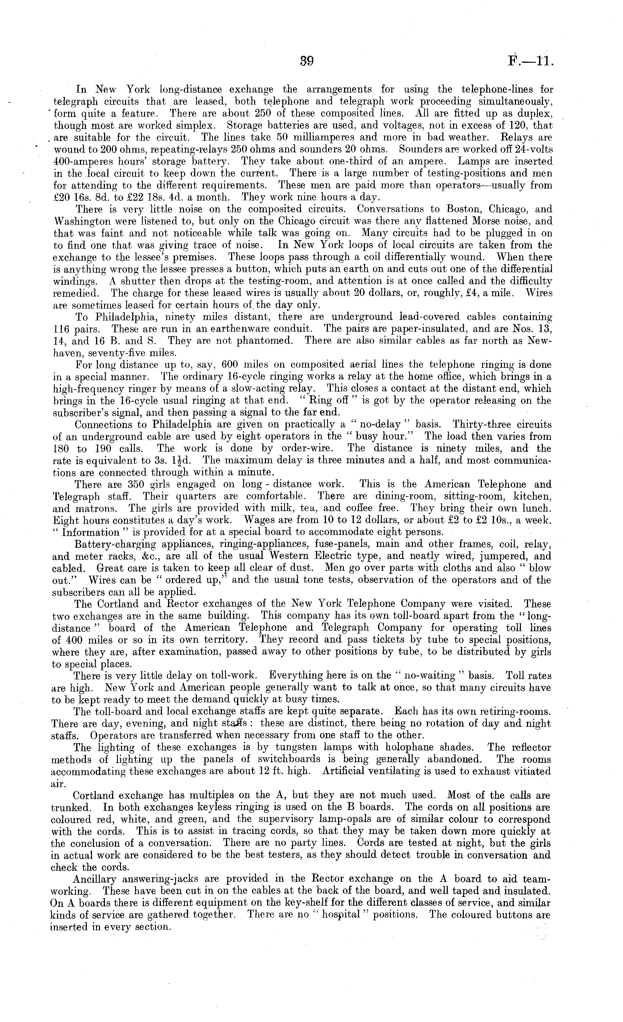 In New York long-distance exchange the arrangements for using the telephone-lines for telegraph circuits that are leased, both telephone and telegraph work proceeding simultaneously, "form quite a feature. There are about 250 of these composited lines. All are fitted up as duplex, though most are worked simplex. Storage batteries are used, and voltages, not in excess of 120, that are suitable for the circuit. The lines take 50 milliamperes and more in bad weather. Relays are wound to 200 ohms, repeating-relays 250 ohms and sounders 20 ohms. Sounders are worked off 24-volts 400-amperes hours' storage battery. They take about one-third of an ampere. Lamps are inserted in the local circuit to keep down the current. There is a large number of testing-positions and men for attending to the different requirements. These men are paid more than operators —usually from £20 16s. Bd. to £22 18s. 4d. a month. They work nine hours a day. There is very little noise on the composited circuits. Conversations to Boston, Chicago, and Washington were listened to, but only on the Chicago circuit was there any flattened Morse noise, and that was faint and not noticeable while talk was going on. Many circuits had to be plugged in on to find one that was giving trace of noise. In New York loops of local circuits are taken from the exchange to the lessee's premises. These loops pass through a coil differentially wound. When there is anything wrong the lessee presses a button, which puts an earth on and cuts out one of the differential windings. A shutter then drops at the testing-room, and attention is at once called and the difficulty remedied. The charge for these leased wires is usually about 20 dollars, or, roughly, £4, a mile. Wires are sometimes leased for certain hours of. the day only. To Philadelphia, ninety miles distant, there are underground lead-covered cables containing 116 pairs. These are run in an earthenware conduit. The pairs are paper-insulated, and are Nos. 13, 14, and 16 B. and S. They are not phantomed. There are also similar cables as far north as Newhaven, seventy-five miles. For long distance up to, say, 600 miles on composited aerial lines the telephone ringing is done in a special manner. The ordinary 16-cycle ringing works a relay at the home office, which brings in a high-frequency ringer by means of a slow-acting relay. This closes a contact at the distant end, which brings in the 16-cycle usual ringing at that end. " Ring off "is got by the operator releasing on the subscriber's signal, and then passing a signal to the far end. Connections to Philadelphia are given on practically a " no-deiay " basis. Thirty-three circuits of an underground cable are used by eight operators in the " busy hour." The load then varies from 180 to 190 calls. The work is done by order-wire. The distance is ninety miles, and the rate is equivalent to 3s. ljd. The maximum delay is three minutes and a half, and most communications are connected through within a minute. There are 350 girls engaged on long - distance work. This is the American Telephone and Telegraph staff. Their quarters are comfortable. There are dining-room, sitting-room, kitchen, and matrons. The girls are provided with milk, tea, and coffee free. They bring their own lunch. Eight hours constitutes a day's work. Wages are from 10 to 12 dollars, or about £2 to £2 10s., a week. " Information " is provided for at a special board to accommodate eight persons. Battery-charging appliances, ringing-appliances, fuse-panels, main and other frames, coil, relay, and meter racks, &c, are all of the usual Western Electric type, and neatly wired, jumpered, and cabled. Great care is taken to keep all clear of dust. Men go over parts with cloths and also " blow out." Wires can be " ordered up," and the usual tone tests, observation of the operators and of the subscribers can all be applied. The Cortland and Rector exchanges of the New York Telephone Company were visited. These two exchanges are in the same building. This company has its own toll-board apart from the " longdistance " board of the American Telephone and Telegraph Company for operating toll lines of 400 miles or so in its own territory. They record and pass tickets by tube to special positions, where they are, after examination, passed away to other positions by tube, to be distributed by girls to special places. There is very little delay on toll-work. Everything here is on the " no-waiting " basis. Toll rates are high. New York and American people generally want to talk at once, so that many circuits have to be kept ready to meet the demand quickly at busy times. The toll-board and local exchange staffs are kept quite separate. Each has its own retiring-rooms. There are day, evening, and night staffs : these are distinct, there being no rotation of day and night staffs. Operators are transferred when necessary from one staff to the other. The lighting of these exchanges is by tungsten lamps with holophane shades. The reflector methods of lighting up the panels of switchboards is being generally abandoned. The rooms accommodating these exchanges are about 12 ft. high. Artificial ventilatingis used to exhaust vitiated air. Cortland exchange has multiples on the A, but they are not much used. Most of the calls are trunked. In both exchanges keyless ringing is used on the B boards. The cords on all positions are coloured red, white, and green, and the supervisory lamp-opals are of similar colour to correspond with the cords. This is to assist in tracing cords, so that they may be taken down more quickly at the conclusion of a conversation. There are no party lines. Cords are tested at night, but the girls in actual work are considered to be the best testers, as they should detect trouble in conversation and check the cords. Ancillary answering-jacks are provided in the Rector exchange on the A board to aid teamworking. These have been cut in on the cables at the back of the board, a