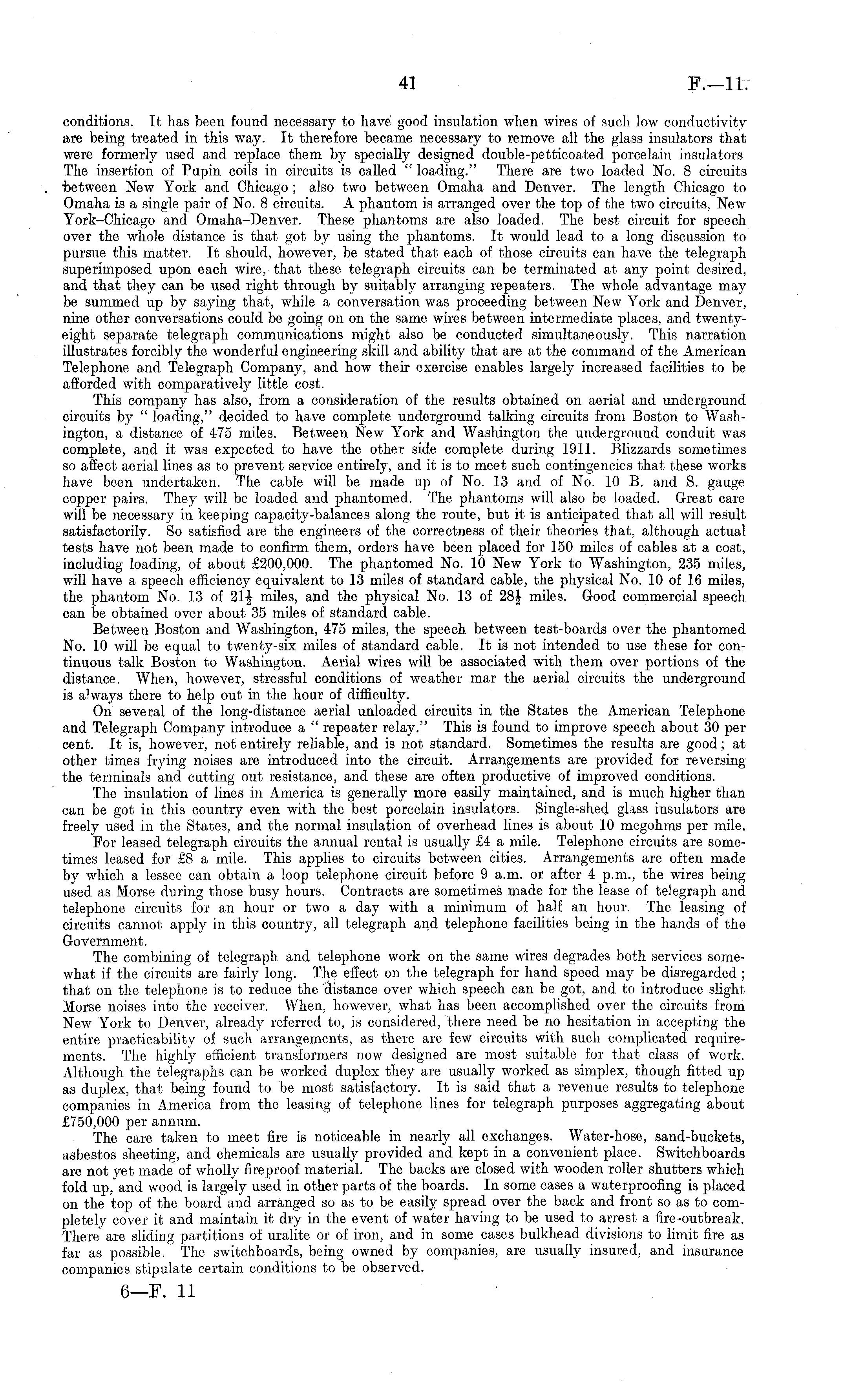 conditions. It has been found necessary to have good insulation when wires of such low conductivity are being treated in this way. It therefore became necessary to remove all the glass insulators that were formerly used and replace them by specially designed double-petticoated porcelain insulators The insertion of Pupin coils in circuits is called " loading." There are two loaded No. 8 circuits between New York and Chicago ; also two between Omaha and Denver. The length Chicago to Omaha is a single pair of No. 8 circuits. A phantom is arranged over the top of the two circuits, New York-Chicago and Omaha-Denver. These phantoms are also loaded. The best circuit for speech over the whole distance is that got by using the phantoms. It would lead to a long discussion to pursue this matter. It should, however, be stated that each of those circuits can have the telegraph superimposed upon each wire, that these telegraph circuits can be terminated at any point desired, and that they can be used right through by suitably arranging repeaters. The whole advantage may be summed up by saying that, while a conversation was proceeding between New York and Denver, nine other conversations could be going on on the same wires between intermediate places, and twentyeight separate telegraph communications might also be conducted simultaneously. This narration illustrates forcibly the wonderful engineering skill and ability that are at the command of the American Telephone and Telegraph Company, and how their exercise enables largely increased facilities to be afforded with comparatively little cost. This company has also, from a consideration of the results obtained on aerial and underground circuits by " loading," decided to have complete underground talking circuits from Boston to Washington, a distance of 475 miles. Between New York and Washington the underground conduit was complete, and it was expected to have the other side complete during 1911. Blizzards sometimes so affect aerial lines as to prevent service entirely, and it is to meet such contingencies that these works have been undertaken. The cable will be made up of No. 13 and of No. 10 B. and S. gauge copper pairs. They will be loaded and phantomed. The phantoms will also be loaded. Great care will be necessary in keeping capacity-balances along the route, but it is anticipated that all will result satisfactorily. So satisfied are the engineers of the correctness of their theories that, although actual tests have not been made to confirm them, orders have been placed for 150 miles of cables at a cost, including loading, of about £200,000. The phantomed No. 10 New York to Washington, 235 miles, will have a speech efficiency equivalent to 13 miles of standard cable, the physical No. 10 of 16 miles, the phantom No. 13 of 2T| miles, and the physical No. 13 of 28J miles. Good commercial speech can be obtained over about 35 miles of standard cable. Between Boston and Washington, 475 miles, the speech between test-boards over the phantomed No. 10 will be equal to twenty-six miles of standard cable. It is not intended to use these for continuous talk Boston to Washington. Aerial wires will be associated with them over portions of the distance. When, however, stressful conditions of weather mar the aerial circuits the underground is always there to help out in the hour of difficulty. On several of the long-distance aerial unloaded circuits in the States the American Telephone and Telegraph Company introduce a " repeater relay." This is found to improve speech about 30 per cent. It is, however, not entirely reliable, and is not standard. Sometimes the results are good; at other times frying noises are introduced into the circuit. Arrangements are provided for reversing the terminals and cutting out resistance, and these are often productive of improved conditions. The insulation of lines in America is generally more easily maintained, and is much higher than can be got in this country even with the best porcelain insulators. Single-shed glass insulators are freely used in the States, and the normal insulation of overhead lines is about 10 megohms per mile. For leased telegraph circuits the annual rental is usually £4 a mile. Telephone circuits are sometimes leased for £8 a mile. This applies to circuits between cities. Arrangements are often made by which a lessee can obtain a loop telephone circuit before 9 a.m. or after 4 p.m., the wires being used as Morse during those busy hours. Contracts are sometimes made for the lease of telegraph and telephone circuits for an hour or two a day with a minimum of half an hour. The leasing of circuits cannot apply in this country, all telegraph and telephone facilities being in the hands of the Government. The combining of telegraph and telephone work on the same wires degrades both services somewhat if the circuits are fairly long. The effect on the telegraph for hand speed may be disregarded ; that on the telephone is to reduce the distance over which speech can be got, and to introduce slight Morse noises into the receiver. When, however, what has been accomplished over the circuits from New York to Denver, already referred to, is considered, there need be no hesitation in accepting the entire practicability of such arrangements, as there are few circuits with such complicated requirements. The highly efficient transformers now designed are most suitable for that class of work. Although the telegraphs can be worked duplex they are usually worked as simplex, though fitted up as duplex, that being found to be most satisfactory. It is said that a revenue results to telephone companies in America from the leasing of telephone lines for telegraph purposes aggregating about £750,000 per annum. The care taken to meet fire is noticeable in nearly all exchanges. Water-hose, sand-buckets, asbestos sheeting, and chemicals are usually provided and kept in a convenient place. Switchboards are not yet made of wholly firep