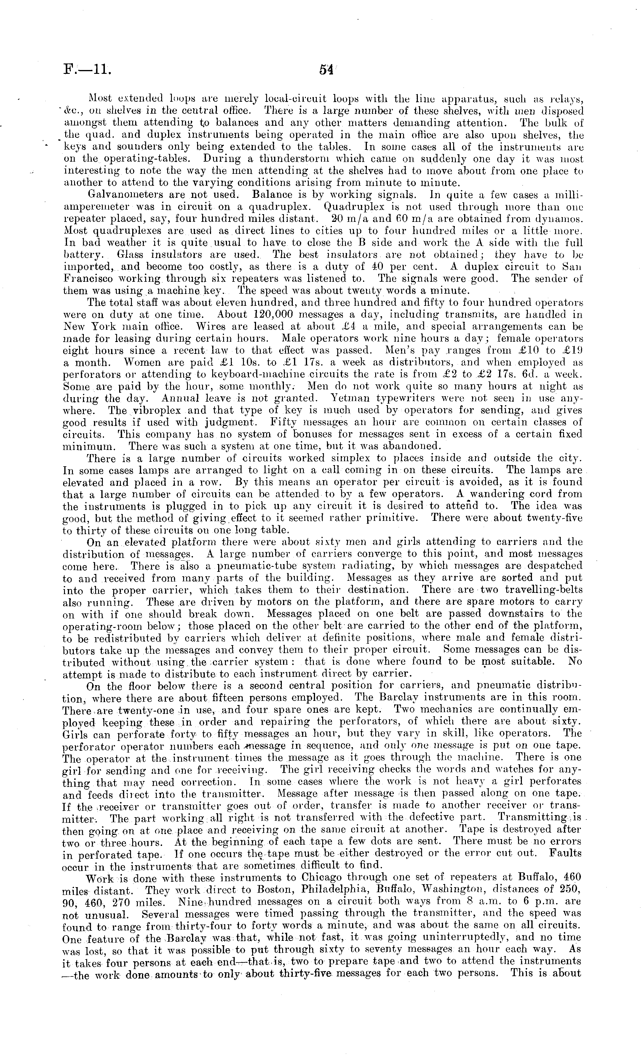 Most extended loops are merely local-circuit loops with the line apparatus, such as relays, &c, on shelves in the central office. There is a large number of these shelves, with men disposed amongst them attending to balances and any other matters demanding attention. The bulk of the quad, and duplex instruments being operated in the main office are also upon shelves, the keys and sounders only being extended to the tables. In some cases all of the instruments are on the operating-tables. During a thunderstorm which came on suddenly one day it was most interesting to note the way the men attending at the shelves had to move about from one place to another to attend to the varying conditions arising from minute to minute. Galvanometers are not used. Balance is by working signals. In quite a few cases a milliamperemeter was in circuit on a quadruplex. Quadruples is not used through more than one repeater placed, say, four hundred miles distant. 20 in/a and 60 m/a are obtained from dynamos. Most quadrupleses are used as direct lines to cities up to four hundred miles or a little more. In bad weather it is quite usual to have to close the B side and work the A side with the full battery. Glass insulators are used. The best insulators are not obtained; they have to be imported, and become too costly, as there is a duty of 40 per cent. A duples circuit to San Francisco working through sis repeaters was listened to. The signals were good. The sender of them was using a machine key. The speed was about twenty words a minute. The total staff was about eleven hundred, and three hundred and fifty to four hundred operators were on duty at one time. About 120,000 messages a day, including transmits, are handled in New York main office. Wires are leased at about £4 a mile, and special arrangements can be made for leasing during certain hours. Male operators work nine hours a day; female operators eight hours since a recent law to that effect was passed. Men's pay ranges from £10 to £19 a month. Women are paid £1 10s. to £1 17s. a week as distributors, and when employed as perforators or attending to keyboard-machine circuits the rate is from £2 to £2 17s. 6d. a week. Some are paid by the hour, some monthly. Men do not work quite so many hours at night as during the day. Annual leave is not granted. Yetman typewriters were not seen in use anywhere. The vibroplex and that type of key is much used by operators for sending, and gives good results if used with judgment. Fifty messages an horn- are common on certain classes of circuits. This company has no system of bonuses for messages sent in excess of a certain fixed minimum. There was such a system at one time, but it was abandoned. There is a large number of circuits worked simplex to places inside and outside the city. In some cases lamps are arranged to light on a call coming in on these circuits. The lamps are elevated and placed in a row. By this means an operator per circuit is avoided, as it is found that a large number of circuits can be attended to by a few operators. A wandering cord from the instruments is plugged in to pick up any circuit it is desired to attend to. The idea was good, but the method of giving effect to it seemed rather primitive. There were about twenty-five to thirty of these circuits on one long table. On an elevated platform there were about sixty men and girls attending to carriers and the distribution of messages. A large number of carriers converge to this point, and most messages come here. There is also a pneumatic-tube system radiating, by which messages are despatched to and received from many parts of the building. Messages as they arrive are sorted and put into the proper carrier, which takes them to their destination. There are two travelling-belts also running. These are driven by motors on the platform, and there are spare motors to carry on with if one should break down. Messages placed on one belt are passed downstairs to the operating-room below; those placed on the other belt are carried to the other end of the platform, to be redistributed by carriers which deliver at definite positions, where male and female distributors take up the messages and convey them to their proper circuit. Some messages can be distributed without using the carrier system : that is done where found to be most suitable. No attempt is made to distribute to each instrument direct by carrier. On the floor below there is a second central position for carriers, and pneumatic distribution, where there are about fifteen persons employed. The Barclay instruments are in this room. There are twenty-one in use, and four spare ones are kept. Two mechanics are continually employed keeping these in order- and repairing the perforators, of which there are about sixty. Girls can perforate forty to fifty messages an hour, but they vary in skill, like operators. The perforator operator numbers each .message in sequence, and only one message is put on one tape. The operator at the instrument times the message as it goes through tin.' machine. There is one girl for sending and one for receiving, The girl receiving checks the words and watches for anything that may need correction. In some cases where the work is not heavy a girl perforates and feeds direct into the transmitter. Message after message is then passed along on one tape. If the receiver or- transmitter goes out of order, transfer is made to another receiver or transmitter. The part working all right is not transferred with the defective part. Transmitting is then going on at one place and receiving on the same circuit at another. Tape is destroyed after two or three hours. At the beginning of each tape a few dots are sent. There must be no errors in perforated tape. If one occurs the tape must be either destroyed or the error cut out. Faults occur in the instruments that are sometimes difficult to find. Work is done with these instruments to Chicago through one set of repeaters at B