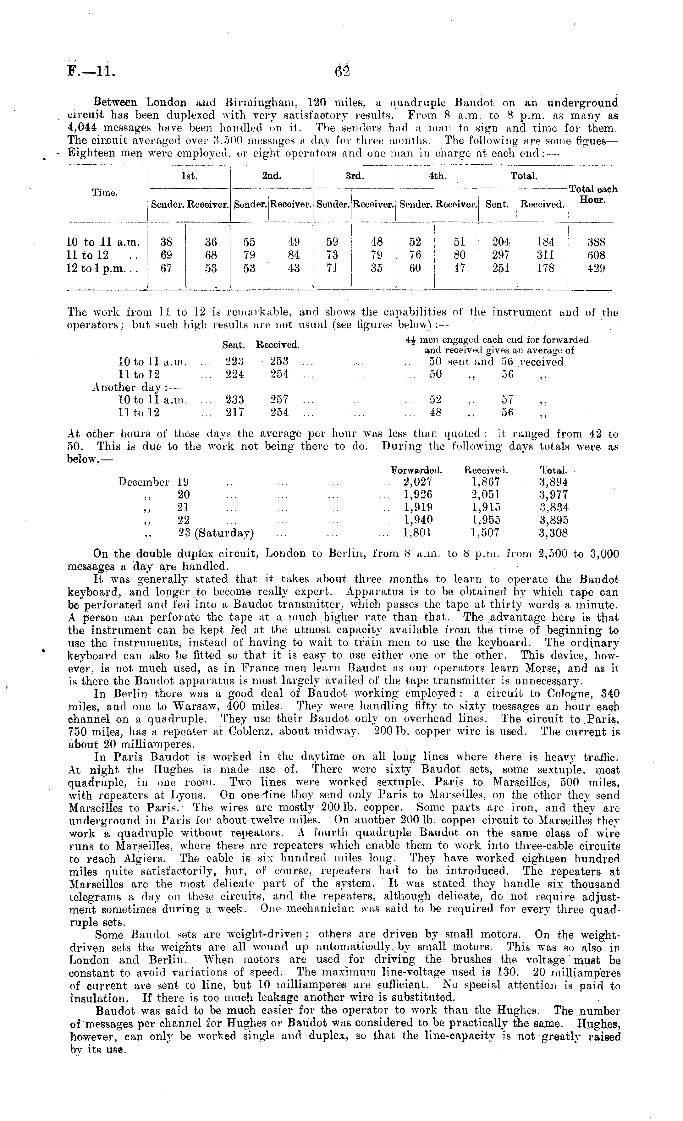 Between London and Birmingham. 120 miles, a quadruple Baudot on an underground circuit has been duplexed with very satisfactory results. From 8 a.m. to 8 p.m. as many as 4,044 messages have been handled on it. The senders had a man to sign and time for them. The circuit averaged over 3.500 messages a day for three months, The following are some figues— Eighteen men were employed, or eight operators and one man in charge at each end:- —