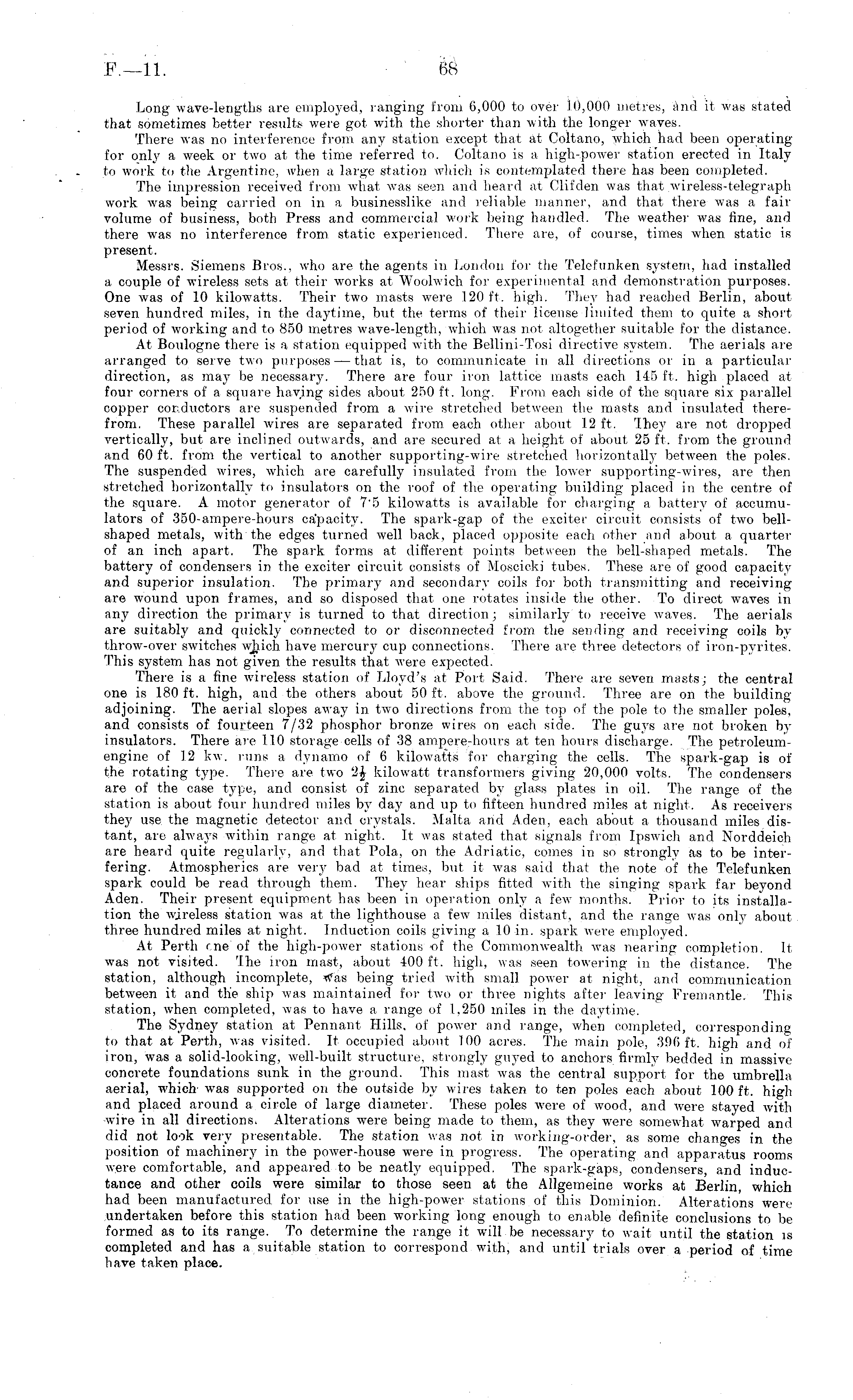 Long wave-lengths are employed, ranging from 6,000 to over 10,000 metres, and it was stated that sometimes better results were got with the shorter than with the longer waves. There was no interference from any station except that at Coltano, which had been operating for only a w 7 eek or two at the time referred to. Coltano is a high-power station erected in Italy to work to the Argentine, when a large station which is contemplated there has been completed. The impression received from what was seen and heard at Clifden was that wireless-telegraph work was being carried on in a businesslike and reliable manner, and that there was a fair volume of business, both Press and commercial work being handled. The weather was fine, and there was no interference from static experienced. There are, of course, times wiien static is present. Messrs. Siemens Bros., who are the agents in London for the Telefunken system, had installed a couple of wireless sets at their works at Woolwich for experimental and demonstration purposes. One was of 10 kilowatts. Their two masts were 120 ft. high. They had reached Berlin, about seven hundred miles, in the daytime, but the terms of their license limited them to quite a short period of working and to 850 metres wave-length, which was not altogether suitable for the distance. At Boulogne there is a station equipped with the Bellini-Tosi directive system. The aerials are arranged to serve two purposes — that is, to communicate in all directions or in a particular direction, as may be necessary. There are four iron lattice masts each 145 ft. high placed at four corners of a square haying sides about 250 ft. long. From each side of the square six parallel copper conductors are suspended from a wire stretched between the masts and insulated therefrom. These parallel wires are separated from, each other about 12 ft. They- are not dropped vertically, but are inclined outwards, and are secured at a height of about 25 ft. from the ground and 60 ft. from the vertical to another supporting-wire stretched horizontally- between the poles. The suspended wires, which are carefully insulated from the lower supporting-wires, are then stretched horizontally- to insulators on the roof of the operating building placed in the centre of the square. A motor generator of 75 kilowatts is available for charging a battery of accumulators of 350-ampere-hours capacity. The spark-gap of the exciter circuit consists of two bellshaped metals, with the edges turned well back, placed opposite each other and about a quarter of an inch apart. The spark forms at different points between the bell-shaped metals. The battery of condensers in the exciter circuit consists of Moscicki tubes. These are of good capacity and superior insulation. The primary 7 and secondary- coils for both transmitting and receiving are wound upon frames, and so disposed that one rotates inside the other. To direct waves in any direction the primary is turned to that direction; similarly to receive waves. The aerials are suitably and quickly- connected to or disconnected from the sending and receiving coils by throw-over switches which have mercury cup connections. There are three detectors of iron-pyrites. This system has not given the results that were expected. There is a fine wireless station of Lloyd's at Port Said. There are seven masts; the central one is 180 ft. high, and the others about 50 ft. above the ground. Three are on the buildingadjoining. The aerial slopes away in two directions from the top of the pole to the smaller poles, and consists of fourteen 7/32 phosphor bronze wires on each side. The guys are not broken byinsulators. There are 110 storage cells of 38 ampere-hours at ten hours discharge. The petroleumengine of 12 kw. runs a dynamo of 6 kilowatts for charging the cells. The spark-gap is of the rotating type. There are two 2|- kilowatt transformers giving 20,000 volts. The condensers are of the case type, and consist of zinc separated by glass plates in oil. The range of the station is about four hundred miles by day and up to fifteen hundred miles at night. As receivers they 7 use the magnetic detector and crystals. Malta and Aden, each about a thousand miles distant, are always within range at night. It was stated that signals from Ipswich and Norddeich are heard quite regularly, and that Pola, on the Adriatic, comes in so strongly as to be interfering. Atmospherics are very bad at times, but it was said that the note of the Telefunken spark could be read through them. They hear ships fitted with the singing spark far beyond Aden. Their present equipment has been in operation only a few months. Prior to its installation the wireless station w 7 as at the lighthouse a few miles distant, and the range was only about three hundred miles at night. Induction coils giving alO in. spark were employed. At Perth one of the high-power stations -of the Commonwealth was Hearing completion. It was not visited. The iron mast, about 4.00 ft. high, was seen towering in the distance. The station, although incomplete, Was being tried with small power at night, and communication between it and the ship was maintained for two or three nights after leaving Fremantle. This station, when completed, was to have a range of 1.250 miles in the daytime. The Sydney station at Pennant Hills, of power and range, when completed, corresponding to that at Perth, was visited. It occupied about 100 acres. The main pole, 396 ft. high and of iron, was a solid-looking, well-built structure, strongly guyed to anchors firmly bedded in massive concrete foundations sunk in the ground. This mast was the central support for the umbrella aerial, which was supported on the outside by wires taken to ten poles each about 100 ft. high and placed around a circle of large diameter. These poles were of wood, and w-ere stayed with wire in all directions. Alterations were being made to them, as they were somewhat warped and did not look very present