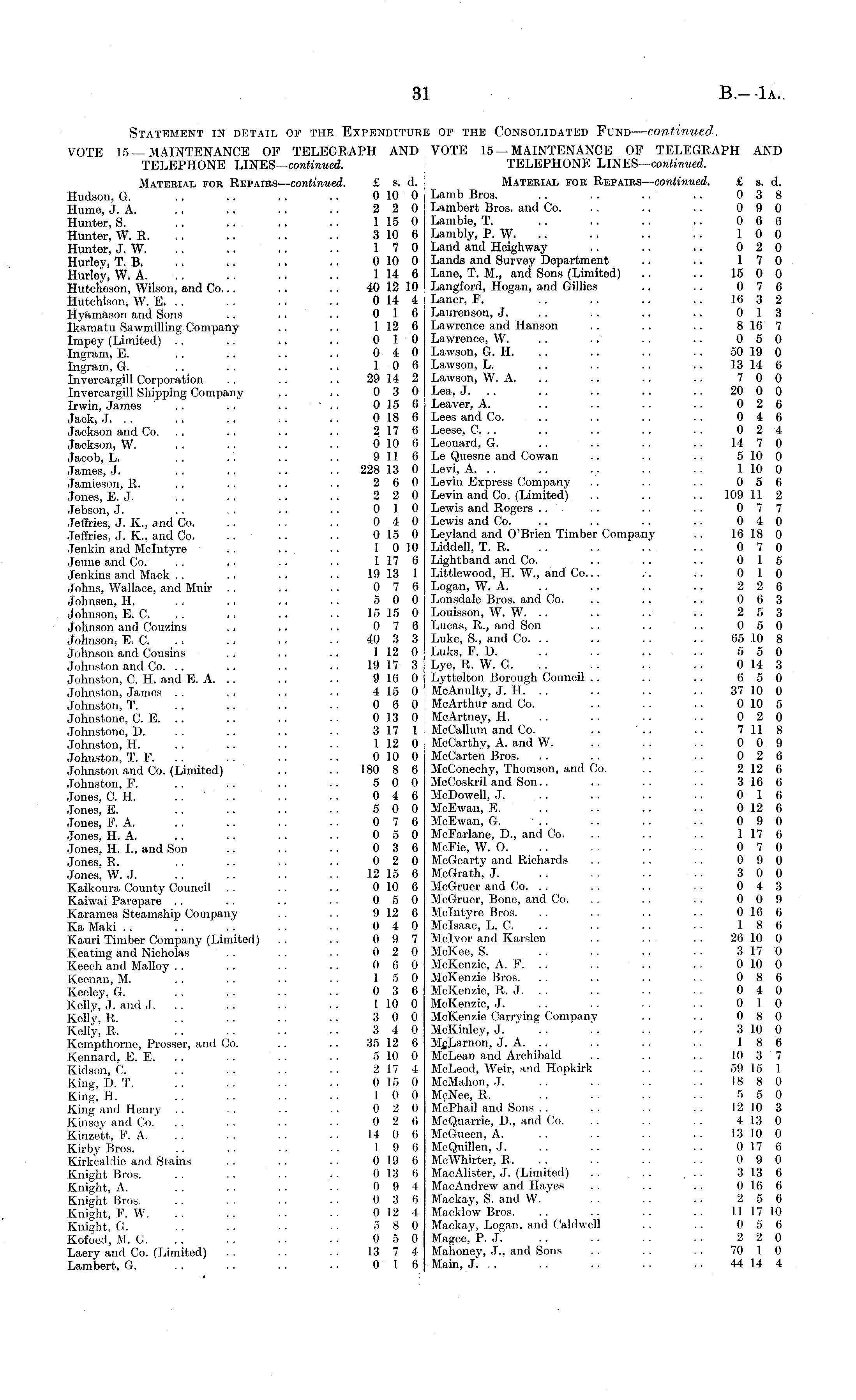 Statement in detail of the Expenditure of the Consolidated Fund — continued. VOTE IS — MAINTENANCE OF TELEGRAPH AND VOTE 15 —MAINTENANCE OF TELEGRAPH AND TELEPHONE LlNES— continued. TELEPHONE LlNES— continued. Material for Repairs— continued. £ s. d. : Material fok Repairs— continued. £ s. d. Hudson. G. .. .. . . .. 010 0 j Lamb Bros. .. . . .. .. 0 3 8 Hume, j. A. .. . . .. .. 2 2 0 | Lambert Bros, and Co. .. .. .. 0 9 0 Hunter, S. . . .. .. .. 115 0 Lambie, T. .. .. .. .. 0 6 6 Hunter, W. R. . . 3 10 6 Lambly, P. W 10 0 Hunter, J. W. .. .. .. .. 17 0 Land and Heighway .. .. .. 0 2 0 Hurley, T. B. . . .. .. .. 010 0 Lands and Survey Department .. .. 17 0 Hurley, W. A. . . .. .. .. 1 14 6 Lane, T. M., and Sons (Limited) .. .. 15 0 0 Hutcheson, Wilson, and Co.. . .. .. 40 12 10 Langford, Hogan, and Gillies .. .. 0 7 6 Hutchison, W. E. .. .. .. .. 0 14 4 Laner, F. .. .. .. .. 16 3 2 Hyamason and Sons .. .. .. 0 16 Laurenson, J. .. .. .. .. 0 13 Ikaniatu Sawmilling Company .. .. 112 6 Lawrence and Hanson .. .. .. 816 7 Impoy (Limited) .. .. .. .. 0 10 Lawrence, W. . . .. .. .. 0 5 0 Ingram, E. .. .. .. .. 0 4 0 Lawson, G. H. .. .. .. .. 50 19 0 Ingram, G. .. . . .. .. 10 6 Lawson, L. .. .. .. .. 13 14 6 Invei-cargill Corporation . . .. . . 29 14 2 Lawson, W. A. .. .. .. 7 0 0 Invercargill Shipping Company .. .. 0 3 0 Lea, J. .. .. .. .. 20 0 0 Irwin, James ' .. .. • .. 015 6 Leaver, A. .. .. .. .. 0 2 6 Jack, J. .. .. .. .. 018 6 Lees and Co. .. .. .. .. 0 4 6 Jackson and Co. . . .. .. . . 217 6 Leese, C. .. .. .. .. .. 0 2 4 Jackson, W. . . . . .. .. 010 6 Leonard, G. .. .. .. .. 14 7 0 Jacob, L. . .. • • •. 911 6 Le Quesne and Cowan .. .. .. 510 0 James, J. ~ .. .. .. 228 13 0 Levi, A. .. .. .. .. .. 110 0 Jamieson, R. .. .. .. .. 2 6 0 Levin Express Company .. .. . . 0 5 6 Jones, E. J. .. .. .. .. 2 2 0 Levin and Co. (Limited) .. .. .. 109 11 2 Jebson, J. .. . . . . •. 0 10 Lewis and Rogers .. .. .. .. 0 7 7 Jeffries, J. X., and Co. . . .. .. 0 4 0 Lewis and Co. .. .. .. .. 0 4 0 Jeffries, J. X.. and Co. . . .. .. 015 0 Leyland and O'Brien Timber Company .. 16 18 0 Jenkin and Mclntyre . . .. . . 10 10 Liddell, T. R. .. .. .. .. 0 7 0 Jeune and Co. .. . . .. . . 117 6 Lightband and Co. .. .. . . 0 15 Jenkins and Mack .. .. .. ■ . 19 13 1 Littlewood, H. W., and C 0... .. .. 0 10 Johns, Wallace, and Muir . . ~ .. 0 7 6 Logan, W. A. .. .. .. .. 2 2 6 Johnsen H. . ■ ~ ~ . . 5 0 0 Lonsdale Bros, and Co. .. .. .. 0 6 3 Johnson, E. C. .. , . .. .. 15 15 0 Louisson, W. W. .. .. .. .. 2 5 3 Johnson and Couzins .. ~ .. 0 7 6 Lucas, R., and Son .. .. .. 0 5 0 Johnson, E. C, .. .. .. • • 40 3 3 Luke, S., and Co. .. .. .. .. 65 10 8 Johnson and Cousins .. .. .. 112 0 Luks, F. D. .. .. .. .. 5 5 0 Johnston and Co . . .. 19 17 3 Lye, R. W. G. . . .. .. .. 0 14 3 Johnston, C. H. and E. A. .. ~ .. 9 16 0 Lyttclton Borough Council .. .. . . 6 5 0 Johnston, James . . .. .. . . 4 15 0 McAnulty, J. H. . . .. .. . . 37 10 0 Johnston, T. . . .. .'. • • 0 6 0 I McArthur and Co. .. .. .. 010 5 Johnstone, C. E. .. .. .. .. 013 0 McArtney, H. .. . . .. .. 0 2 0 Johnstone, D. .. .. .. ■• 3 17 1 McCallum and Co. .. '.. .. 7 11 8 Johnston, H. .. .. .. .. 112 0 McCarthy, A. and W. .. .. .. 0 0 9 Johnston, T. F. .. .. .. .. 010 0 McCarten Bros. .. .. .. .. 0 2 6 Johnston and Co. (Limited) .. .. 180 8 6 McConechy, Thomson, and Co. .. .. 212 6 Johnston, F. .. .. .. •• 5 0 0 MeCoskril and Son.. .. .. .. 3 16 6 Jones, C. H. .. . . .. .. 0 4 6 McDowell, J. .. .. .. .. 0 16 Jones, E. .. .. .. ■ • 5 0 0 McEwan, E. .. . . .. .. 012 6 Jones, F. A. . . .. .. .. 0 7 6 McEwan, G. ■ .. .. .. .. 0 9 0 Jones, H. A. .. . . .. .. 0 5 0 McFarlane, D., and Co. .. .. .. 1 17 6 Jones, H. 1., and Son .. .. .. 0 3 6 McFie, W. O. .. . . .. .. 0 7 0 Jones, R. .. .. .. .. 0 2 0 McGearty and Richards .. .. . . 0 9 0 Jones, W. J. .. . • • • ■ • 12 15 6 McGrath, J. .. .. .. .. 3 0 0 Kaikoura County Council . . .. .. 0 10 6 McGruer and Co. .. .. .. .. 0 4 3 Kaiwai Parepare . . . . .. .. 0 5 0 McGruer, Bone, and Co. .. . . .. 0 0 9 Karamea Steamship Company .. . . 0 12 6 Mclntyre Bros. . . . . .. .. 016 6 Ka Maki .. .. .'. .. .. 0 4 0 Mclsaac, L. C. .. .. .. .. 18 6 Kauri Timber Company (Limited) .. .. 0 9 7 Mclvor and Karslen . . .. . . 26 10 0 Keating and Nicholas ' . . .. . . 0 2 0 McKee, S. .. .. .. ■ ■ 317 0 Keech and Malloy . ... .. .. 0 6 0 McKenzie, A. F. .. . . .. .. 010 0 Keenan, M. .. .. • • ■ ■ 15 0 McKenzie Bros. .. . . .. .. 0 8 6 Keeley, G. .. .. .. .. 0 3 6 McKenzie, R. J. .. . . .. .. 0 4 0 Kelly, J. and .I. .. .. .. •• 110 0 McKenzie, J. .. .. .. .. 0 10 Kelly, H. .. .. . . .. 3 0 0 McKenzie Carrying Company ■ . . . 0 8 0 Kelly, R. .. .. . . • ■ 3 4 0 McKinley, J. .. .. .. 310 0 Kempthornc, Prosaer, and Co. .. .. 35 12 6 McLarnon, J. A. .. . . . . .. 18 6 Kennard, E. E. . . .. . • ■ ■ 5 10 0 McLean and Archibald . . .. .. 10 3 7 Kidson, C. .. .. •■ ■• 2174 McLeod, Weir, and Hopkirk .. .. 59 15 1 King, D. T. .. .. .. .. 0 15 0 McMahon, J. .. .. .. .. 1880 King, H. .. .. .. ■• 10 0 McNee, R. .. .. .. .. 5 5 0 King and Henry .. .. .. •■ 0 2 0 McPhail and Sons .. .. .. .. 12 10 3 Kinsey and Co.' . . .. .. .. 02 6 McQuarrie, D., and Co. . . .. .. 413 0 Kinzett, F. A. .. .. .. .. 14 0 6 McGueen, A. .. .. .. .. 13 10 0 Kirby Bros. . . . . .. .. 10 6 McQuillen, J. . . .. . . . . 0 17 6 Kirkcaldie and Stains . . .. .. 0 19 6 McWhirter, R. . . . . .. . . 0 9 0 Knight Bros. .. .. .. .. 013 6 MacAlister, J. (Limited) .. .. ... 313 6 Knight, A. . . . . . . .. 0 9 4 Mac Andrew and Hayes . . .. .. 0 16 6 Knight Bros. .. . . .. • • 03 6 Mackay, S. and W. '... . .. 25 6 Knight, F. W. .. .. .. .: 012 4 Macklow Bros. .. .. .. .. I] 17 10 Knight G. .. . ■ ■ . • ■ 5 8 0 Mackay, Logan, and Caldwell .. .. 0 5 6 Kof'ocd, M. G. .. . . .. • • 0 5 0 Magee, P. J. .. .. .. .. 2 2 0 Laery and Co. (Limited) . . . . . . 13 7 4 Mahoney, J., and 