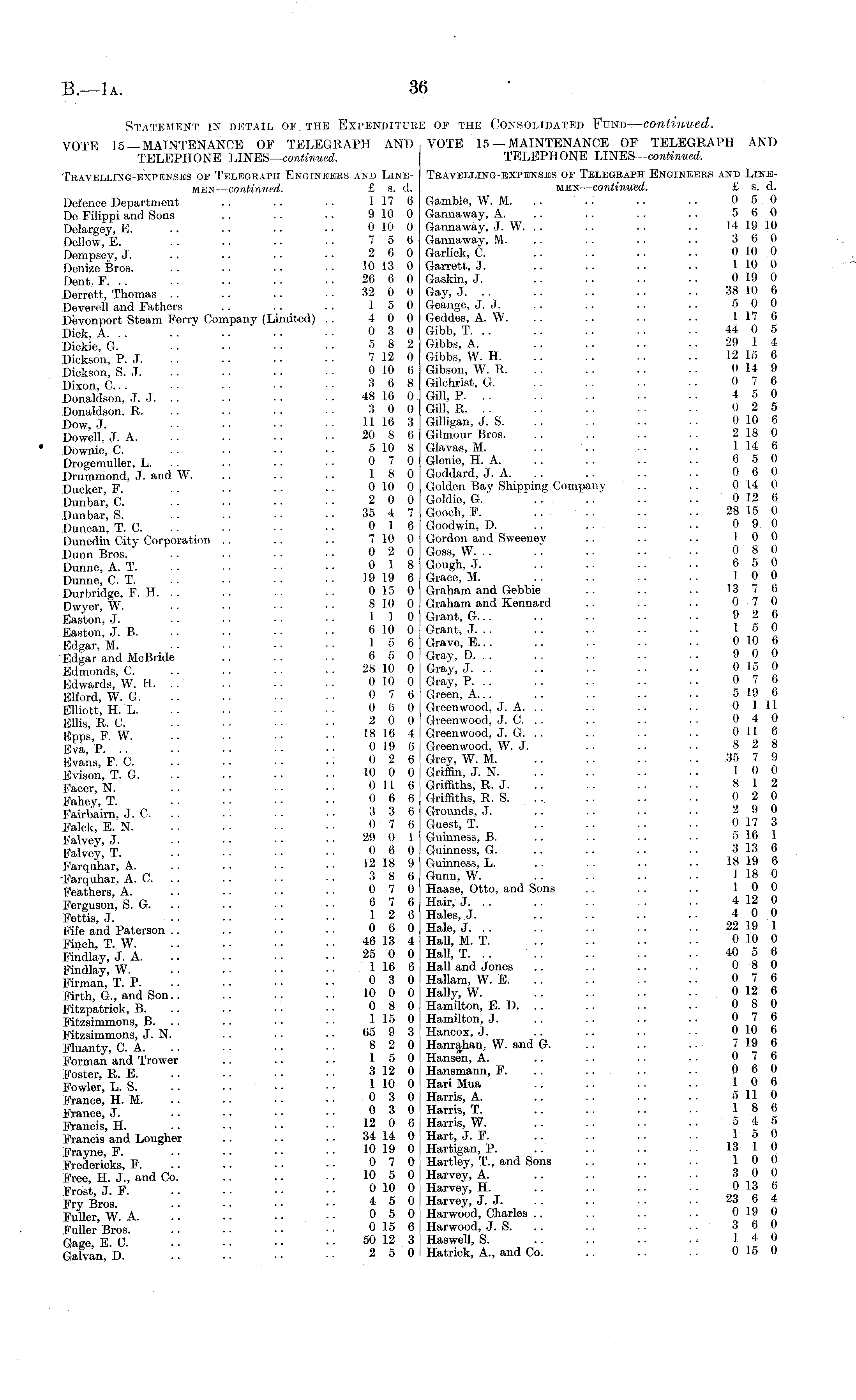 Statement in detail of the Expenditure of the Consolidated Fund — continued. VOTE 15 — MAINTENANCE OF TELEGRAPH AND VOTE Ir> — MAINTENANCE OF TELEGRAPH AND TELEPHONE LlNES— continued. TELEPHONE LlNES— continued. Travelling-expenses of Telegraph Engineers and Line- Travelling-expenses of Telegraph Engineers and Linemen—continued. £ s. d. men— continued. £ s. d. Defence Department .. .. .. 117 6 Gamble, W. M. .. .. .. .. 050 De Filippi and Sons .. .. .. 910 0 Gannaway, A. .. .. .. .. 5 6 0 Delargey, E. .. .. .. • ■ 0 10 0 Gannaway, J. W. .. .. .. .. 14 19 10 Dellow E. .. • • • • • • 7 5 0 Gannaway, M. .. . . .. .. 3 6 0 Dempsey, J. .. • • • • • • 26 0 Garliek, C. .. . . .. .. 010 0 Denizeßros. .. .. .. •• 10 13 0 Garrett, J. .. .. .. .. 110 0 Dent F .. .. • ■ 26 6 0 Gaskin, J. .. .. .. .. 019 0 Derrett, Thomas 32 0 0 Gay, J 38 10 6 Deverell and Fathers .. .. .. 15 0 Geange, J. J. .. .. .. .. 5 0 0 Devonport Steam Ferry Company (Limited) . . 4 0 0 Geddes, A. W. .. .. .. .. 117 6 Dick A ...... • ■ 030 Gibb, T 44 0 5 Dickie, G. 5 8 2 Gibbs, A. .. .. .. 29 1 4 Dickson, P. J V 12 0 Gibbs, W. H 12 15 6 Dickson, S. J. .. 0 10 6 Gibson, W. R. . . 0 14 9 Dixon C ■ ■ ..308 Gilchrist, G. . . . . .. . . 076 Donaldson, J. J 48 16 0 Gill, P + » « Donaldson, R 3 0 0 Gill, R 0 2 5 Dow J .. • • ■ • ■ ■ 11 16 3 Gilligan, J. S. . . .. .. .. 010 6 Dowell J A . .. .. • • 20 8 6 Gilmour Bros. .. .. .. .. 218 0 Downie, C. . . .. ■■ ■■ 510 8 Glavas, M. .. .. ~ .. 114 6 Drogemuller, L. .. .. .. • • 0 7 0 Glenie, H. A. .. . . .. .. 6 5 0 Drummond, J. and W. .. .. .. 18 0 Goddard, J. A. .. . . .. 0 6 0 Ducker F • ■ • • - • 010 0 Golden Bay Shipping Company .. .. 014 0 Dunbar' C. .. .. • • • • 2 0 0 Goldie, G. . . .. .. .. 012 6 Dunbar, S 35 4 7 Gooch, F. .. 28 15 0 Duncan, T. C. .. .. ■ • • • 0 16 Goodwin, D. .. .. 09 0 Dunedin City Corporation . . .. .. 710 0 Gordon and Sweeney .. .. .. 10 0 Dunn Bros. ' 0 2 0 Goss, W 0 8 0 Dunne, A. T 0 18 Gough, J. 6 5 0 Dunne, C. T 19 19 6 Grace, M. 10 0 Durbridge, F. H. . . . . • ■ • • 015 0 Graham and Gebbie . . .. .. 13 / b Dwver w' • ■ ■ • ■ • 810 0 Graham and Kennard .. . . .. 07 0 Barton, J. 110 Grant, G 9 2 6 Eastern! J. B 6 10 0 Grant, J 15 0 Edgar M .. •■ ■■ • • 156 Grave, E.. . .. .. . . . ■ 010 b Edgar'and Mcßride 05 0 Gray, D 90 0 Edmonds, C 28 10 0 Gray, J 0 15 0 Edwards, W. H 0 10 0 Gray, P 0 "7 6 Elford, W. G. .. •• ■• •■ 0 7 6 Green, A... .. .. .. •• 5 19 fa Elliott' H L . • ■ ■ • • 0 0 0 Greenwood, J. A. . . .. .. .. 0 111 Ellis R. 6. .. ■ • ■ ■ ■ ■ 20 0 Greenwood, J. C. .. .. .. .. 04 0 Eons F W ■ • 18 16 4 Greenwood, J. G. . . . . .. .. 0 116 Eva P." ' " •■ •• 019 6 Greenwood, W. J. .. .. .. 8 2 8 Evans/F. C. .. 0 2 6 Grey, W. M 35 7 9 Evison, T. G 10 0 0 Griffin, J. N 10 0 Facer N • ■ ..0116 Griffiths, R. J. .. . . .. .. 812 Fahey T . . ■ ■ ..066 Griffiths, R. S. .. . . .. .. 020 Fairbairn, J. C 3 3 6 Grounds, J 2 9 0 Falck, E. N 0 7 6 Guest, T. 0 17 3 Falvey J •. • ■ 29 0 1 Guinness, B. .. . . .. .. 516 1 Falvev T • • ..060 Guinness, G. .. .. .. • • 313 6 Farquhar,'A 12 18 9 Guinness, L 18 19 6 -Farquhar, A. C 3 8 6 Gunn, W. 18 0 Feathers A • • ..070 Haase, Otto, and Sons . . . . .. 100 Ferguson, S. G. 6 7 6 Hair, J 4 12 0 Fettis, J. 12 6 Hales, J. 4 0 0 Fife and Paterson .. 060 Hale, J 22 19 1 Finch T W . • ■ .. 46 13 4 Hall, M. T. .. .. .. .. 010 0 Findlay/j. A. .. 25 0 0 Hall, T 40 5 6 Findlav W • • .. 1 16 6 Hall and Jones .. .. .. .. 0 8 0 Firman,' T. P. '.'. 03 0 Hallam, W. E 07 6 Firth, G., and Son 10 0 0 Hally, W. 0 12 6 Fitzpatrick, B • ■■ 0 8 0 Hamilton, E. D 0 8 0 Fitzsimmons, B. .. .. • ■ • • 115 0 Hamilton, J. .. . . .. .. 0 7 b Fitzsimmons, J. N. 65 9 3 Hancox, J. 0 10 6 Fluanty, C. A. .. .. . • • • 82 0 Hanrahan, W. and G. .. .. .. ■719 6 Forman and Trower .. .. .. 15 0 Hansen, A. .. .. .. .. » ' 6 Foster RE .. .. • • • • 312 0 Hansmann, F. .. .. .. .. 0 6 0 Fowler, L. S 1 10 0 Hari Mua 10 6 France, H. M 0 3 0 Harris, A. 5 11 0 France, J 0 3 0 Harris, T 18 6 Francis, H 12 0 6 Harris, W 5 4 5 Francis and Lougher 34 14 0 Hart, J. F. 1 t> 0 Frayne, F 10 19 0 Hartigan, P 13 1 0 Fredericks F .. •• •• 0 7 0 Hartley, T., and Sons .. .. .. 10 0 Free, H. J., and Co 10 5 0 Harvey, A 3 0 0 Frost, J. F 0 10 0 Harvey, H ' JW Bros .. ■ ■ • • 4 5 0 Harvey, J. J. .. .. .. • • 23 6 4 Fuller W A. .. .. • • • ■ 0 5 0 Harwood, Charles .. .. .. .. 019 0 Fuller' Bros. .. .. •• ■• 015 6 Harwood, J. S. .. .. .. .. 3 6 0 Ga ge EC 50 12 3 Haswel], S. .. . . .. • ■ 14 0 Galvan, D. • • ..250 Hatrick, A., and Co. .. .. .. 0 15 0
