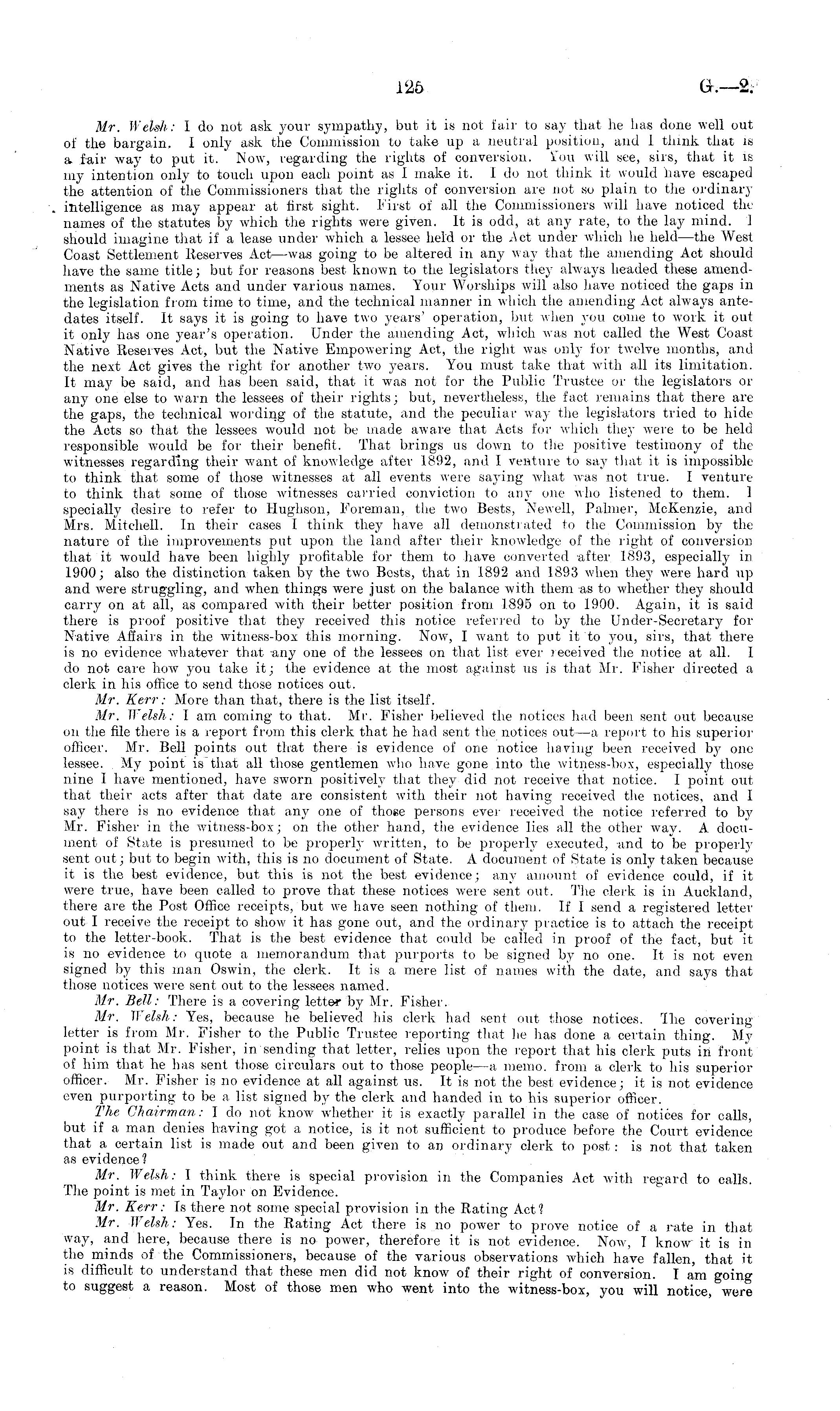Mr. Welsh: I do not ask your sympathy, but it is not fair to say that lie lias done well out of the bargain, I only ask the Commission to take up a neutral position, and I tiiink that is a fair way to put it. Now, regarding the rights of conversion. You will see, sirs, that it is my intention only to touch upon each point as 1 make it. Ido not think it. would have escaped the attention of the Commissioners that the rights of conversion are not so plain to the ordinary intelligence as may appear at first sight. First of all the Commissioners will have noticed the names of the statutes by which the rights were given. It is odd, at any rate, to the lay mind. 1 should imagine that if a lease under which a lessee held or the -Act under which lie held —the West Coast Settlement Reserves Act—was going to be altered in any way that the amending Act should have the same title; but for reasons best known to the legislators they always headed these amendments as Native Acts and under various names. Your Worships will also have noticed the gaps in the legislation from time to time, and the technical manner in which the amending Act always antedates itself. It says it is going to have two years' operation, but when you come to work it out it only has one year's operation. Under the amending Act, which was not called the West Coast Native Reserves Act, but the Native Empowering Act, the right was only for twelve months, and the next Act gives the right for another two years. You must take that with all its limitation. It ma}- be said, and has been said, that it was not for the Public Trustee or the legislators or any one else to warn the lessees of their rights; but, nevertheless, the fact remains that there are the gaps, the technical wording of the statute, and the peculiar way the legislators tried to hide the Acts so that the lessees would not be made aware that Acts for which they were to be held responsible would be for their benefit. That brings us down to the positive testimony of the witnesses regarding their want of knowledge after 1892, and I vesture to say that it is impossible to think that some of those witnesses at all events were saying what was not true. I venture to think that some of those witnesses carried conviction to any one who listened to them. 1 specially desire to refer to Hughson, Foreman, the two Bests, Newell, Palmer, McKenzie, and Mrs. Mitchell. In their cases I think they have all demonsti ated to the Commission by the nature of the improvements put upon the land after their knowledge of the right of conversion that it would have been highly profitable for them to have converted after 1893, especially in 1900; also the distinction taken by the two Bests, that in 1892 and 1893 when they were hard up and were struggling, and when things were just on the balance with them as to whether they should cany on at all, as compared with their better position from 1895 on to 1900. Again, it is said there is proof positive that the} - received this notice referred to by the Under-Secretary for Native Affairs in the witness-box this morning. Now, I want to put it to you, sirs, that there is no evidence whatever that any one of the lessees on that list ever i eceived the notice at all. I do not care how you take it; the evidence at the most against us is that Mr. Fisher directed a clerk in his office to send those notices out. Mr. Kerr: More than that, there is the list itself. Mr. Welsh: I am coming to that. Mr. Fisher believed the notices had been sent out because on the file there is a report from this clerk that he had sent the notices out —a report to his superior officer. Mr. Bell points out that there is evidence of one notice having been received by one lessee. My point is that all those gentlemen who have gone into the witness-box, especially those nine ] have mentioned, have sworn positively that they did not receive that notice. I point out that their acts after that date are consistent with their not having received the notices, and I say there is no evidence that any one of those persons ever received the notice referred to by Mr. Fisher in the witness-box; on the other hand, the evidence lies all the other way. A document of State is presumed to be properly written, to be properly executed, and to be properly sent out; but to begin with, this is no document of State. A document of State is only taken because it is the best evidence, but this is not the best evidence; any amount of evidence could, if it were true, have been called to prove that these notices were sent out. The clerk is in Auckland, there are the Post Office receipts, but we have seen nothing of them. If 1 send a registered letter out I receive the receipt to show it has gone out, and the ordinary practice is to attach the receipt to the letter-book. That is the best evidence that could be called in proof of the fact, but it is no evidence to quote a memorandum that purports to be signed by no one. It is not even signed by this man Oswin, the clerk. It is a mere list of names with the date, and says that those notices were sent out to the lessees named. Mr. Bell: There is a covering letter by Mr. Fisher. Mr. Welsh: Yes, because he believed his clerk had sent out those notices. The coveringletter is from Mr. Fisher to the Public Trustee reporting that lie has done a certain tiling. My point is that Mr. Fisher, in sending that letter, relies upon the report that his clerk puts in front of him that he has sent those circulars out to those people—a memo, from a clerk to his superior officer. Mr. Fisher is no evidence at all against us. It is not the best evidence; it is not evidence even purporting to be a list signed by the clerk and handed in to his superior officer. The Chairman: T do not know whether it is exactly parallel in the case of notices for calls, but if a man denies having got a notice, is it not sufficient to produce before the Court evidence that a certain list is made out and been giv