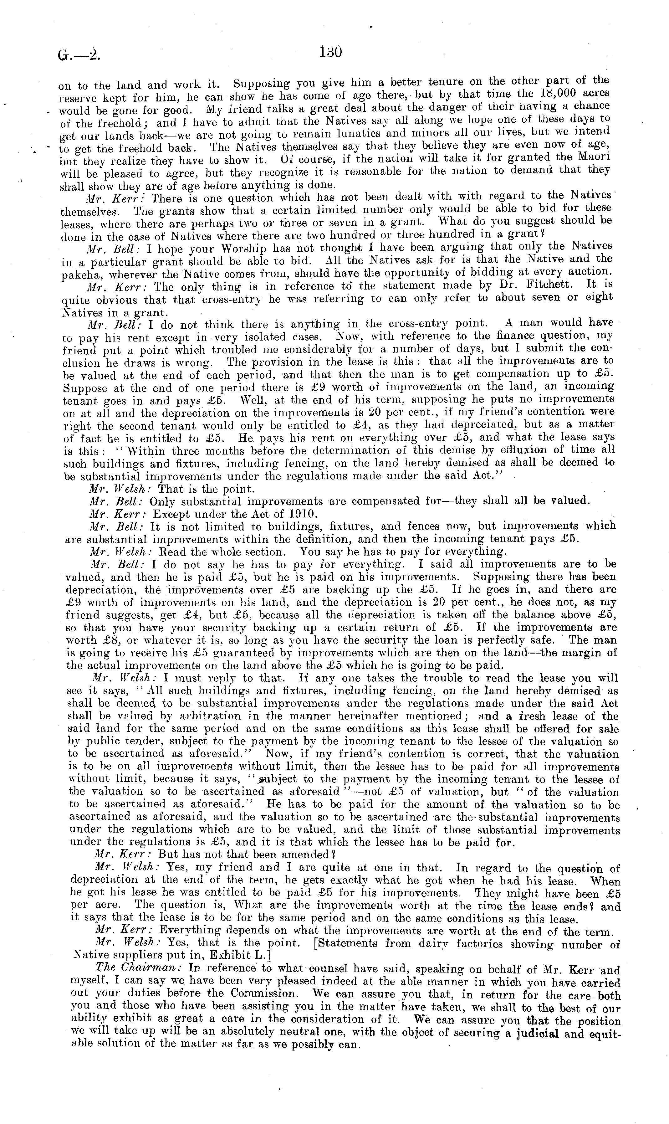 on to the land and work it. Supposing you give him a better tenure on the other part of the reserve kept for him, he can show he has come of age there, but by that time the 18,000 acres would be gone for good. My friend talks a great deal about the danger of their having a chance of the freehold; and 1 have to admit that the Natives say all along we hope one of these days to get our lands back —we are not going to remain lunatics and minors all our lives, but we intend to get the freehold back. The Natives themselves say that they believe they are even now of age, but they realize they have to show it. Of course, if the nation will take it for granted the Maori will be pleased to agree, but they recognize it is reasonable for the nation to demand that they shall show they are of age before anything is done. Mr. Kerr: There is one question which has not been dealt with with regard to the Natives themselves. The grants show that a certain limited number only would be able to bid for these leases, where there are perhaps two or three or seven in a grant. What do you suggest should be done in the case of Natives where there are two hundred or three hundred in a grant? Mr. Bell: I hope your Worship has not thought 1 have been arguing that only the Natives iv a particular grant should be able to bid. All the Natives ask for is that the Native and the pakeha, wherever the Native comes from, should have the opportunity of bidding at every auction. Mr. Kerr: The only thing is in reference to the statement made by Dr. Fitchett. It is quite obvious that that cross-entry he was referring to can only refer to about seven or eight Natives in a grant. Mr. Bell: Ido not think there is anything in the cross-entry point. A man would have to pay his rent except in very isolated cases. Now, with reference to the finance question, my friend put a point which troubled me considerably for a number of days, but 1 submit the conclusion he draws is wrong. The provision in the lease is this : that all the improvements are to be valued at the end of each period, and that then the man is to get compensation up to £5. Suppose at the end of one period there is £9 worth of improvements on the land, an incoming tenant goes in and pays £5. Well, at the end of his term, supposing he puts no improvements on at all and the depreciation on the improvements is 20 per cent., if my friend's contention were right the second tenant w-ould only be entitled to £4, as they had depreciated, but as a matter of fact he is entitled to £5. He pays his rent on everything over £5, and what the lease says is this: "Within three months before the determination of this demise by efliuxion of time all such buildings and fixtures, including fencing, on the land hereby demised as shall be deemed to be substantial improvements under the regulations made under the said Act." Mr. Welsh: That is the point. Mr. Bell: Only substantial improvements are compensated for —they shall all be valued. Mr. Kerr: Except under the Act of 1910. Mr. Bell: It is not limited to buildings, fixtures, and fences now, but improvements which are substantial improvements within the definition, and then the incoming tenant pays £5. Mr. Welsh: Read the whole section. You say he has to pay for everything. Mr. Bell: I do not say he has to pay for everything. 1 said all improvements are to be valued, and then he is paid £5, but he is paid on his improvements. Supposing there has been depreciation, the improvements over £5 are backing up the £5. If he goes in, and there are £9 worth of improvements on his land, and the depreciation is 20 per cent., he does not, as my friend suggests, get £4, but £5, because all the depreciation is taken off the balance above £5, so that you have your security backing up a certain return of £5. If the improvements are worth £8, or whatever it is, so long as you have the security the loan is perfectly safe. The man is going to receive his £5 guaranteed by improvements which are then on the land —the margin of the actual improvements on the land above the £5 which he is going to be paid. Mr. Welsh: 1 must reply to that. If any one takes the trouble to read the lease you will see it says, "All such buildings and fixtures, including fencing, on the land hereby demised as shall be deemed to be substantial improvements under the regulations made under the said Act shall be valued by arbitration in the manner hereinafter mentioned; and a fresh lease of the said land for the same period and on the same conditions as this lease shall be offered for sale by public tender, subject to the payment by the incoming tenant to the lessee of the valuation so to be ascertained as aforesaid." Now, if my friend's contention is correct, that the valuation is to be on all improvements without limit, then the lessee has to be paid for all improvements without limit, because it says, ".subject to the payment by the incoming tenant to the lessee of the valuation so to be ascertained as aforesaid " —not £5 of valuation, but " of the valuation to be ascertained as aforesaid." He has to be paid for the amount of the valuation so to be ascertained as aforesaid, and the valuation so to be ascertained are the-substantial improvements under the regulations which are to be valued, and the limit of those substantial improvements under the regulations is £5, and it is that which the lessee has to be paid for. Mr. Kerr: But has not that been amended? Mr. Welsh: Yes, my friend and I are quite at one in that. In regard to the question of depreciation at the end of the term, he gets exactly what he got when he had his lease. When he got his lease he was entitled to be paid £5 for his improvements. They might have been £5 per acre. The question is, What are the improvements worth at the time the lease ends? and it says that the lease is to be for the same period and on the same conditions as this lease. Mr. Kerr: Everything depends on what the improvements