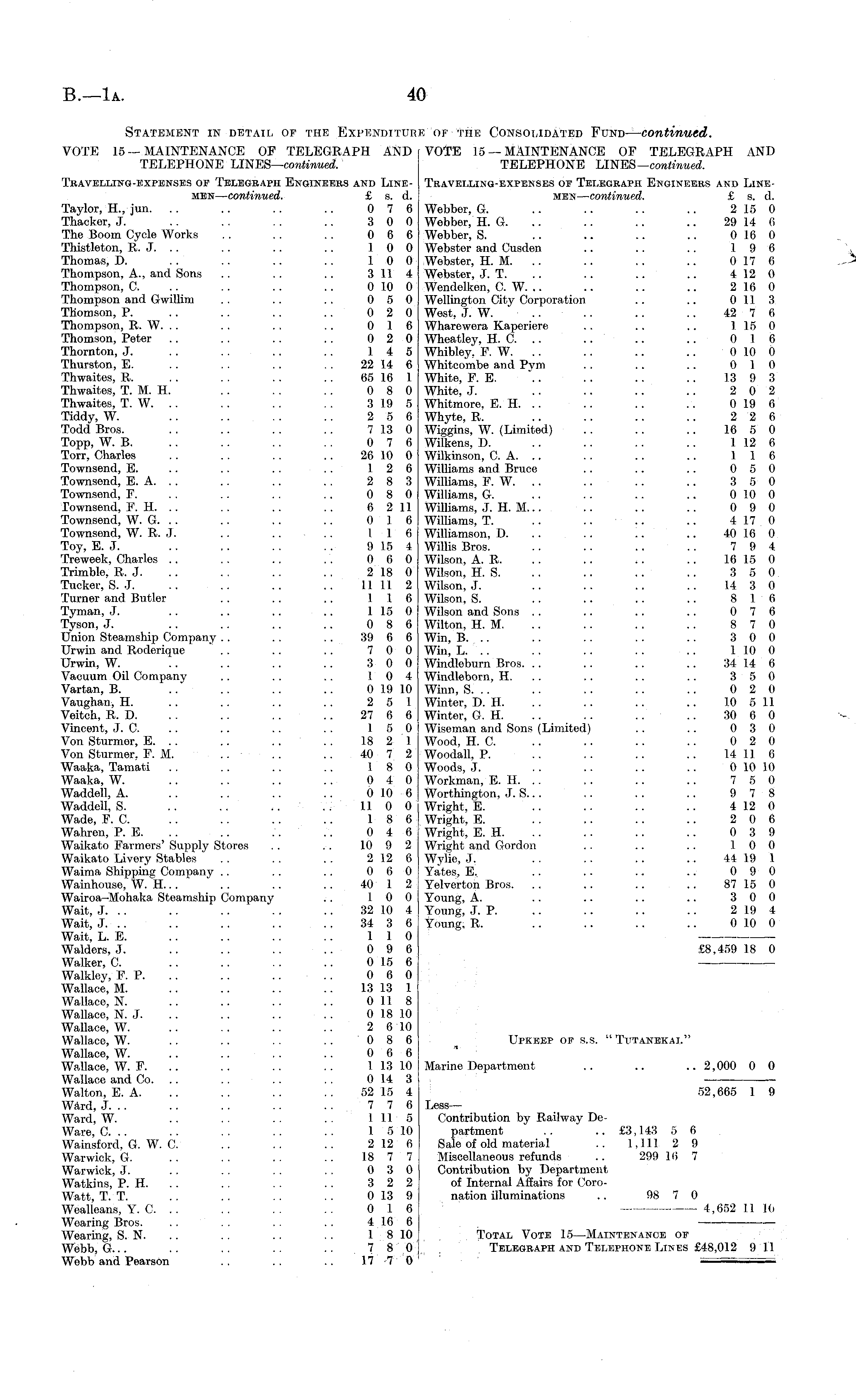 Statement in detail of the Expenditure of the Consolidated Fund — continued. VOTE 15 — MAINTENANCE OF TELEGRAPH AND VOTE 15 — MAINTENANCE OF TELEGRAPH AND TELEPHONE LlNES— continued. TELEPHONE LlNES— continued. Travelling-expenses of Telegraph Engineers and Line- Travelling-expenses of Telegraph Engineers and Linemen—continued. £ s. d. men— continued. £ s. d. Taylor, H., jun. . . .. .. .. 0 7 6 Webber, G. .. .. .. .. 2 15 0 Thacker, J. .. .. .. .. 3 0 0 Webber, H. G. .. .. .. .. 29 14 6 The Boom Cycle Works .. .. .. 0 6 6 Webber, S. .. .. .. .. 016 0 Thistleton, R. J. .. . . .. .. 10 0 Webster and Cusden .. .. .. 19 6 Thomas, D. .. .. .. .. 10 0 Webster, H. M. .. .. .. .. 017 6 Thompson, A., and Sons . . .. .. 311 4 Webster, J. T. .. .. .. .. 412 0 Thompson, C. .. .. .. .. 010 0 Wendelken, C. W. .. .. .. .. 216 0 Thompson and Gwillim . . .. . . 0 5 0 Wellington City Corporation .. .. 0 113 Thomson, P. . . .. .. .. 0 2 0 West, J. W. .. .. .. .. 42 7 6 Thompson, R. W. .. . . .. . . 0 16 Wharewera Kaperiere .. .. .. 115 0 Thomson, Peter .. . . .. . . 0 2 0 Wheatley, H. C. .. .. .. .. 0 16 Thornton, J. . . . . .. .. 14 5 Whibley. F. W. .. .. .. .. 010 0 Thurston, E. .. . . .. .. 22 14 6 Whitcombe and Pym .. .. .. 0 10 Thwaites, R. . . . . .. .. 65 16 1 White, F. E. .. .. .. .. 13 9 3 Thwaites, T. M. H. . . . . .. 0 8 0 White, J. .. .. .. .. 2 0 2 Thwaites, T. W. .. .. .. .. 3 19 5 Whitmore, E. H. .. .. .. .. 0 19 6 Tiddy, W. . . .. . . .. 2 5 6 Whyte, R. .. .. .. .. 2 2 6 Todd Bros. . . .. . . .. 713 0 Wiggins, W. (Limited) .. .. .. 16 5 0 Topp, W. B. . . .. . . . . 0 7 6 Wilkens, D. .. .. .. .. 112 6 Torr, Charles . . .. .. .. 26 10 0 Wilkinson, C. A. .. .. .. .. 116 Townsend, E. .. . . .. . . 12 6 Williams and Bruce .. .. .. 0 5 0 Townsend, E. A. . . .. .. . . 2 8 3 Williams, F. W. .. .. .. .. 3 5 0 Townsend, F. .. .. .. .. 0 8 0 Williams, G. .. .. .. .. 010 0 Townsend, F. H. .. .. .. .. 6 2 11 Williams, J. H. M... .. .. .. 0 9 0 Townsend, W. G. . . . . .. .. 0 16 Williams, T. .. .. .. .. 417 0 Townsend, W. R. J. . . .. . . 116 Williamson, D. . . .. .. .. 40 16 0 Toy, E. J. .. . . .. . . 915 4 Willis Bros. .. .. .. .. 7 9 4 Treweek, Charles .. . . .. . . 0 6 0 Wilson, A. R. . . .. .. .. 16 15 0 Trimble. R. J. .. . . .. . . 218 0 Wilson, H. S. .. .. .. .. 3 5 0 Tucker, S. J. .. .. .. .. 1111 2 Wilson, J. .. .. .. .. 14 3 0 Turner and Butler .. .. .. 116 Wilson, S. .. .. .. .. 8 16 Tyman, J. .. .. .. .. 115 0 Wilson and Sons . . .. .. .. 0 7 6 Tyson, J. .. . . .. .. 0 8 6 Wilton, H. M. .. .. .. .. 8 7 0 Union Steamship Company . . .. .. 39 6 6 Win, B. .. . . .. .. .. 3 0 0 Urwin and Roderique . . .. .. 7 0 0 Win, L. .. . . .. .. .. 1 10 0 Urwin, W. .. . . .. . . 3 0 0 Windleburn Bros. .. .. .. .. 34 14 6 Vacuum Oil Company . . .. .. 10 4 Windleborn, H. .. .. .. .. 3 5 0 Vartan, B. .. . . .. .. 019 10 Winn, S. .. .. .. .. .. 0 2 0 Vaughan, H. .. .. .. .. 2 5 1 Winter, D. H. .. .. .. .. 10 5 11 Veitch, R. D. .. .. .. . . 27 6 6 Winter, G. H. .. .. .. .. 30 6 0 Vincent, J. C. .. .. .. .. 15 0 Wiseman and Sons (Limited) .. .. 0 3 0 Yon Stunner, E. . . .. . . . . 18 2 1 Wood, H. C. .. .. .. .. 0 2 0 Yon Stunner. F. M. .. .. .. 40 7 2 Woodall, P. .. .. .. .. 14 11 6 Waaka, Tamati .. .. .. .. 18 0 Woods, J. .. .. .. .. 010 10 Waaka, W. .. . . .. .. 0 4 0 Workman, E. H. . . .. .. .. 7 5 0 Waddell, A. .. .. .. .. 010 6 Worthington, J. 5... .. .. .. 9 7 8 Waddell, S. .. .. ~ ~ 11 0 0 Wright, E. .. .. .. .. 412 0 Wade, F. C. .. .. .. .. 18 6 Wright, E. .. .. .. .. 2 0 6 Wahren, P. E. .. .. . . .. 0 4 6 Wright, E. H. .. . . .. .. 0 3 9 Waikato Farmers' Supply Stores .. .. 10 9 2 Wright and Gordon .. .. .. 10 0 Waikato Livery Stables .. .. .. 212 6 Wylle, J. .. . . .. .. 44 19 1 Waima Shipping Company . . .. .. 0 6 0 Yates, E. .. .. .. .. 0 9 0 Wainhouse, W. H... .. .. .. 40 1 2 Yelverton Bros. .. .. .. .. 87 15 0 Wairoa—Mohaka Steamship Company .. 10 0 Young, A. .. .. .. .. 3 0 0 Wait. J. .. .. .. . . .. 32 10 4 Young, J. P. .. .. .. .. 219 4 Wait, J. .. . . .. . . . . 34 3 6 Young, R. .. .. .. .. 010 0 Wait, L. E. .. .. . . .. 110 Walders, J. .. .. .. .. 0 9 6 £8,459 18 0 Walker, C. .. .. . . .. 015 6 Walkley, F. P. .. .. .. .. 0 6 0 Wallace, M. .. .. .. .. 13 13 1 Wallace, N. .. .. . . .. 0 118 Wallace, N. J. .. .. .. .. 018 10 Wallace, W. .. .. .. .. 2 610 Wallace, W. .. .. .. . . 0 8 6 Upkeep or s.s. " Tutanekai." Wallace, W. .. .. . . .. 0 6 6 Wallace, W. F. .. .. .. .. 113 10 Marine Department .. .. .. 2,000 0 0 Wallace and Co. .. .. . . .. 0 14 3 Walton, E. A. .. .. .. .. 52 15 4 52,665 1 9 Ward, J. . . .. . . .. ..776 LessWard, W. . . .. . . . . 1115 Contribution by Railway De- .. .. .. .. .. 1 5 10 partment .. .. £3,143 5 6 Wainsford, G. W. C. .. .. .. 212 6 Sale of old material .. 1,111 2 9 Warwick, G. .. .. . . .. 18 7 7 Miscellaneous refunds .. 299 16 7 Warwick, J. .. .. . . .. 0 3 0 Contribution by Department Watkins, P. H. .. .. . . .. 3 2 2 of Internal Affairs for CoroWatt, T. T. . . .. . . .. 0 13 9 nation illuminations .. 98 7 0 Wealleans, Y. C. .. .. .. .. 0 16 4,65211 10 Wearing Bros. . . .. . . . . 4 16 6 — Wearing, S. N. .. . . .. . . 1 8 10 Total Vote 15—Maintenance of Webb, G... .. .. .. ... 7 8 .0 . Telegraph and Telephone Lines £48,012 9 11 Webb and Pearson .. .. .. 17 7 0 — ■