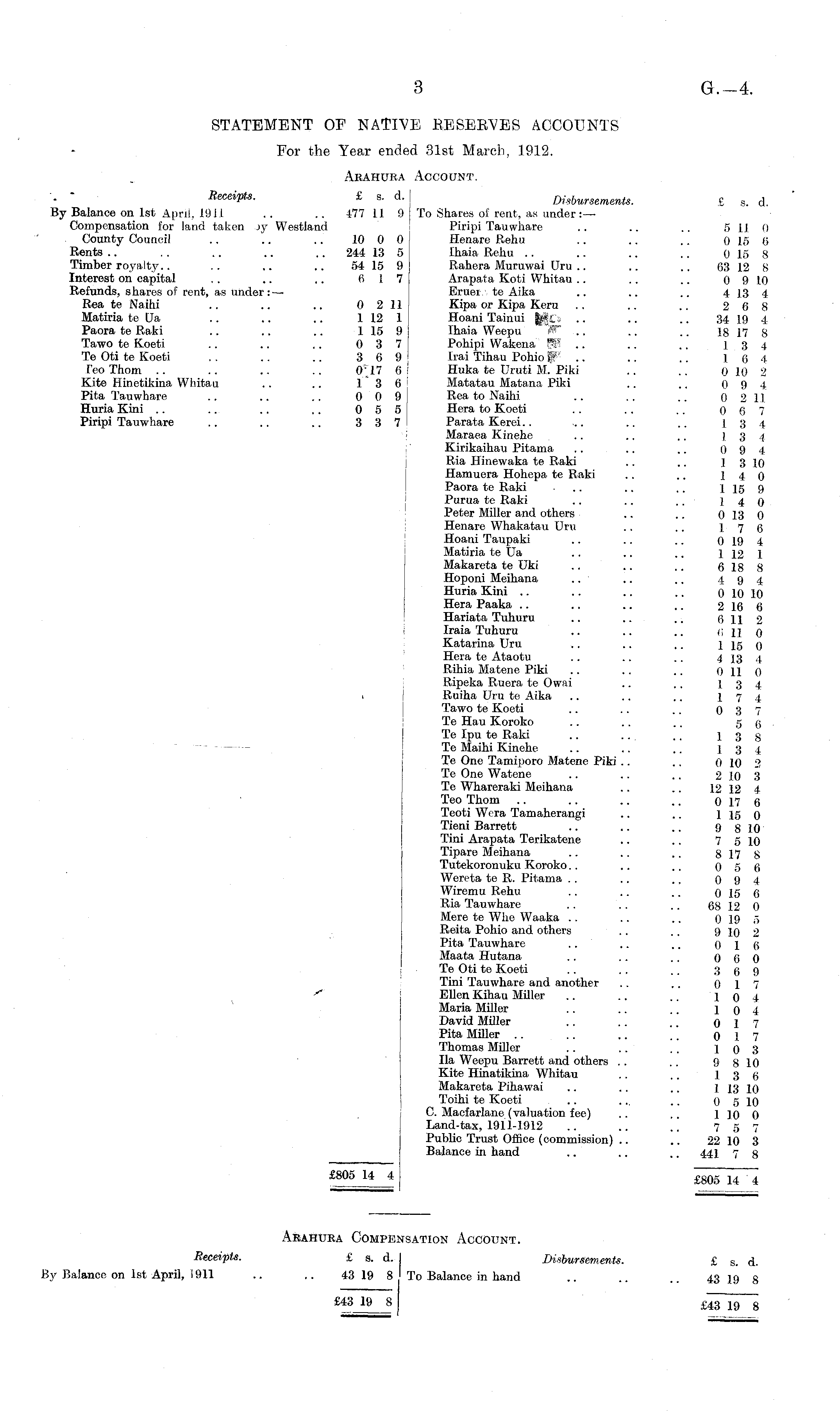 Receipts. £ s. d. By Balance on Ist April, 191.1 .. .. 477 11 9 Compensation for land taken jy Westland County Council .. .. .. 10 0 0 Rents .. . . .. .. 244 13 5 Timber royalty.. .. .. .. 54 15 9 Interest on capital . . .. .. 6 17 Refunds, shares of rent, as under: — Rea te Naihi .. .. .. 0 2 11 Matiria te Ua .. .. .. 1 12 1 Paora te Raki .. .. .. 1 15 9 Tawo te Koeti .. .. .. 0 3 7 Te Oti te Koeti . . .. .. 3 6 9 Teo Thorn .. .. .. .. 0"17 6 : Kite Hinetikina Whitau .. .. 1*36 Pita Tauwhare .. .. .. 0 0 9 Huria Kini .. .. .. .. 0 5 5 Piripi Tauwhare .. .. .. 3 3 7 £805 14 4