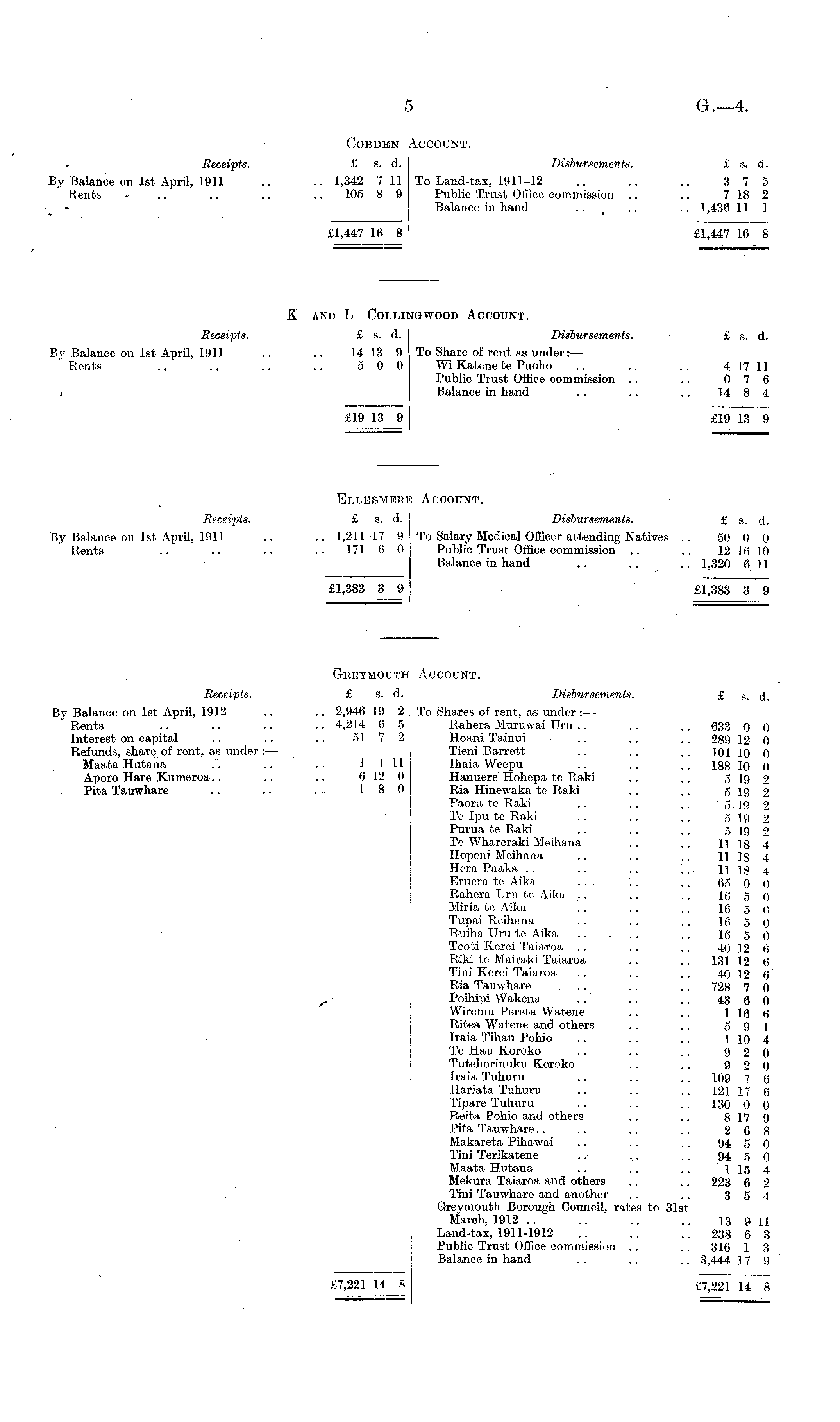 Disbursements. £ s. d. To Shares of rent, as under: — Rahera Muruwai Uru .. .. .. 633 0 0 Hoani Tainui .. .. .. 289 12 0 Tieni Barrett .. .. .. 101 10 0 Ihaia Weepu .. .. .. 188 10 0 Hanuere Hohepa te Raki .. .. 519 2 Ria Hinewaka te Raki .. .. 5 19 2 Paora te Raki .. .. .. 5 19 2 Te Ipu te Raki .. .. . . 519 2 Purua te Raki .. .. .. 519 2 Te Whareraki Meihana .. .. 11 18 4 Hopeni Meihana .. .. . , 11 18 4 Hera Paaka .. .. .. . . 1118 4 Eruera te Aika .. .. .. 65 0 0 Rahera Uru te Aika . . .. .. 16 5 0 Miria te Aika . . .. . . 16 5 0 Tupai Reihana . . .. . . 16 5 0 Ruiha Uru te Aika .. 16 5 0 Teoti Kerei Taiaroa .. .. .. 40 12 6 Riki te Mairaki Taiaroa .. .. 131 12 6 Tini Kerei Taiaroa .. .. .. 40 12 6 Ria Tauwhare ... .. .. 728 7 0 Poihipi Wakena ..' .. .. 43 6 0 Wiremu Pereta Watene .. .. 1 16 6 Ritea Watene and others .. .. 5 9 1 Iraia Tihau Pohio .. .. .. 1 10 4 Te Hau Koroko .. .. .. 9 2 0 Tutohorinuku Koroko .. .. 9 2 0 Iraia Tuhuru .. . . .. 109 7 6 Hariata Tuhuru .. .. ~ 121 17 6 Tipare Tuhuru .. .. .. 130 0 0 Reita Pohio and others .. .. 8 17 9 Pita Tauwhare. . . . .. .. 2 6 8 Makareta Pihawai .. . . .. 94 5 0 Tini Terikatene .. ~ .. 94 5 0 Maata Hutana .. .. .. 115 4 Mekura Taiaroa and others .. .. 223 6 2 Tini Tauwhare and another .. .. 3 5 4 Greymoutb Borough Council, rates to 31st March, 1912 .. .. .. .. 13 9 11 Land-tax, 1911-1912 .. .. .. 238 6 3 Public Trust Office commission .. .. 316 1 3 Balance in hand .. .. .. 3,444 17 9 £7,221 14 8