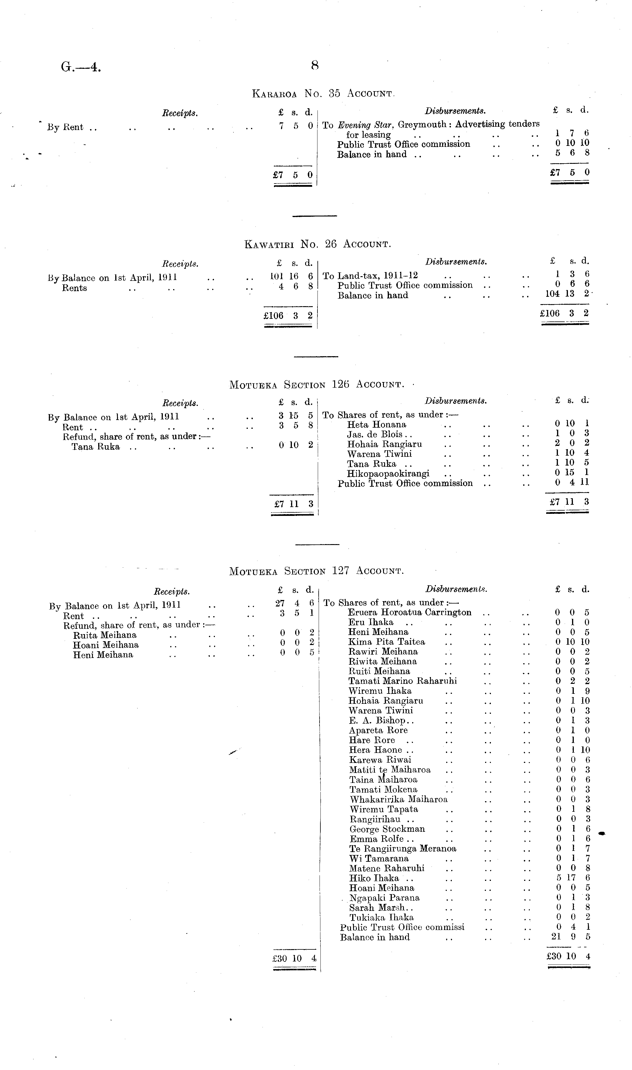 Receipts. £ s. d. By Balance on Ist April, 1911 .. .. 3 15 5 Rent .. .. .. .. ■■ 358 Refund, share of rent, as under: — Tana Ruka . . .. .. - - 0 10 2 £7 11 3