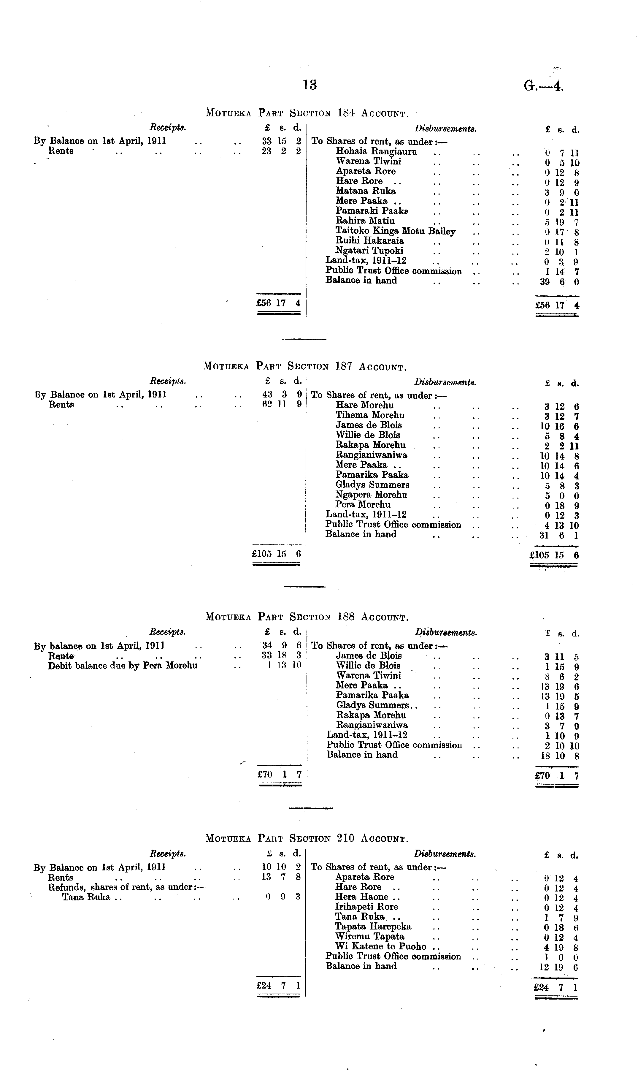 Receipts. £ s. d. By balance on Ist April, 1911 .. .. 34 9 6 Rents .. .. .. .. 33 18 3 Debit balance due by Pera Morehu .. 1 13 10 v £70 1 7