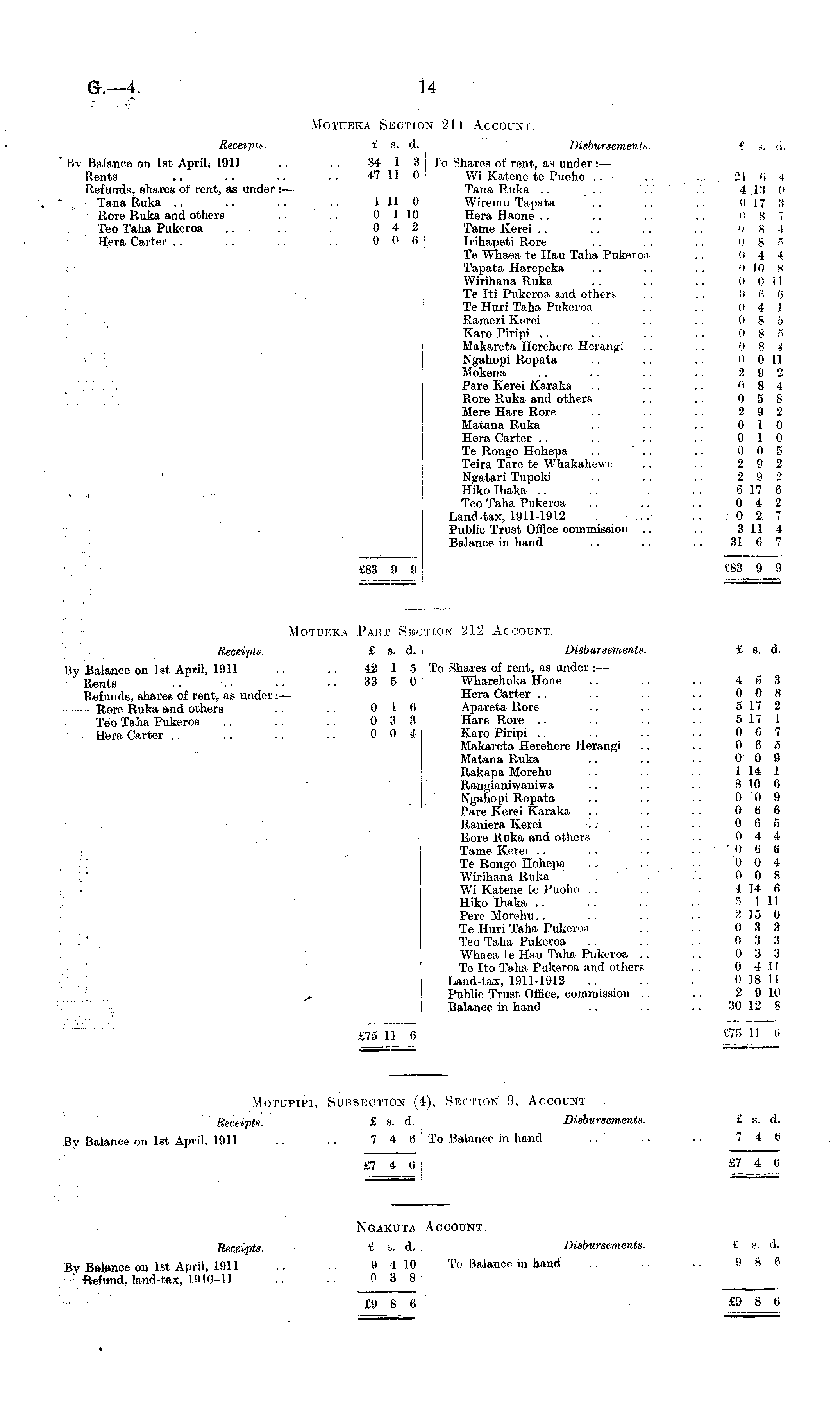 Receipt". £ s. d. By Balance on Ist April; 1911 .. .. 34 1 3 Rents .. .. .. .. 47 11 0 Refunds, shares of rent, as under:— Tana Ruka .. .. .. 1 11 0 Rore Ruka and others .. 0 1 10 Teo Taha Pukeroa ... 042 Hera Carter .. .. .. .. 0 0 6 | I ; £83 9 9