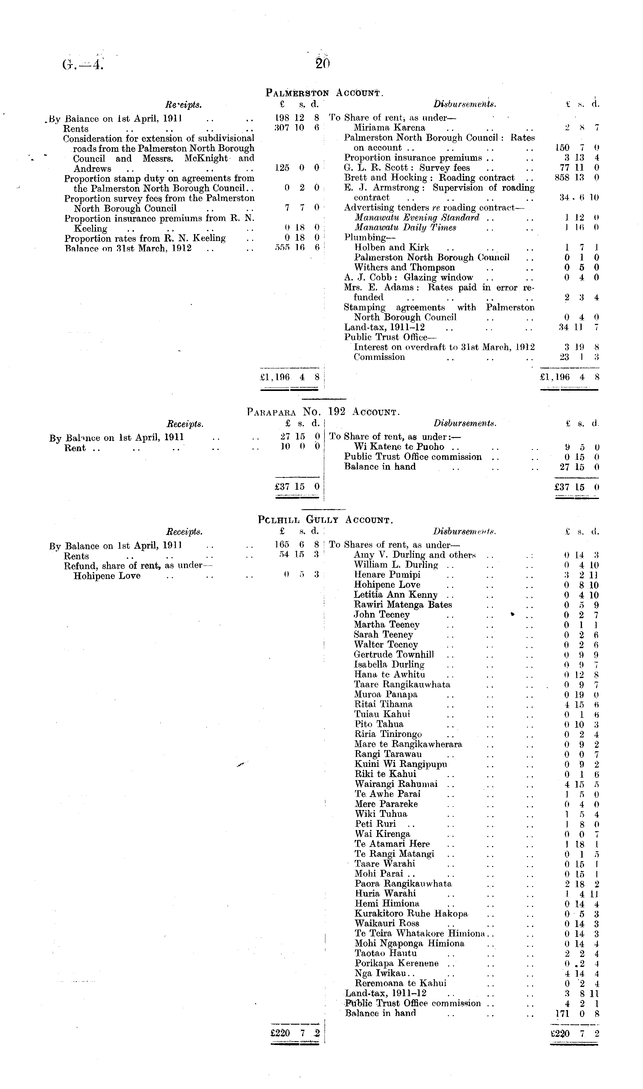 Receipts. £ s. d. By Balance on Ist April, 1911 .. .. 165 6 8 Rents .. .. ■ • • • 5* 15 3 Refund, share of rent, as under— Hohipene Love .. .. .. 0 5 3 y £220 7 .2 !