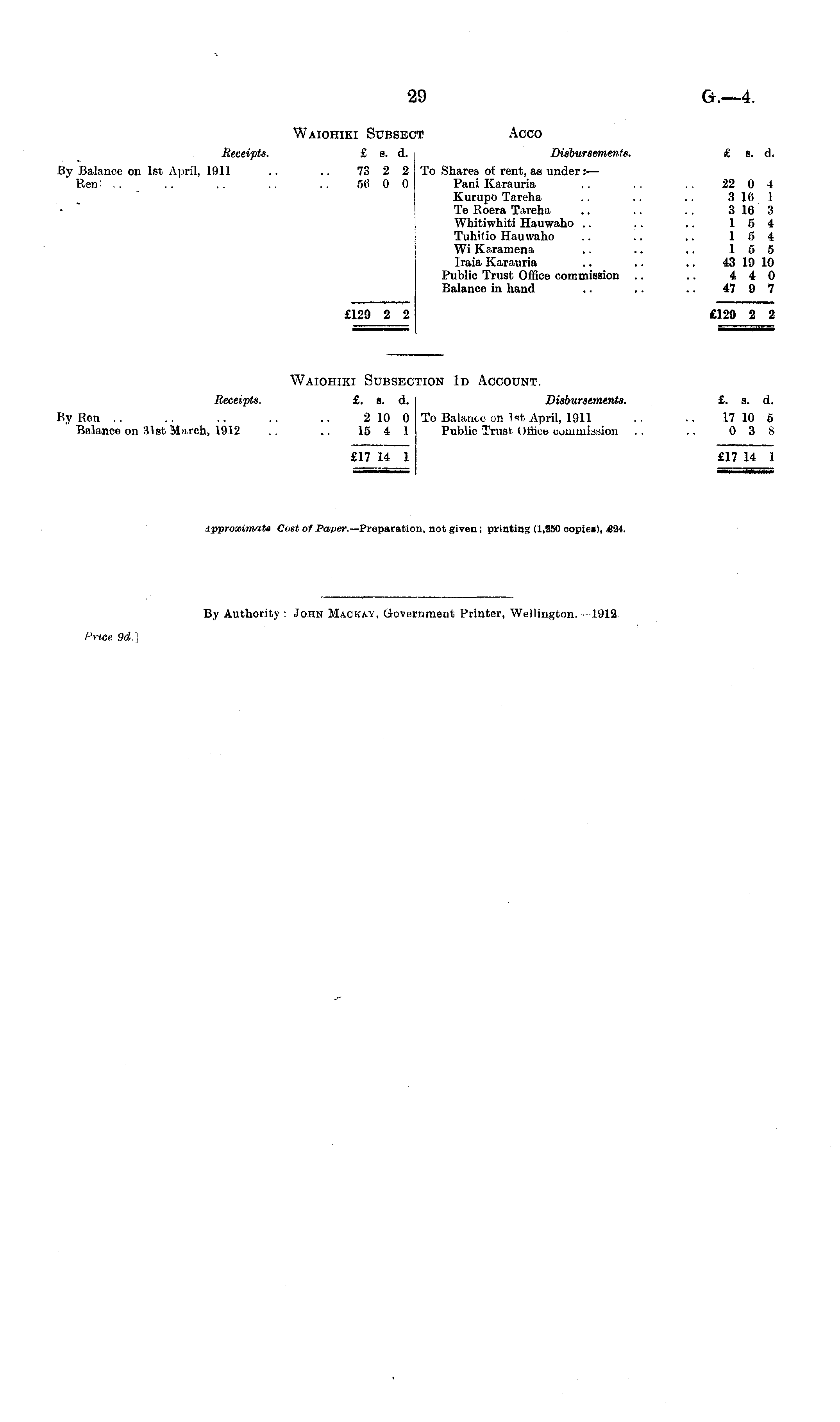 Disbursements. £ s. d. To Shares of rent, as under:— Pani Karauria .. .. 22 0 4 Kurupo Tareha .. .. .. 316 1 Te Roera Tareha .. .. .. 3 16 3 Whitiwhiti Hauwaho .. .. .. 15 4 Tuhitio Hauwaho .. .. .. 15 4 Wi Karamena .. .. .. 15 5 Iraia Karauria .. .. .. 43 19 10 Publio Trust Office commission .. .. 4 4 0 Balance in hand .. .. .. 47 9 7 £129 2 2