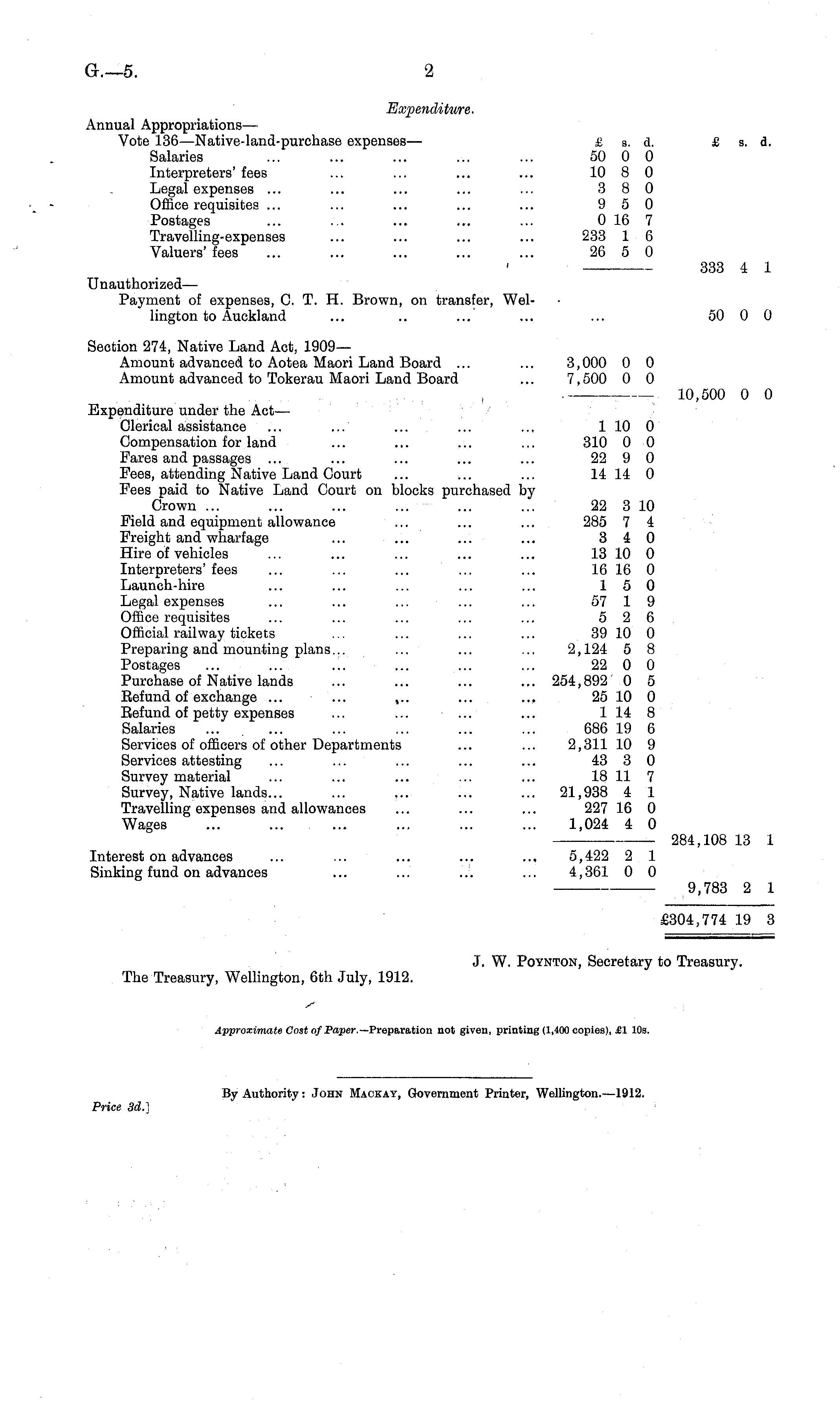 Expenditure. Annual Appropriations— Vote 136 —Native-land-purchase expenses— £ a. d. £ s. d. Salaries ... ... ... ... ... 50 0 0 Interpreters' fees ... ... ... ... 10 8 0 Legal expenses ... ... ... ... ... 380 Office requisites ... ... ... ... ... 950 Postages ... ... ... ... ... 0 16 7 Travelling-expenses ... ... ... ... 233 1 6 Valuers' fees ... ... ... ... ... 26 5 0 333 4 l Unauthorized— Payment of expenses, C. T. H. Brown, on transfer, Wellington to Auckland ... .. ... ... ... 50 0 0 Section 274, Native Land Act, 1909— Amount advanced to Aotea Maori Land Board ... ... 3,000 0 0 Amount advanced to Tokerau Maori Land Board ... 7,500 0 0 . 10,500 0 0 Expenditure under the Act— Clerical assistance ... ... ... ... ... 110 0 Compensation for land ... ... ... ... 310 0 0 Fares and passages ... ... ... ... ... 2290 Fees, attending Native Land Court ... ... ... 14 14 0 Fees paid to Native Land Court on blocks purchased by Crown ... ... ... ... ... ... 22 3 10 Field and equipment allowance ... ... ... 285 7 4 Freight and wharfage ... ... ... ... 340 Hire of vehicles ... ... ... ... ... 13 10 0 Interpreters' fees ... ... ... ... ... 16 16 0 Launch-hire ... ... ... ... ... 150 Legal expenses ... ... ... ... ... 57 1 9 Office requisites ... ... ... ... ... 526 Official railway tickets ... ... ... ... 39 10 0 Preparing and mounting plans... ... ... ... 2,124 5 8 Postages ... ... ... ... ... ... 22 0 0 Purchase of Native lands ... ... ... ... 254,892 0 5 Befund of exchange ... ... ~. ... ... 25 10 0 Eefund of petty expenses ... ... ... ... 1 14 8 Salaries ... ... ... ... ... ... 686 19 6 Services of officers of other Departments ... ... 2,311 10 9 Services attesting ... ... ... ... ... 43 3 0 Survey material ... ... ... ... ... 18 11 7 Survey, Native lands... ... ... ... ... 21,938 4 1 Travelling expenses and allowances ... ... ... 227 16 0 Wages ... ... ... ... ... ... 1,024 4 0 ■ 284,108 13 1 Interest on advances ... ... ... ... ... 5,422 2 1 Sinking fund on advances ... ... ... ... 4,361 0 0 9,783 2 1 £304,774 19 3 J. W. Poynton, Secretary to Treasury. The Treasury, Wellington, 6th July, 1912.
