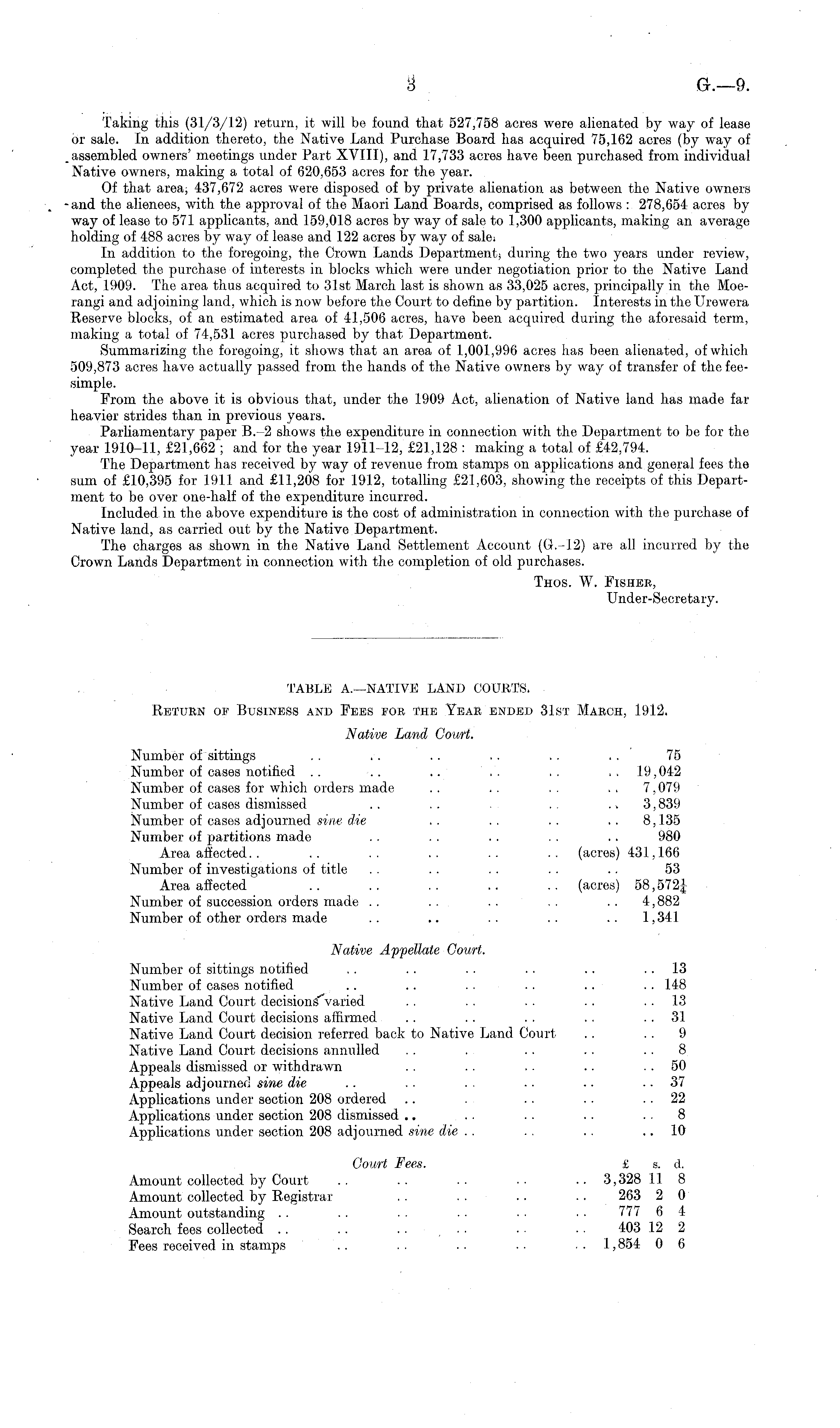 Taking this (31/3/12) return, it will be found that 527,758 acres were alienated by way of lease or sale. In addition thereto, the Native Land Purchase Board has acquired 75,162 acres (by way of assembled owners' meetings under Part XVIII), and 17,733 acres have been purchased from individual Native owners, making a total of 620,653 acres for the year. Of that area; 437,672 acres were disposed of by private alienation as between the Native owners and the alienees, with the approval of the Maori Land Boards, comprised as follows : 278,654 acres by way of lease to 571 applicants, and 159,018 acres by way of sale to 1,300 applicants, making an average holding of 488 acres by way of lease and 122 acres by way of sale* In addition to the foregoing, the Crown Lands Department; during the two years under review, completed the purchase of interests in blocks which were under negotiation prior to the Native Land Act, 1909. The area thus acquired to 31st March last is shown as 33,025 acres, principally in the Moerangi and adjoining land, which is now before the Court to define by partition. Interests in the Urewera Reserve blocks, of an estimated area of 41,506 acres, have been acquired during the aforesaid term, making a total of 74,531 acres purchased by that Department. Summarizing the foregoing, it shows that an area of 1,001,996 acres has been alienated, of which 509,873 acres have actually passed from the hands of the Native owners by way of transfer of the feesimple. From the above it is obvious that, under the 1909 Act, alienation of Native land has made far heavier strides than in previous years. Parliamentary paper 8.-2 shows the expenditure in connection with the Department to be for the year 1910-11, £21,662 ; and for the year 1911-12, £21,128 : making a total of £42,794. The Department has received by way of revenue from stamps on applications and general fees the sum of £10,395 for 1911 and £11,208 for 1912, totalling £21,603, showing the receipts of this Department to be over one-half of the expenditure incurred. Included in the above expenditure is the cost of administration in connection with the purchase of Native land, as carried out by the Native Department. The charges as shown in the Native Land Settlement Account (6.-12) are all incurred by the Crown Lands Department in connection with the completion of old purchases. Thos. W. Fisher, Under-Secretary.