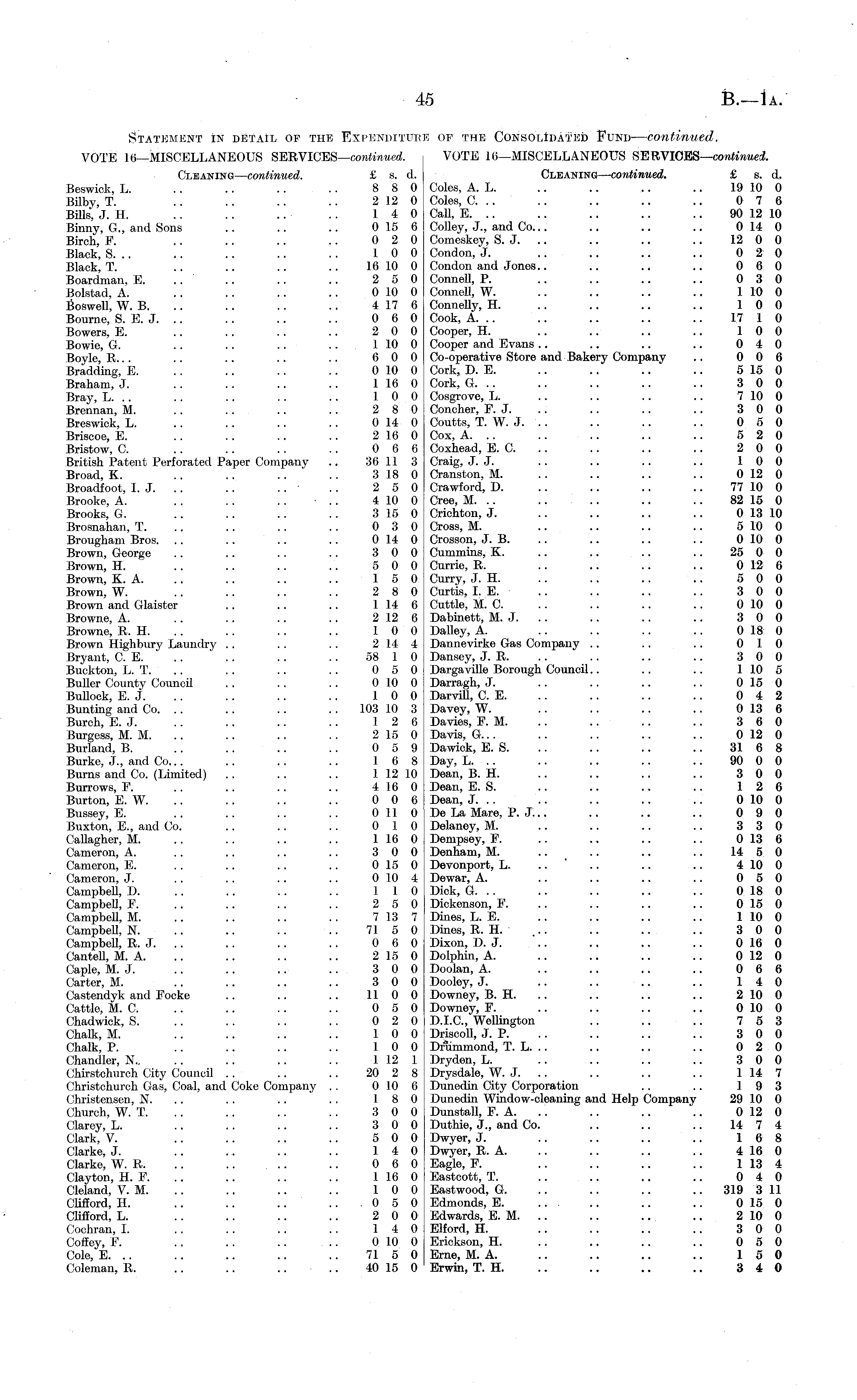 Statement in detail of the Expenditure op the Consolidated Fund — continued. VOTE 16-—MISCELLANEOUS SERVlCES— continued. VOTE 16—MISCELLANEOUS SERVH3BS— continued. Cleaning— continued. £ s. d. Cleaning— continued. £ s. d. Beswick, L. . . .. .. .. 8 8 0 Coles, A. L. .. .. .. .. 19 10 0 Bilby, T. .. .. .. .. 212 0 Coles, C. .. .. .. .. .. 0 7 6 Bills, J. H. .. .. .. .. 14 0 Call, E. .. .. .. .. .. 90 12 10 Binny, G., and Sons .. .. .. 0 15 6 Colley, J., and C 0... .. .. .. 0 14 0 Birch, F. .. .. .. .. 0 2 0 Comeskey, S. J. .. .. .. .. 12 0 0 Black, S. .. .. .. .. . . 10 0 Condon, J. .. .. .. .. 0 2 0 Black, T. .. .. .. .. 16 10 0 Condon and Jones.. .. .. .. 0 6 0 Boardman, E. .. .. .. .. 2 5 0 Connell, P. .. .. .. .. 0 3 0 Bolstad, A. .. .. .. .. 010 0 Connell, W. .. .. .. .. 110 0 Boswell, W. B. .. .. .. .. 417 6 Connelly, H. .. .. .. .. 10 0 Bourne, S. E. J. .. .. .. .. 0 6 0 Cook, A. .. .. .. .. .. 17 10 Bowers, E. .. .. .. .. 2 0 0 Cooper, H. .. .. .. .. 10 0 Bowie, G. .. .. .. 110 0 Cooper and Evans .. .. .. .. 0 4 0 Boyle, R.. . .. .. .. .. 6 0 0 Co-operative Store and Bakery Company .. 0 0 6 Bradding, E. .. .. .. .. 010 0 Cork, D. E. .. .. .. .. 515 0 Braham, J. .. .. .. .. 116 0 Cork, G. .. .. .. .. .. 3 0 0 Bray, L. .. .. .. .. .. 10 0 Cosgrove, L. .. .. .. .. 710 0 Brennan, M. .. .. .. .. 2 8 0 Concher, E. J. .. .. .. .. 3 0 0 Breswick, L. .. .. .. .. 0 14 0 Coutts, T. W. J. '.. .. .. .. 0 5 0 Briscoe, E. .. .. .. .. 216 0 Cox, A. .. .. .. .. .. 5 2 0 Bristow, C. .. . . .. .. 0 6 6 Coxhead, E. C. .. .. .. .. 2 0 0 British Patent Perforated Paper Company .. 36 11 3 Craig, J. J. .. .. .. .. 10 0 Broad, K. .. .. .. .. 318 0 Cranston, M. .. .. .. .. 012 0 Broadf oot, I. J. .. .. .. ■ .. 2 5 0 Crawford, D. .. .. .. .. 77 10 0 Brooke, A. . . .. .. • .. 410 0 Cree, M. . . .... .. .. 82 15 0 Brooks, G. .. .. .. .. 3 15 0 Crichton, J. .. .. .. .. 0 13 10 Brosnahan, T. .. .. .. .. 0 3 0 Cross, M. .. .. .. .. 510 0 Brougham Bros. .. . . .. .. 014 0 Crosson, J. B. .. .. .. .. 010 0 Brown, George .. .. .. .. 3 0 0 Cummins, K. .. .. .. .. 25 0 0 Brown, H. .. .. .. .. 5 0 0 Currie, R. .. .. .. .. 012 6 Brown, K. A. .. .. .. .. 15 0 Curry, J. H. .. .. .. .. 5 0 0 Brown, W. .. .. .. .. 2 8 0 Curtis, I. E. .. .. .. .. 3 0 0 Brown and Glaister .. .. .. 114 6 Cuttle, M. C. .. .. .. .. 010 0 Browne, A. .. .. .. .. 212 6 Dabinett, M. J. .. .. .. .. 3 0 0 Browne, R. H. .. . . .. 10 0 Dalley, A. .. .. .. .. 018 0 Brown Highbury Laundry .. . . .. 2 14 4 Dannevirke Gas Company .. .. .. 0 10 Bryant, C. E. .. .. .. .. 58 1 0 Dansey, J. R. .. .. .. .. 3 0 0 Buckton, L. T. .. .. .. .. 0 5 0 Dargaville Borough Council.. .. .. 110 5 Buller County Council .. .. .. 010 0 Darragh, J. .. .. .. .. 015 0 Bullock, E. J. .. .. .. .. 10 0 Darvill, C. E. .. .. .. .. 0 4 2 Bunting and Co. .. .. .. .. 103 10 3 Davey, W. .. .. .. .. 013 6 Burch, E. J. .. .. .. .. 12 6 Davies, F. M. .. .. .. .. 3 6 0 Burgess, M. M. .. .. .. .. 215 0 Davis, G... .. .. .. .. 012 0 Burland, B. .. .. .. .. 0 5 9 Dawick, E. S. .. .. .. .. 31 6 8 Burke, J., and C 0... .. .. .. 16 8 Day, L. .. .. .. .. .. 90 0 0 Burns and Co. (Limited) .. .. .. 112 10 Dean, B. H. .. .. .. .. 3 0 0 Burrows, F. .. .. .. .. 416 0 Dean, E. S. .. .. .. .. 12 6 Burton, E. W. .. .. .. .. 0 0 6 Dean, J. .. .. .. .. .. 010 0 Bussey, E. .. .. .. .. 0 11 0 De La Mare, P. J. .. .. .. .. 0 9 0 Buxton, E., and Co. .. .. .. 0 10 Delaney, M. .. .. .. .. 3 3 0 Gallagher, M. .. .. .. .. 116 0 Dempsey, F. .. .. .. .. 013 6 Cameron, A. .. .. .. .. 3 0 0 Denham, M. .. .. .. .. 14 5 0 Cameron, E. . . .. .. .. 015 0 Devonport, L. .. .. .. .. 410 0 Cameron, J. .. .. .. .. 010 4 Dewar, A. .. .. .. .. 0 5 0 CampbeU, D. .. .. .. .. 110 Dick, G. . . .. .. .. .. 018 0 Campbell, F. .. .. .. .. 2 5 0 Dickenson, F. .. .. .. .. 015 0 Campbell, M. .. .. .. .. 713 7 Dines, L. E. .. .. .. .. 110 0 CampbeU, N. .. .. .. .. 71 5 0 Dines, R. H. .. .. .. .. 3 0 0 Campbell, R, J. .. .. .. .. 0 6 0 Dixon, D. J. '.. .. .. .. 016 0 Cantell, M. A. .. .. .. .. 215 0 Dolphin, A. .. .. .. .. 012 0 Caple, M. J. .. .. .. .. 3 0 0 Doolan, A. .. .. .. .. 0 6 6 Carter, M. .. .. .. .. 3 0 0 Dooley, J. .. .. .. .. 14 0 Castendyk and Focke .. .. .. 11 0 0 Downey, B. H. .. .. .. .. 210 0 Cattle, M. C. .. .. .. .. 0 5 0 Downey, F. .. .. .. .. 010 0 Chadwick, S. .. .. .. .. 0 2 0 D.1.C., Wellington .. .. .. 7 5 3 Chalk, M. .. .. .. .. 10 0 Driscoll, J. P. .. .. .. .. 3 0 0 Chalk, P. .. .. .. .. 10 0 Drummond, T. L. .. .. .. .. 0 2 0 Chandler, N.. .. .. .. .. 112 1 Dryden, L. .. .. .. .. 3 0 0 Chirstchurch City Council . . .. .. 20 2 8 Drysdale, W. J. .. .. .. .. 1 14 7 Christchurch Gas, Coal, and Coke Company . . 010 6 Dunedin City Corporation .. .. 19 3 Christensen, N. .. . . .. .. 18 0 Dunedin Window-cleaning and Help Company 29 10 0 Church, W. T. .. .. .. .. 3 0 0 Dunstall, F. A. .. .. .. .. 012 0 Clarey, L. .. . . .. .. 3 0 0 Duthie, J., and Co. .. .. .. 14 7 4 Clark, V. .. .. .. .. 5 0 0 Dwyer, J. .. .. .. .. 16 8 Clarke, J. .. .. .. .. 14 0 Dwyer, R. A. .. .. .. .. 416 0 Clarke, W. R. .. .. 0 6 0 Eagle, F. .. .. .. .. 1 13 4 Clayton, H. F. .. .. .. .. 116 0 Eastcott, T. .. .. .. .. 0 4 0 Cleland, V. M. .. .. .. .. 10 0 Eastwood, G. .. .. .. .. 319 311 Clifford, H. .. .. .. ... 0 5 0 Edmonds, E .. .. 0 15 0 Clifford, L. .. .. .. .. 2 0 0 Edwards, E. M. .. .. .. .. 210 0 Cochran, I. .. .. .. .. 14 0 Elford, H. .. .. .. .. 3 0 0 Coffey, F. .. .. 010 0 Erickson, H. .. .. .. .. 0 5 0 Cole, E. .. .. .. .. .. 71 5 0 Erne, M. A. .. .. .. .. 15 0 Coleman, R. .. .. .... 40 15 0 Erwin, T. H. .. .. .. .. 340