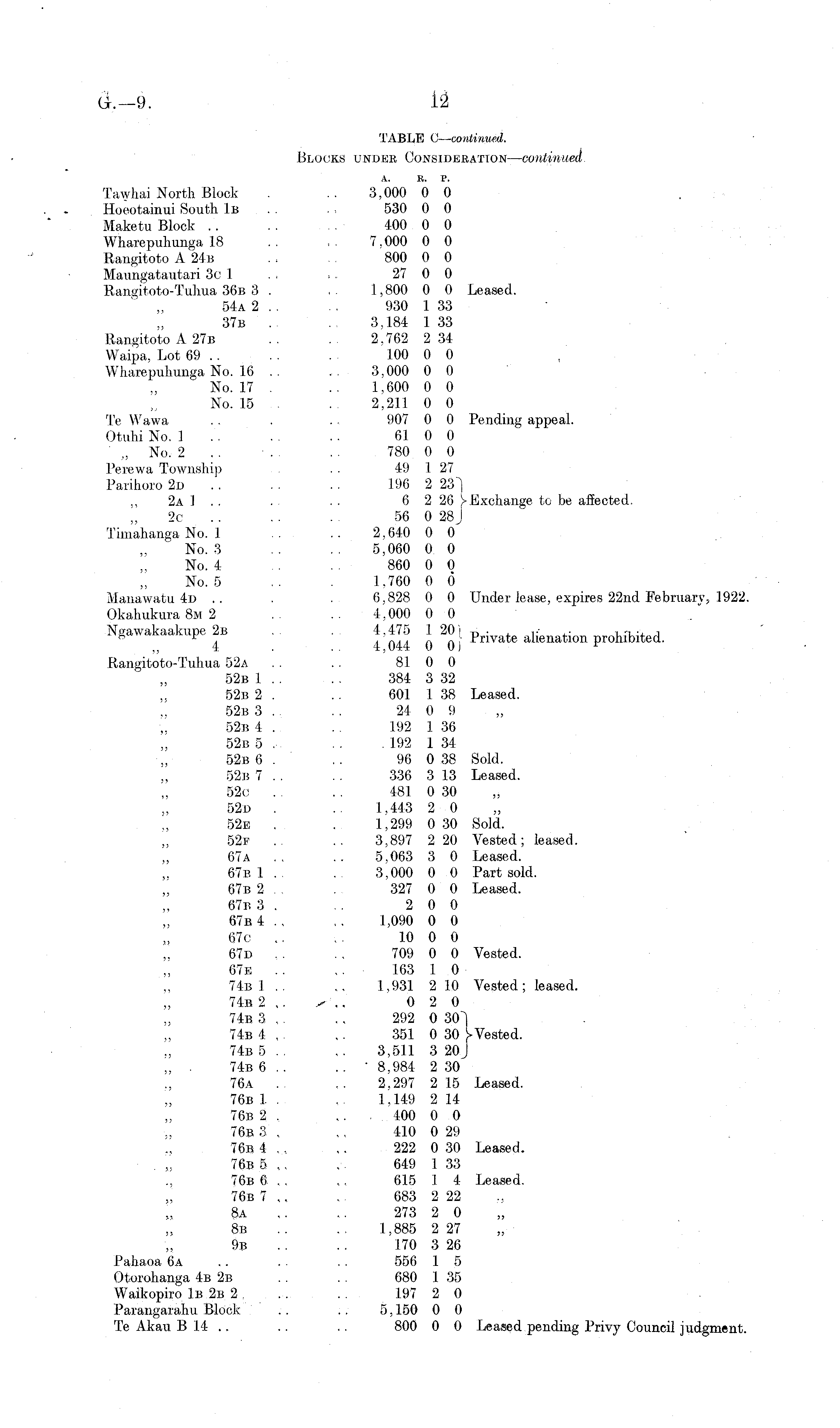 TABLE 0— continued. Blocks under Consideration — continued A. R. P. Tawhai North Block . .. 3,000 0 0 Hoeotainui South 1b .. ,, 530 0 0 Maketu Block .. 400 0 0 Wharepuhunga 18 .. ,. 7,000 0 0 Rangitoto A 24b . , , . 800 0 0 Maungatautari 3c 1 . , , . 27 0 0 Rangitoto-Tuhua 36b 3 . .. 1,800 0 0 Leased. 54a 2 .. .. 930 1 33 37b .. ., 3,184 I 33 Rangitoto A 27b .. .. 2,762 2 34 Waipa, Lot 69 . . . . . . 100 0 0 Wharepuhunga No. 16 .. .. 3,000 0 0 No. 17 . .. 1,600 0 0 No. 15 . . .. 2,211 0 0 Te Wawa . . . .-. 907 0 0 Pending appeal. Otuhi No. 1 .. .. 61 0 0 ' „ No. 2 . . ■ . . .. 780 0 0 Perewa Township . . 49 1 27 Parihoro 2d .. .. .. 196 2 23") 2a 1 . . . . . . 6 2 26 [> Exchange to be affected. 2c - - - . 56 0 28j Timahanga No. 1 .. .. 2,640 0 0 No. 3 .. .. 5,060 0 0 No. 4 . . 860 0 0 No. 5 .. . 1.760 0 0 Manawatu 4d .. . . 6,828 0 0 Under lease, expires 22nd Februarv, 1922 Okahukura8M 2 .. .. 4,000 0 0 Ngawakaakupe 2b .. . 4,475 1 20] +> • . ,• .• i-u-. j 8 I . . „., „ „.- Private alienation prohibited. Rangitoto-Tuhua 52a . . . . 81 0 0 52b 1 .. .. 384 3 32 52b 2 . . . 601 1 38 Leased. 52b 3 .. .. 24 0 9 52b 4 . . . 1.92 1 36 52b 5 . .. 192 1 34 52b 6 . .. 96 0 38 Sold. 52b 7 . . .. 336 3 13 Leased. 52c .. .. 481 0 30 52d . .. 1,443 2 0 52e , . 1,299 0 30 Sold. 52f .. .. 3,897 2 20 Vested; leased. 67a .. 5,063 3 0 Leased. 67b 1 . . . 3,000 0 0 Part sold. 67b 2 . . 327 0 0 Leased. 67b 3 . . . 2 0 0 67b 4 ., ,. 1,090 0 0 67c ,. ,. 10 0 0 67d . , 709 0 0 Vested. 67e .. ,. 163 1 0 74b 1 .. .. 1,931 2 10 Vested; leased. 74b 2 ,. ✓ .. 0 2 0 74b 3 . . ., 292 0 30"| 74b 4 , . ,. 351 0 30 74b 5 .. ,. 3,511 3 20J „ . 74b 6 .. .. • 8,984 2 30 76a . . ,. 2,297 2 15 Leased. 76b 1. . ,. 1,149 2 14 76b 2 , ... 400 0 0 76b 3 , ,, 410 0 29 76b 4 ... ,. 222 0 30 Leased. 76b 5 ,, ,. 649 1 33 76b 6 . . ,, 615 1 4 Leased. 76b 7 ,, ,. 683 2 22 8a .. 273 2 0 8b ,. 1,885 2 27 9b .. .. 170 3 26 Pahaoa 6a .. . . . . 556 1 5 Otorohanga 4b 2b . . . . 680 1 35 Waikopiro 1b 2b 2 . . . . . 197 2 0 Parangarahu Block .. . . 5,150 0 0 Te Akau B 14 .. .. .. 800 0 0 Leased pending Privy Council judgment.