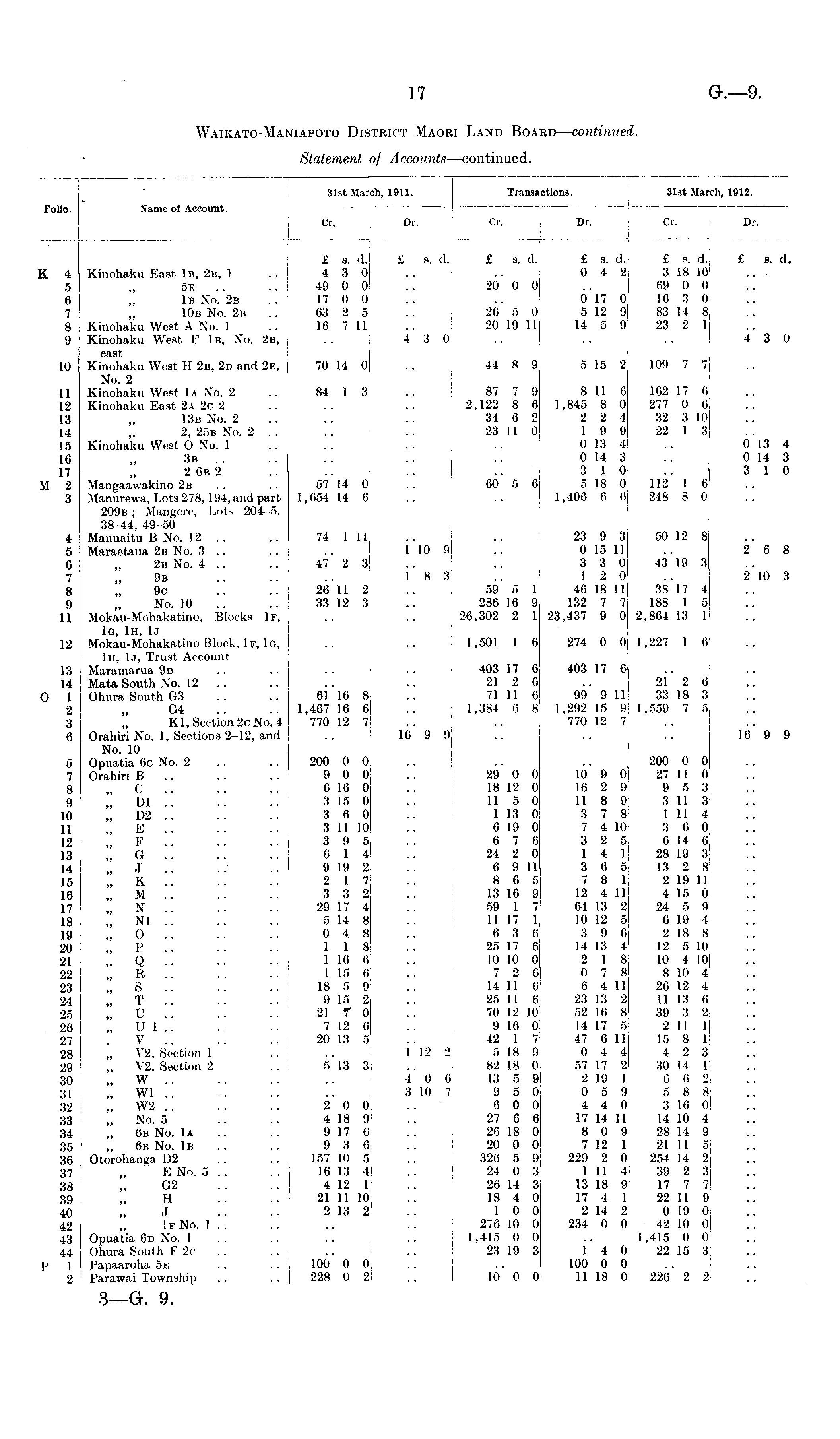 Folio. 31st March, 1911. Transactions. 31st March, Folio. Name of Account. 31st March, 1912. i, 1912. Or. Dr. Cr. Dr. Or. Dr. K 4 5 6 7 8 9 10 11 12 13 14 15 16 17 M 2 3 £ s. d. £ s. d. £ s. d. £ s. d. £ s. d. K 4 Kinohaku East 1b, 2b, 1 .. 4 3 0 .. .. 0 4 2 3 18 10 5 „ 5b .. .. 49 0 0 .. 20 0 0 .. 69 0 0 6 „ Lb No. 2b .. L7 0 0 .. .. 0 17 0 16 3 0 7 „ 10b No. 2b .. 63 2 5 .. 26 5 0 5 12 9 83 14 8 8 Kinohaku West A No. 1 .. 16 7 11 .. 20 19 11 14 5 9 23 2 1 9 Kinohaku West F 1b, No. 2b, .. 4 3 0 east 10 Kinohaku West H 2b, 2d and 2b, 70 14 0 .. 44 8 9 5 15 2 109 7 7 No. 2 11 Kinohaku West 1a No. 2 .. 84 1 3 .. 87 7 9 8 11 6 162 17 6 12 Kinohaku East 2a 2c 2 .. .. .. 2,122 8 6 1,845 8 0 277 0 6 13 „ 13b No. 2 .. .. 34 6 2 2 2 4 32 3 10 14 „ 2, 25b No. 2 .. .. .. 23 11 0 19 9 22 1 3 15 Kinohaku West O No. 1 .. .. .. .. 0 13 4 16 „ 3b .. .. .. .. .. 0 14 3 17 „ 2 6b 2 .. .. .. 3 10 M 2 Mangaawakino 2b .. .. 57 14 0 .. 60 5 6 5 18 0 112 1 6 3 Manurewa, Lots 278,194, and part 1,654 14 6 .. .. 1,406 6 6 248 8 0 209b ; Mangere, Lots 204-5, 38-44, 49-50 4 Manuaitu B No. 12 .. .. 74 1 11 .. .. 23 9 3 50 12 8 5 Maraetaua 2b No. 3 .. .. .. 1 10 9 .. 0 15 11 6 „ 2b No. 4 .. .. 47 2 3 .. .. 3 3 0 43 19 3 7 9b .. .. .. 18 3 .. 12 0 8 9c .. .. 26 11 2 .. 59 5 1 46 18 11 38 17 4 9 „ No. 10 .. 33 12 3 .. 286 16 9 132 7 7 188 1 5 11 Mokau-Mohakatino, Blocks If, .. .. 26,302 2 1 23,437 9 0 2,864 13 1 1g, 1h, 1j 12 Mokau-Mohakatino Block, If, lo, .. .. 1,501 1 6 274 0 0 1,227 1 6 1h, 1j, Trust Account 13 Maramarua 9d .. .. .. .. 403 17 6 403 17 6 14 Mata South No. 12 .. .. .. .. 21 2 6 .,. 21 2 6 O 1 Ohura South G3 .. .. 61 16 8 .. 71 11 6 99 9 11 33 18 3 2 „ G4 .. .. 1,467 16 6 .. 1,384 6 8 1,292 15 9 1,559 7 5 3 „ Kl, Section 2c No. 4 770 12 7 .. .. 770 12 7 6 Orahiri No. 1, Sections 2-12, and .. 16 9 9 No. 10 5 Opuatia 6c No. 2 .. 200 0 0 .. .. .. 200 0 0 7 Orahiri B .. .. .. 9 0 0 .. 29 0 0 10 9 0 27 11 0 8 C .. .. .. 6 16 0 .. 18 12 0 16 2 9 9 5 3 9 LI .. .. .. 3 15 0 .. 11 5 0 11 8 9 3 11 3 10 „ D2 .. .. .. 3 6 0 .. 1 13 0 3 7 8 1 11 4 11 E .. .. .. 3 11 10 .. 6 19 0 7 4 10 3 6 0 12 F .. .. .. 395 .. 676 325 6 14 6 13 G .. .. .. 6 14 .. 24 2 0 14 1 28 19 3 14 J ..' .. 9 19 2 .. 6 9 11 3 6 5 13 2 8 15 K .. .. .. 2 17 .. 8 6 5 7 8 1 2 19 11 16 M .. .. .. 3 3 2 .. 13 16 9 12 4 11 4 15 0 17 „ N .. .. .. 29 17 4 .. 59 1 7 64 13 2 24 5 9 18 „ Nl .. .. .. 5 14 8 .. 11 17 1 10 12 5 6 19 4 19 ,0.. .. .. 048 .. 636 396 218 8 20 P .. .. •• 118 .. 25 17 6 14 13 4 12 5 10 21 Q .. .. .. 1 16 6 .. 10 10 0 2 18 10 4 10 22 „ R .. .. .. 1 15 6 .. 7 2 6 0 7 8 8 10 4 23 S .. .. 18 5 9 .. 14 11 6 6 4 11 26 12 4 24 T .. .. .. 9 15 2 .. 25 11 6 23 13 2 11 13 6 25 U .. .. . . 21 T 0 .. 70 12 10 52 16 8 39 3 2 26 , U 1 .. .. .. 7 12 6 .. 9 16 0 14 17 5 2 11 1 27 V .. .. .. 20 13 5 .. 42 I 7 47 6 11 15 8 1 28 „ V2, Section I .. .. 1 12 21 5 18 9 0 4 4 4 2 3 29 „ V2, Section 2 .. 5 13 3 .. 82 18 0 57 17 2 30 14 1 30 W .. .. .. . - 4 0 6 13 5 9 2 19 1 6 6 2 31 „ Wl .. .. .. .. 3 10 7 9 5 0 0 5 9 5 8 8 32 W2 .. .. .. 2 0 0 .. 6 0 0 4 4 0 3 16 0 33 No. 5 .. .. 4 18 9 .. 27 6 6 17 14 11 14 10 4 34 6b No. Ia .. 9 17 6 .. 26 18 0 8 0 9 28 14 9 35 6b No. 1b .. 9 3 6 .. 20 0 0 7 12 1 21 11 5 36 Otorohanga L2 .. .. 157 10 5 .. 326 5 9 229 2 0 254 14 2 37 „ E No. 5 .. .. 16 13 4 .. 24 0 3 1 11 4 39 2 3 38 „ G2 .. .. 4 12 1 .. 26 14 3 13 18 9 17 7 7 39 „ H .. .. 21 11 10 .. 18 4 0 17 4 1 22 11 9 40 „ J .. .. 2 13 2 .. 10 0 2 14 2 0 19 0 42 „ If No. 1 .. .. .. .. 276 10 0 234 0 0 42 10 0 43 Opuatia 6d No. 1 .. .. .. .. 1,415 0 0 .. 1,415 0 0 44 Ohura South F 2c .. .. .. .. 23 19 3 14 0 22 15 3 P ] Papaaroha 5e .. .. 100 0 0 .. .. 100 0 0 2 Parawai Township .. .. 228 0 2 .. 10 0 0 11 18 0 226 2 2 £ s. d. 43 0 0 13 4 0 14 3 3 1 0 26 8 210 3 16 9 9 3—G. 9.