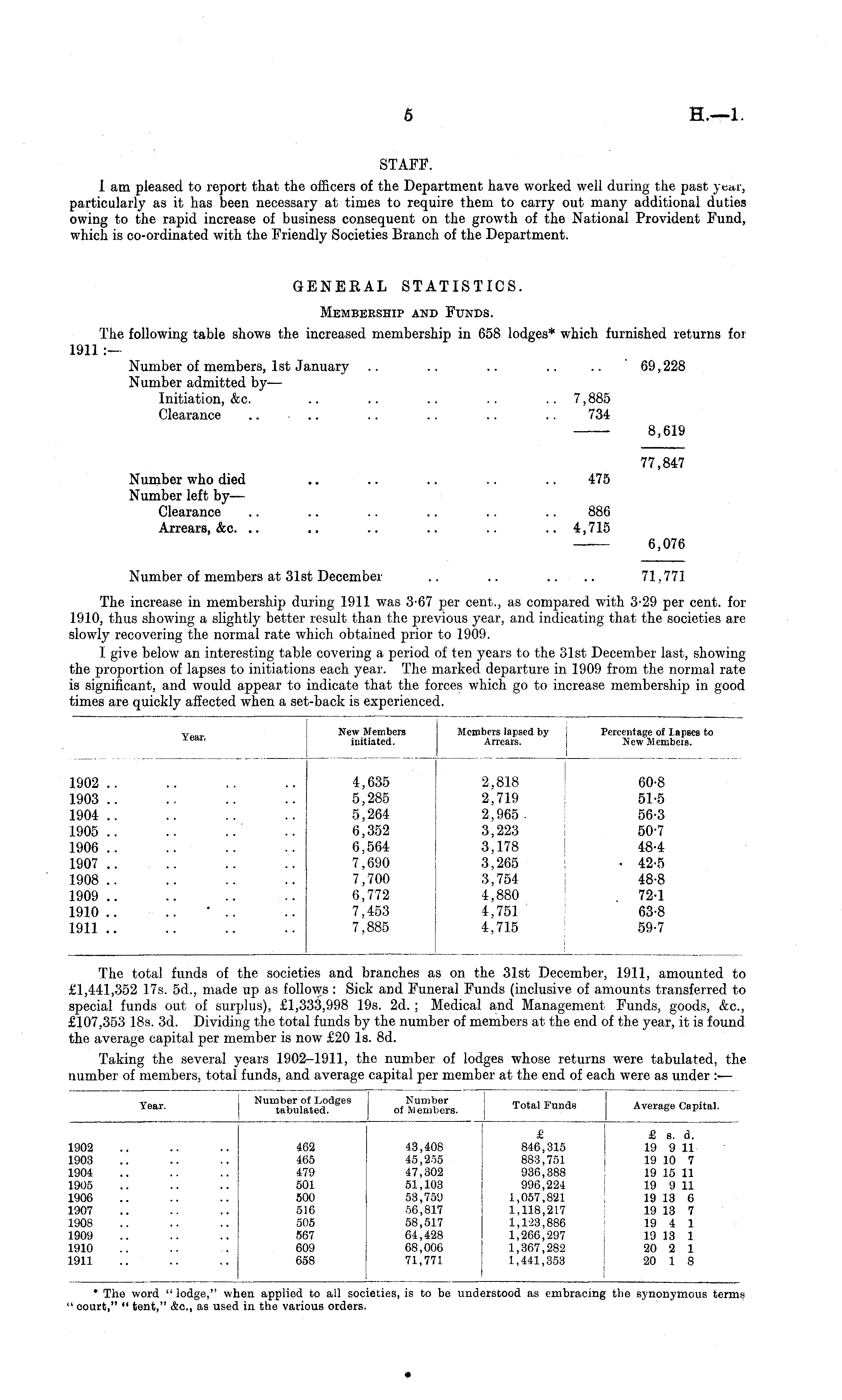 GENERAL STATISTICS. Membership and Funds. The following table shows the increased membership in 658 lodges* which furnished returns for 1911 :— Number of members, Ist January .. .. .. .. .. 69,228 Number admitted by— Initiation, &c. .. .. .. .. ..7,885 Clearance .. .. .. .. .. .. 734 8,619 77,847 Number who died .. .. .. .. .. 475 Number left by— Clearance .. .. .. .. .. .. 886 Arrears, &c. .. .. .. .. .. .. 4,715 6,076 Number of members at 31st December .. .. .. .. 71,771 The increase in membership during 1911 was 3-67 per cent., as compared with 3-29 per cent, for 1910, thus showing a slightly better result than the previous year, and indicating that the societies are slowly recovering the normal rate which obtained prior to 1909. I give below an interesting table covering a period of ten years to the 31st December last, showing the proportion of lapses to initiations each year. The marked departure in 1909 from the normal rate is significant, and would appear to indicate that the forces which go to increase membership in good times are quickly affected when a set-back is experienced.