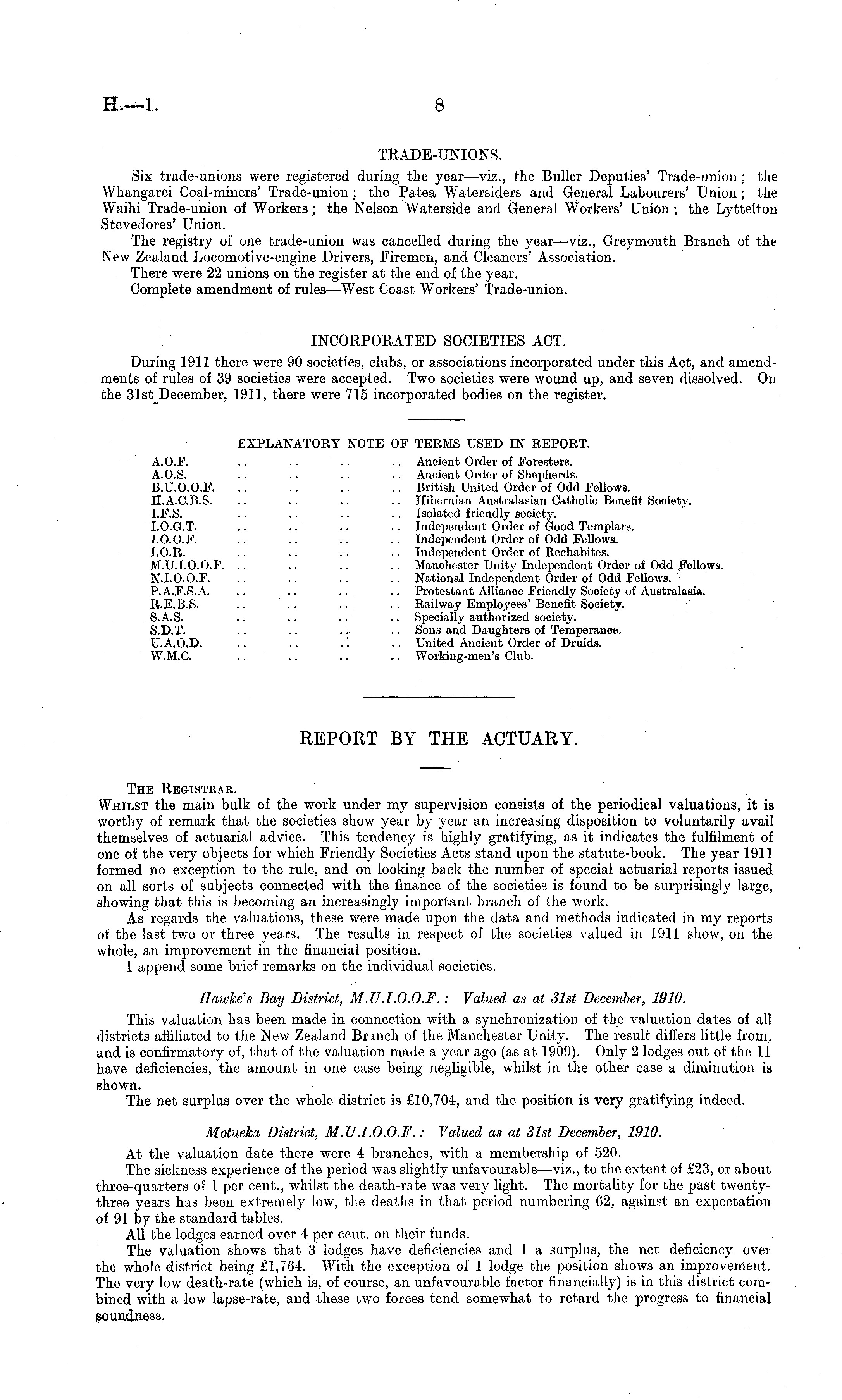 TRADE-UNIONS. Six trade-unions were registered during the year—viz., the Buller Deputies' Trade-union ; the Whangarei Coal-miners' Trade-union; the Patea Watersiders and General Labourers' Union; the Waihi Trade-union of Workers; the Nelson Waterside and General Workers' Union; the Lyttelton Stevedores' Union. The registry of one trade-union was cancelled during the year —viz., Greymouth Branch of the New Zealand Locomotive-engine Drivers, Firemen, and Cleaners' Association. There were 22 unions on the register at the end of the year. Complete amendment of rules—West Coast Workers' Trade-union. INCORPORATED SOCIETIES ACT. During 1911 there were 90 societies, clubs, or associations incorporated under this Act, and amendments of rules of 39 societies were accepted. Two societies were wound up, and seven dissolved. On the 31st December, 1911, there were 715 incorporated bodies on the register. EXPLANATORY NOTE OF TERMS USED IN REPORT. A.O.F. .. .. .. .. Ancient Order of Foresters. A.O.S. .. .. .. .. Ancient Order of Shepherds. 8.U.0.0.F. .. .. .. .. British United Order of Odd Fellows. H.A.C.B.S. .. .. .. .. Hibernian Australasian Catholic Benefit Society. I.F.S. .. .. .. .. Isolated friendly society. 1.0. G.T. .. .. .. .. Independent Order of Good Templars. 1.0.0. F. .. .. .. .. Independent Order of Odd Fellows. 1.0. R. .. .. .. .. Independent Order of Rechabites. M.U.1.0.0.F. .. .. .. .. Manchester Unity Independent Order of Odd Fellows. N.1.0.0.F. .. .. .. .. National Independent Order of Odd Fellows. P.A.F.S.A. .. .. ... .. Protestant Alliance Friendly Society of Australasia. R.E.B.S. .. .. . ■ .. Railway Employees' Benefit Society. S.A.S. .. .. .. .. Specially authorized society. S.D.T. .. .. .. Sons and Daughters of Temperanoe. U.A.O.D. .. .. .'. .. United Ancient Order of Druids. W.M.C. .. .. .. .. Working-men's Club.