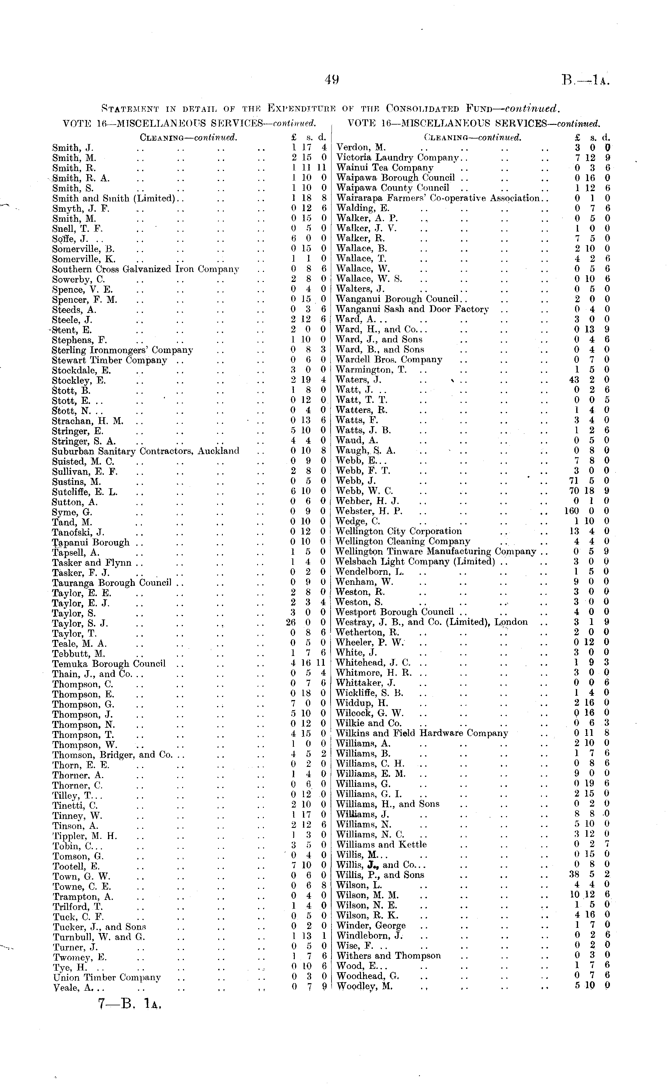 Statement in detail of the Expenditure ok the Consolidated Fund— -continued. VOTE 16—MISCELLANEOUS SERVlCES— continued. VOTE 16—MISCELLANEOUS SERVlCES— continued. Cleaning— continued. £ s. d. Cleaning — continued. £ s. d. Smith, J. .. .. .. .. 1 17 4 Verdon, M. .. .. .. .. 3 0 0 Smith, M. .. .. .. .. 2 15 0 Victoria Laundry Company.. .. .. 7 12 9 Smith, R. .. .. .. .. 11111 Wainui Tea Company ' .. .. .. 0 3 6 Smith, R. A. .. .. .. . . 1 10 0 Waipawa Borough Council .. .. .. 016 0 Smith, S. .. .. .. .. 110 0 Waipawa County Council .. .. .. 112 6 Smith and Smith (Limited).. .. .. 1 18 8 Wairarapa Farmers' Co-operative Association.. 0 1 0 Smyth, J. F. .. .. .. .. 0 12 6 Walding, E. .. .. .. .. 0 7 6 Smith, M. .. .. .. .. 0 15 0 Walker, A. P. ~ .. .. .. 0 5 0 Shell, T. F. .. • .. .. .. 0 5 0 Walker, J. V. .. .. .. .. 10 0 So/ffe, J. . . .. .. .. .. 6 0 0 Walker, R. . . .. .. .. 7 5 0 Somervillo, B. .. .. .. .. 0 15 0 Wallace,)?. .. .. .. .. 2 10 0 Somerville, K. .. .. . . . . 110 Wallace, T. .. .. 4 2 6 Southern Cross Galvanized Iron Company . . 0 8 6 Wallace, W. .. .. .. .. 0 5 6 Sowerby, C. .. .. .. ' .. 2 8 0 Wallace, W. S. .. .. .. 010 6 Spence, V. E. .. .. .. .. 0 4 0 Walters, J. .. .. .. .. 0 5 0 Spencer, F. M. .. .. .. .. 0 15.0 Wanganui Borough Council.. .. .. 200 Steeds, A. .. .. .. .. 0 3 6 Wanganui Sash and Door Factory .. .. 0 4 0 Steele, J. .. .. .. .. 212 6 Ward, A. .. .. .. .. .. 3 0 0 ■Stent, E. .. .. .. 2 0 0 Ward, H., and C 0... .. .. .. 0 13 9 Stephens, F. .. . . .. .. 1 10 0 Ward, J., and Sons .. .. .. 0 4 6 Sterling Ironmongers' Company . . .. 0 8 3 Ward, 8., and Sons .. .. .. 0 4 0 Stewart Timber Company .. ' . . .. 0 6 0 Wardell Bros. Company .. .. .. 0 7 0 Stockdale, E. .. .. .. . . 3 0 0 Warmington, T. .. .. .. .. 15 0 Stoekley, E. .. .. .. .. 219 4 Waters, J. .. .. .. .. 43 2 0 Stott B. .. .. . . 18 0 Watt, J. .. .. .. .. .. 0 2 6 Stott, E. .. .. ■ .. .. .. 0 12 0 Watt, T. T. .. .. .. .. 0 0 5 Stott, N. .. .. . . .. .. 0 4 0 Walters, R. .. .. .. .. 14 0 Strachan, H. M. . . .. .. ■ .. 0 13 6 Watts, F. .. .. .. .. 3 4 0 Stringer, E. . . .. .. .. 510 0 Watts, J. B. .. .. .. .. 12 6 Stringer, S. A. .. . . .. .. 4 4 0 Waud, A. .. .. .. .. 0 5 0 Suburban Sanitary Contractors, Auckland . . 0 10 8 Waugh, £j. A. .. ■ . . .. .. 0 8 0 Suisted, M. C. .. .. .. .. 0 9 0 Webb, E... .. .. .. .. 7 8 0 Sullivan, E. F. .. .. .. . . 2 8 0 Webb, F. T. .. .. .. .. 3 0 0 Sustins, M. .. .. .. .. 0 5 0 Webb, J. .. .. .. ' .. 71 5 0 Sutclifle, E. L. .. .. .. .. 610 0 Webb, W. C. .. .. .. .. 70 18 9 Sutton, A. .. .. .. . . 0 6 0 Webber, H. J. .. .. .. .. 0 10 Syme G .. .. ..090 Webster, H. P. .. .. 160 0 0 Tand, M. . . . . .. 010 0 Wedge, C. .. .. .. .. 110 0 Tanofski, J. .. .. . . . . 012 0 Wellington City Corporation .. .. 13 4 0 Tapanui Borough .. .. .. .. 0100 Wellington Cleaning Company .. .. 4 4 0 Tapsell, A. .. .. . . .. 15 0 Wellington Tinware Manufacturing Company .. 0 5 9 Tasker and Flynn .. . . . . 14 0 Welsbach Light Company (Limited) .. .. 3 0 0 Tasker, F. J. .. .. .. .. 0 2 0 Wendelborn, L. .. .. .. .. 15 0 Tauranga Borough Council .. .. . . 0 9 0 Wenham, W. .. .. .. .. 9 0 0 Taylor, E. E. .. .. .. .. 2 8 0 Weston, R. .. .. .. .. 3 0 0 Taylor, E. J. .. . . .. . . 2 3 4 Weston, S. .. .. .. .. 3 0 0 Taylor, S. .. .. .. .. 3 0 0 Westport Borough Council .. .. .. 4 0 0 Taylor, S. J. .. . . .. .. 26 0 0 Westray, J. 8., and Co. (Limited), London .. 3 19 Taylor T . . . .. . . 0 8 6 Wetherton, R. .. .. .. .. 2 0 0 Teale, M. A. .. . . .. . . 0 5 0 Wheeler, P. W. .. .. .. .. 012 0 Tebbutt, M. .. . . ' .. .. 17 6 White, J. .. .. .. .. 3 0 0 Temuka Borough Council .. .. .. 4 16 11 Whitehead, J. C. .. .. .. .. 19 3 Thain, J., and Co. .. .. .. .. 0 5 4 Whitmore, H. R. .. .. .. .. 3 0 0 Thompson, C. .. .. . . .. 0 7 6 Whittaker, J. .. .. .. .. 0 0 6 Thompson, E. . .. .. .. 018 0 Wickliffe, S. B. .. .. .. .. 14 0 Thompson, G. .. .. .. .. 7 0 0 Widdup, H. .. .. .. .. 216 0 Thompson J. .. .. .. 510 0 Wilcock, G. W. .. .. .. .. 016 0 Thompson, N. . . .. .. .. 012 0 Wilkie and Co. .. .. .. .. 0 6 3 Thompson, T. .. .. .. ■ ■ 415 0 Wilkins and Field Hardware Company .. 0 118 Thompson, W. '.'. '.'. . .. . 10 0! Williams, A. .. .. .. .. 210 0 Thomson, Bridger. and Co. .. .. . . 4 5 2! Williams, B. .. .. .. .. 176 Thorn E E ' .. .. 0 20 1 Williams, C. H. .. .. .. .. 0 8 6 Thorner, A . .. . . .. 14 0 Williams, E. M. .. .. .. .. 9 0 0 Thorner, C. .. .. . . .. 0 6 0 Williams, G. .. .. .. .. 019 6 Tilley T .. 012 0 Williams, G. I. .. .. .. .. 215 0 Tinetti C. .. .. 2 10 0 Williams, H., and Sons .. .. .. 0 2 0 Tinney' W 1 17 0 Williams, J. .. .. 8 8 0 Tinson A .. 2 12 6 Williams, N. .. .. .. .. 5 10 0 Tippler, M. H. .. .. .. .. 13 0 Williams, N. C. .. .. .. .. 312 0 Tobin C ... 3 5 0 Williams and Kettle .. .. . . 027 Tomson, G. .. . . . . ..'O4O Willis, M... .. .. .. .. 0150 Tootell E .. .. .. .. 710 0 Willis, J., and C 0... .. .. .. 0 8 0 Town, G. W. . . .. .. .. 0 6 0 Willis, P., and Sons .. .. .. 38 5 2 Towne C E . .. .. 0 6 8 Wilson, L. .. .. .. .. 4 4 0 Trampton, A. .. . . .. 0 4 0 Wilson, M. M. .. .. .. .. 10 12 6 Trilford T ... 1 4 0 Wilson, N. E. .. .. .. .. 150 Tuck, C. F. . . .. . . 0 5 0 Wilson, R. K. .. .. .. .. 416 0 Tucker, J., and Sons . . .. . . 0 2 0 Winder, George. .. .. .. .. 17 0 Turnbull, W. and G. .. .. .. 1 13 1 Windleborn, J. .. .. .. .. 0 2 6 Turner, J. . . .. .. .. 0 5 0 Wise, F. .. .. .. .. .. 0 2 0 Twoiney X ..176 Withers and Thompson .. .. .. 030 Tye, H". '.. .. .. .. ■■ 010 6 Wood, E 17 6 Union Timber Company .. . . .. 0 3 0 Woodhead, O. .. . . .. .. 0 7 6 Veale, A. .. .. " 0 7 9 Wopdley, M 510 0