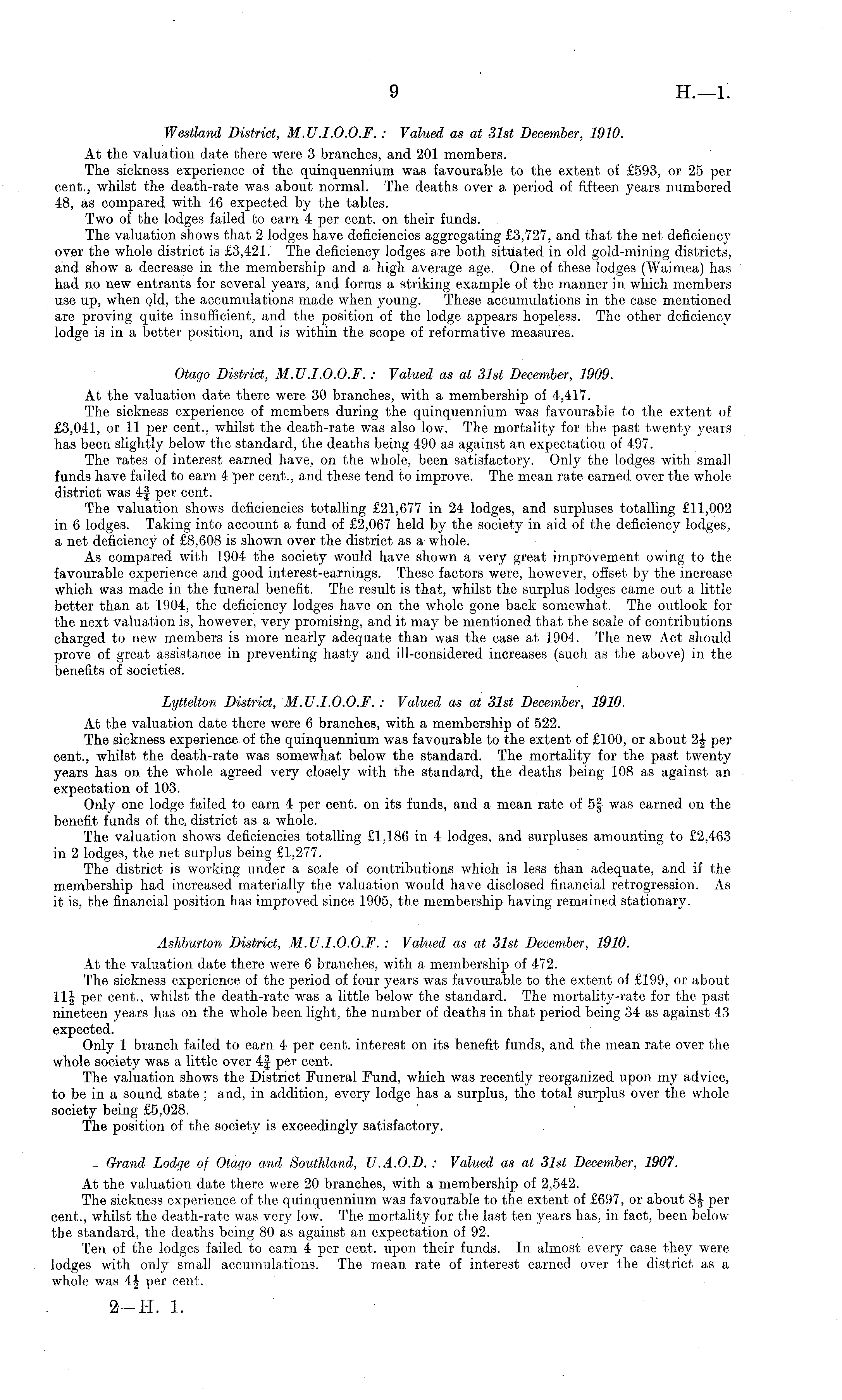 Westland District, M.U.1.0.0.F.: Valued as at 31st December, 1910. At the valuation date there were 3 branches, and 201 members. The sickness experience of the quinquennium was favourable to the extent of £593, or 25 per cent., whilst the death-rate was about normal. The deaths over a period of fifteen years numbered 48, as compared with 46 expected by the tables. Two of the lodges failed to earn 4 per cent, on their funds. The valuation shows that 2 lodges have deficiencies aggregating £3,727, and that the net deficiency over the whole district is £3,421. The deficiency lodges are both situated in old gold-mining districts, and show a decrease in the membership and a high average age. One of these lodges (Waimea) has had no new entrants for several years, and forms a striking example of the manner in which members use up, when old, the accumulations made when young. These accumulations in the case mentioned are proving quite insufficient, and the position of the lodge appears hopeless. The other deficiency lodge is in a better position, and is within the scope of reformative measures. Otago District, M.U.1.0.0.F. : Valued as at 31st December, 1909. At the valuation date there were 30 branches, with a membership of 4,417. The sickness experience of members during the quinquennium was favourable to the extent of £3,041, or 11 per cent., whilst the death-rate was also low. The mortality for the past twenty years has been slightly below the standard, the deaths being 490 as against an expectation of 497. The rates of interest earned have, on the whole, been satisfactory. Only the lodges with small funds have failed to earn 4 per cent., and these tend to improve. The mean rate earned over the whole district was 4f per cent. The valuation shows deficiencies totalling £21,677 in 24 lodges, and surpluses totalling £11,002 in 6 lodges. Taking into account a fund of £2,067 held by the society in aid of the deficiency lodges, a net deficiency of £8,608 is shown over the district as a whole. As compared with 1904 the society would have shown a very great improvement owing to the favourable experience and good interest-earnings. These factors were, however, offset by the increase which was made in the funeral benefit. The result is that, whilst the surplus lodges came out a little better than at 1904, the deficiency lodges have on the whole gone back somewhat. The outlook for the next valuation is, however, very promising, and it may be mentioned that the scale of contributions charged to new members is more nearly adequate than was the case at 1904. The new Act should prove of great assistance in preventing hasty and ill-considered increases (such as the above) in the benefits of societies. Lyttelton District, M.U.1.0.0.F. : Valued as at 31st December, 1910. At the valuation date there were 6 branches, with a membership of 522. The sickness experience of the quinquennium was favourable to the extent of £100, or about 2| per cent., whilst the death-rate was somewhat below the standard. The mortality for the past twenty years has on the whole agreed very closely with the standard, the deaths being 108 as against an expectation of 103. Only one lodge failed to earn 4 per cent, on its funds, and a mean rate of 5f was earned on the benefit funds of the. district as a whole. The valuation shows deficiencies totalling £1,186 in 4 lodges, and surpluses amounting to £2,463 in 2 lodges, the net surplus being £1,277. The district is working under a scale of contributions which is less than adequate, and if the membership had increased materially the valuation would have disclosed financial retrogression. As it is, the financial position has improved since 1905, the membership having remained stationary. Ashburton District, M.U.1.0.0.F. : Valued as at 31st December, 1910. At the valuation date there were 6 branches, with a membership of 472. The sickness experience of the period of four years was favourable to the extent of £199, or about 11| per cent., whilst the death-rate was a little below the standard. The mortality-rate for the past nineteen years has on the whole been light, the number of deaths in that period being 34 as against 43 expected. Only 1 branch failed to earn 4 per cent, interest on its benefit funds, and the mean rate over the whole society was a little over 4f per cent. The valuation shows the District Funeral Fund, which was recently reorganized upon my advice, to be in a sound state ; and, in addition, every lodge has a surplus, the total surplus over the whole society being £5,028. The position of the society is exceedingly satisfactory. - Grand Lodge of Otago and Southland, U.A.O.D. : Valued as at 31st December, 1907. At the valuation date there were 20 branches, with a membership of 2,542. The sickness experience of the quinquennium was favourable to the extent of £697, or about per cent., whilst the death-rate was very low. The mortality for the last ten years has, in fact, been below the standard, the deaths being 80 as against an expectation of 92. Ten of the lodges failed to earn 4 per cent, upon their funds. In almost every case they were lodges with only small accumulations. The mean rate of interest earned over the district as a whole was 4J per cent.