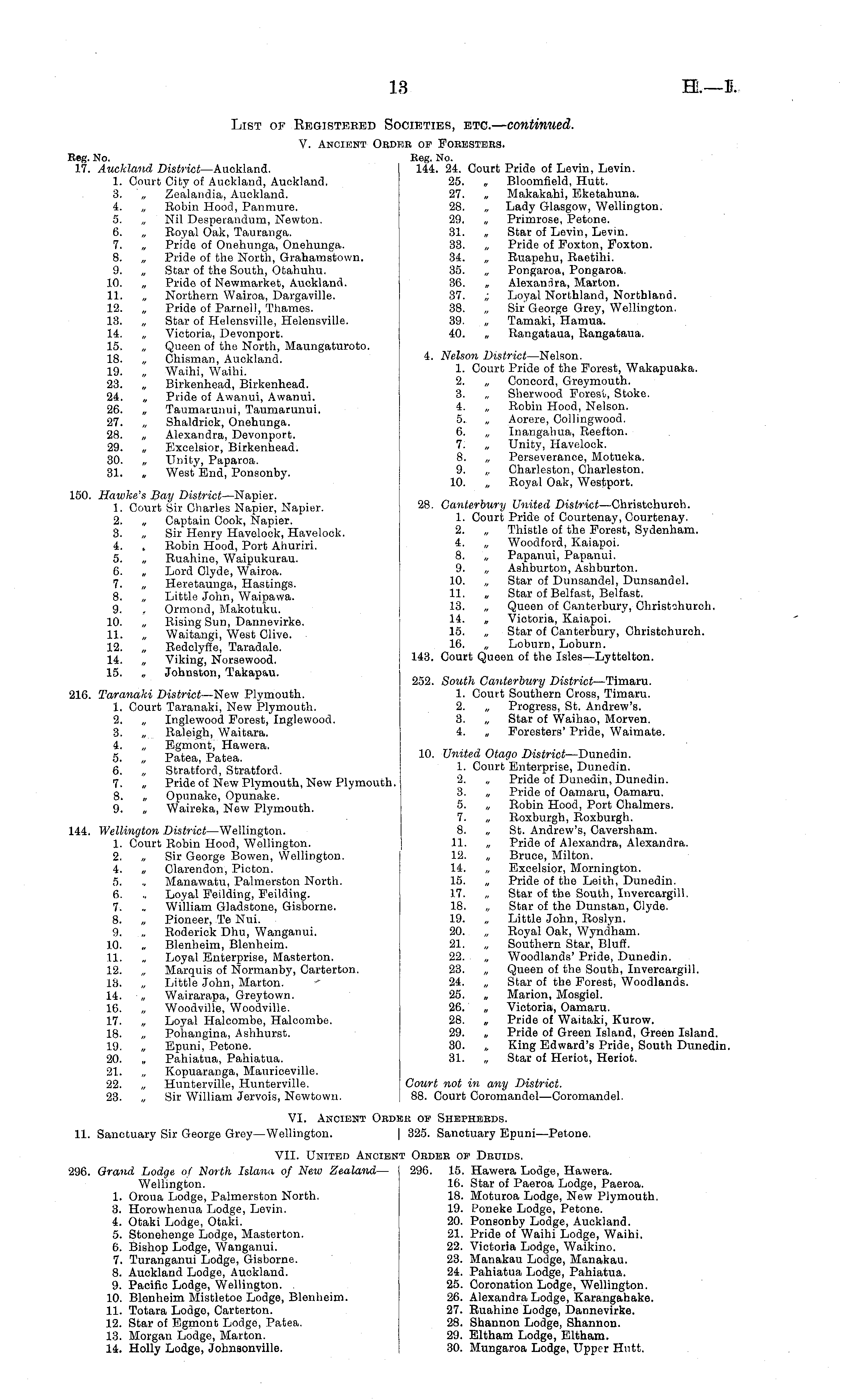 List of Registered Societies, etc. — continued. V. Ancient Order of Foresters. Reg. No. Reg. No. 17. Auckland District —Auckland. 144. 24. Court Pride of Levin, Levin. 1. Court City of Auckland, Auckland. 25. „ Bloomfield, Hutt. 3. „ Zealandia, Auckland. 27. „ Makakahi, Eketahuna. 4. „ Robin Hood, Panmure. 28. „ Lady Glasgow, Wellington. 5. „ Nil Desperandum, Newton. 29. „ Primrose, Petone. 6. „ Royal Oak, Tauranga. 31. „ Star of Levin, Levin. 7. „ Pride of Onehunga, Onehunga. 33. „ Pride of Foxton, Foxton. 8. „ Pride of the North, Grahamstown. 34. „ Ruapehu, Raetihi. 9. „ Star of the South, Otahuhu. 35. „ Pongaroa, Pongaroa. 10. „ Pride of Newmarket, Auckland. 36. „ Alexandra, Marton. 11. „ Northern Wairoa, Dargaville. 37. ,; Loyal Northland, Northland. 12. „ Pride of Parnell, Thames. 38. „ Sir George Grey, Wellington. 13. „ Star of Helensville, Helensville. 39. „ Tamaki, Hamua. 14. „ Victoria, Devonport. 40. „ Rangataua, Rangataua. 15. „ Queen of the North, Maungaturoto. 18. „ Chisman, Auckland. *• Nelson District— -Nelson. 19. Waihi Waihi. 1- Court Pride of the Forest, Wakapuaka. 23! "„ Birkenhead, Birkenhead. 2 - « Concord, Greymouth. 24. „ Pride of Awanui, Awanui. 3 - » Sherwood Forest, Stoke. 26. „ Taumarunui, Taumarunui. i - » Robm H °° d . Nelson. 27. , Shaldrick, Onehunga. 5. „ Aorere, Collingwood. 28. „ Alexandra, Devonport. 6 - » Inangahua, Reefton. 29. „ Excelsior, Birkenhead. 7. „ Unity, Havelock. 30. „ Unity, Paparoa. 8 - » Perseverance, Motueka. 81. . West End, Ponsonby. 9 - » Charleston, Charleston. 10. „ Royal Oak, Westport. 150. Hawke's Bay District —Napier. 1. Court Sir Charles Napier, Napier. 28- Canterbury United District— Christchurch. 2. . Captain Cook, Napier. L Court Pride of Courtenay, Courtenay. 3. „ Sir Henry Havelock, Havelock. 2 - » Thistle of the Forest, Sydenham. 4. , Robin Hood, Port Ahuriri. 4- „ Woodford, Kaiapoi. 5. „ Ruahine, Waipukurau. 8 - . Papanui, Papanui. 6. „ Lord Clyde, Wairoa. 9 - » Ashburton, Ashburton. 7. „ Heretaunga, Hastings. 10- . Star of Dunsandel, Dunsandel. 8. „ Little John, Waipawa. »• » Star of Belfast, Belfast. 9. Ormond Makotuku. 13 . » Queen of Canterbury, Christchurch. lo! '„ Rising Sun, Dannevirke. 14 - » Victoria, Kaiapoi. 11. „ Waitangi, West Clive. IS. „ Star of Canterbury, Christchurch. 12. „ Redclyfie, Taradale. 16. , Loburn, Loburn. 14. „ Viking Norsewood. \4&. Court Queen of the Isles—Lyttelton. 15. „ Johnston, Takapau. , _ , _. _. 202. South Canterbury District —Timaru. 216. Taranaki District —New Plymouth. 1. Court Southern Cross, Timaru. 1. Court Taranaki, New Plymouth. 2. „ Progress, St. Andrew's. 2. „ Inglewood Forest, Inglewood. 3. „ Star of Waihao, Morven. 3. „ Raleigh, Waitara. 4. „ Foresters' Pride, Waimate. 4. „ Egmont, Hawera. 5. Patea Patea *■"■ United Otago District —Dunedin. 6. "„ Stratford, Stratford. l - Court Enterprise, Dunedin. 7. „ Pride of New Plymouth, New Plymouth. 2 - » Prlde of Duneam, Dunedin. 8. „ Opunake, Opunake. 3 - - Pride oi Oamaru, Oamaru. 9. . Waireka, New Plymouth. 5 - » Kobm Hoo<3 > Port Chalmers. 7. „ Roxburgh, Roxburgh. 144. Wellington District —Wellington. 8. „ St. Andrew's, Caversham. 1. Court Robin Hood, Wellington. 11. „ Pride of Alexandra, Alexandra. 2. „ Sir George Bowen, Wellington. 12. „ Bruce, Milton. 4. „ Clarendon, Picton. 14. „ Excelsior, Mornington. 5. .. Manawatu, Palmerston North. 15. „ Pride of the Leith, Dunedin. 6. ~ Loyal Feilding, Feilding. 17. „ Star of the South, Invercargill. 7. .. William Gladstone, Gisborne. 18. „ Star of the Dunstan, Clyde. 8. „ Pioneer, Te Nui. 19. „ Little John, Roslyn. 9. ~ Roderick Dhu, Wanganui. 20. „ Royal Oak, Wyndham. 10. „ Blenheim, Blenheim. 21. „ Southern Star, Bluff. 11. „ Loyal Enterprise, Masterton. 22. „ Woodlands' Pride, Dunedin. 12. „ Marquis of Normanby, Carterton. 23. „ Queen of the South, Invercargill. 13. „ Little John, Marton. 24. „ Star of the Forest, Woodlands. 14. „ Wairarapa, Greytown. 25. „ Marion, Mosgiel. 16. „ Woodville, Woodville. 26. „ Victoria, Oamaru. 17. „ Loyal Halcombe, Halcombe. 28. „ Pride of Waitaki, Kurow. 18. „ Pohangina, Ashhurst. 29. „ Pride of Green Island, Green Island. 19. „ Epuni, Petone. 30. „ King Edward's Pride, South Dunedin. 20. „ Pahiatua, Pahiatua. 31. „ Star of Heriot, Heriot. 21. „ Kopuaranga, Mauriceville. 22. „ Hunterville, Hunterville. Court not in any District. 23. „ Sir William Jervois, Newtown. 88. Court Coromandel—Coromandel. VI. Ancient Order of Shepherds. 11. Sanctuary Sir George Grey—Wellington. | 325. Sanctuary Epuni—Petone. VII. United Ancient Order of Druids. 296. Grand Lodge of North Islana of New Zealand — 296. 15. Hawera Lodge, Hawera. Wellington. 16. Star of Paeroa Lodge, Paeroa. 1. Oroua Lodge, Palmerston North. 18. Moturoa Lodge, New Plymouth. 3. Horowhenua Lodge, Levin. 19. Poneke Lodge, Petone. 4. Otaki Lodge, Otaki. 20. Ponsonby Lodge, Auckland. 5. Stonehenge Lodge, Masterton. 21. Pride of Waihi Lodge, Waihi. 6. Bishop Lodge, Wanganui. 22. Victoria Lodge, Waikino. 7. Turanganui Lodge, Gisborne. 23. Manakau Lodge, Manakau. 8. Auckland Lodge, Auckland. 24. Pahiatua Lodge, Pahiatua. 9. Pacific Lodge, Wellington. . 25. Coronation Lodge, Wellington. 10. Blenheim Mistletoe Lodge, Blenheim. 26. Alexandra Lodge, Karangahake. 11. Totara Lodge, Carterton. 27. Ruahine Lodge, Dannevirke. 12. Star of Egmont Lodge, Patea. 28. Shannon Lodge, Shannon. 13. Morgan Lodge, Marton. 29. Eltham Lodge, Eltham. 14. Holly Lodge, Johnsonville. 30. Mungaroa Lodge, Upper Hutt.