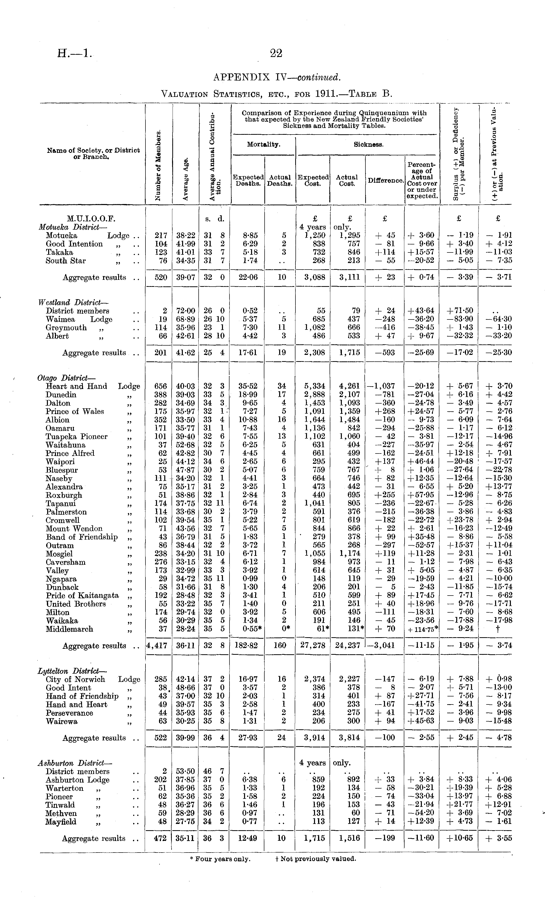 Name of Society, or District or Branch. i a ! 1 1 a ja a 3 ■3 a a a < CD Is Comparison of that expected 1 Sic: Morti lity. jixperience during Qi »y the New Zealand £ :ness and Mortality 1 Sic] uinquennium with 'riendly Societies' 'ables. mess. o a O '3 °S II CO 3 t> s o i is ■Lα S3 + > ! Expected Deaths. Actual Deaths. Expected Actual Cost. Cost. Difference. Percentage of Actual Cost over or under expected. M.U.I.O.O.F. Motueka District — Motueka Lodge .. Good Intention „ Takaka South Star s. d. £ 4 years 1,250 838 732 268 £ only. 1,295 757 846 213 £ £ £ 217 104 123 76 38-22 41-99 41-01 34-35 31 8 31 2 33 7 31 7 8-85 6-29 5-18 1-74 5 2 3 + 45 - 81 + 114 - 55 + 3-60 - 9-66 + 15-57 -20-52 - 1-19 + 3-40 -11-99 - 5-05 - 1-91 + 4-12 -11-03 - 7-35 Aggregate results .. 520 39-07 32 0 22-06 10 3,088 3,111 + 23 + 0-74 - 3-39 — 3-71 Westland District — District members Waimea Lodge Greymouth ,, Albert 2 19 114 66 72-00 68-89 35-96 42-61 26 0 26 10 23 1 28 10 0-52 5-37 7-30 4-42 5 U 3 55 685 1,082 486 79 437 666 533 + 24 -248 -416 + 47 +43-64 -36-20 -38-45 + 9-67 + 71-50 -83-90 + 1-43 -32-32 -64-30 - 1-10 -33-20 Aggregate results .. 201 41-62 25 4 17-61 19 2,308 1,715 -593 -25-69 -17-02 -25-30 Otago District — Heart and Hand Lodge Dunedin ,, Dalton „ Prince of Wales ,, Albion ,, Oamaru „ Tuapeka Pioneer ,, Waitahuna ,, Prince Alfred „ Waipori „ Bluespur ,, Naseby ,, Alexandra ,, Roxburgh ,, Tapanui „ Palmerston ,, Cromwell ,, Mount Wendon „ Band of Friendship ,, Outram ,, Mosgiel „ Caversham „ Valley Ngapara ,, Dunback „ Pride of Kaitangata „ United Brothers „ Milton Waikaka „ Middlemarch „ 656 388 282 175 352 171 101 37 62 25 53 111 75 51 174 114 102 71 43 86 238 276 173 29 58 192 55 174 56 37 40-03 39-03 34-69 35-97 33-50 35-77 39-40 52-68 42-82 44-12 47-87 34-20 35-17 38-86 37-75 33-68 39-54 43-56 36-79 38-44 34-20 33-15 32-99 34-72 31-66 28-48 33-22 29-74 30-29 28-24 32 3 33 5 34 3 32 1 33 4 31 1 32 6 32 5 30 7 34 6 30 2 32 1 31 2 32 1 32 11 30 2 35 1 32 7 31 5 32 2 31 10 32 4 33 3 35 11 31 8 32 3 35 7 32 0 35 5 35 5 35-52 18-99 9-65 7-27 10-88 7-43 7-55 6-25 4-45 2-65 5-07 4-41 3-25 2-84 6-74 3-79 5-22 5-65 1-83 3-72 6-71 6-12 3-92 0-99 1-30 3-41 1-40 3-92 1-34 0-55* 34 17 4 5 16 4 13 5 4 6 6 3 1 3 2 2 7 5 1 1 7 1 1 0 4 1 0 5 2 0* 5,334 2,888 1,453 1,091 1,644 1,136 1,102 631 661 295 759 664 473 440 1,041 591 801 844 • 279 565 1,055 984 614 148 206 510 211 606 191 61* 4,261 2,107 1,093 1,359 1,484 842 1,060 404 499 432 767 746 442 695 805 376 619 866 378 268 1,174 973 645 119 201 599 251 495 146 131* -1,037 -781 -360 + 268 -160 -294 - 42 -227 -162 + 137 + 8 + 82 - 31 +255 -236 -215 - 182 + 22 + 99 -297 + 119 - 11 + 31 - 29 - 5 + 89 + 40 - 111 - 45 + 70 -20-12 -27-04 -24-78 +24-57 - 9-73 -25-88 - 3-81 -35-97 -24-51 + 46-44 + 1-06 + 12-35 - 6-55 +57-95 -22-67--36-38 -22-72 + 2-61 + 35-48 -52-57 + 11-28 - 1-12 + 5-05 -19-59 - 2-43 + 17-45 + 18-96 -18-31 —23-56 + 114-75* + 5-67 + 6-16 - 3-49 - 5-77 - 6-09 - 1-17 -12-17 - 2-54 + 12-18 -20-48 ! -27-64 -12-64 + 5-20 -12-96 - 5-28 - 3-86 +23-78 -16-23 - 8-86 + 15-37 - 2-31 - 7-98 - 4-87 - 4-21 -11-85 - 7-71 - 9-76 - 7-60 -17-88 - 9-24 + 3-70 + 4-42 - 4-57 - 2-76 - 7-64 - 6-12 -14-96 - 4-67 + 7-91 1 —17-57 —22-78 -15-30 + 13-77 - 8-75 - 6-26 - 4-83 + 2-94 -12-49 - 5-58 + 11-04 - 1-01 - 6-43 - 6-35 -10-00 - 15-74 - 6-62 -17-71 - 8-68 -17-98 t - 3-74 Aggregate results .. 4,417 36-11 32 8 182-82 160 27,278 24,237 -3,041 -1115 - l>96 1 Lyttelton District— City of Norwich Lodge Good Intent ,, Hand of Friendship „ Hand and Heart „ Perseverance „ Wairewa ,, 285 38. 43 49 44 63 42-14 48-66 37-00 39-57 35-93 30-25 37 2 37 0 32 10 35 3 35 6 35 8 16-97 3-57 2-03 2-58 1-47 1-31 16 2 1 1 2 2 2,374 386 314 400 234 206 2,227 378 401 233 275 300 -147 - 8 + 87 -167 + 41 + 94 - 6-19 - 2-07 +27-71 -41-75 + 17-52 +45-63 + 7-88 + 5-71 - 7-56 - 2-41 - 3-96 - 9-03 + 6-98 -13-00 - 8-17 - 9-34 - 9-98 -15-48 Aggregate results .. 522 39-99 36 4 27-93 24 3,914 3,814 -100 - 2-55 + 2-45 - 4-78 AsJtburton District — District members Ashburton Lodge Warterton „ Pioneer „ Tinwald Methven ,, Mayfield „ 2 202 51 62 48 59 48 53-50 37-85 36-96 35-36 36-27 28-29 27-75 46 7 37 0 35 5 35 2 36 6 36 6 34 2 6-38 1-33 1-58 1-46 0-97 0-77 6 1 2 1 4 years 859 192 224 196 131 113 only. 892 134 150 J 153 60 127 + 33 - 58 i - 74 - 43 - 71 + 14 + 3-84 -30-21 -3304 -21-94 -54-20 + 12-39 + 8-33 + 19-39 + 13-97 + 21-77 + 3-69 + 4-73 + 4-06 + 5-28 + 6-88 + 12-91 - 7-02 - 1-61 Aggregate results .. 472 35-11 36 3 12-49 10 1,715 1,516 -199 -11-60 + 10-65 + 3-55 * Pour ■ears onl; t Not previously valued.
