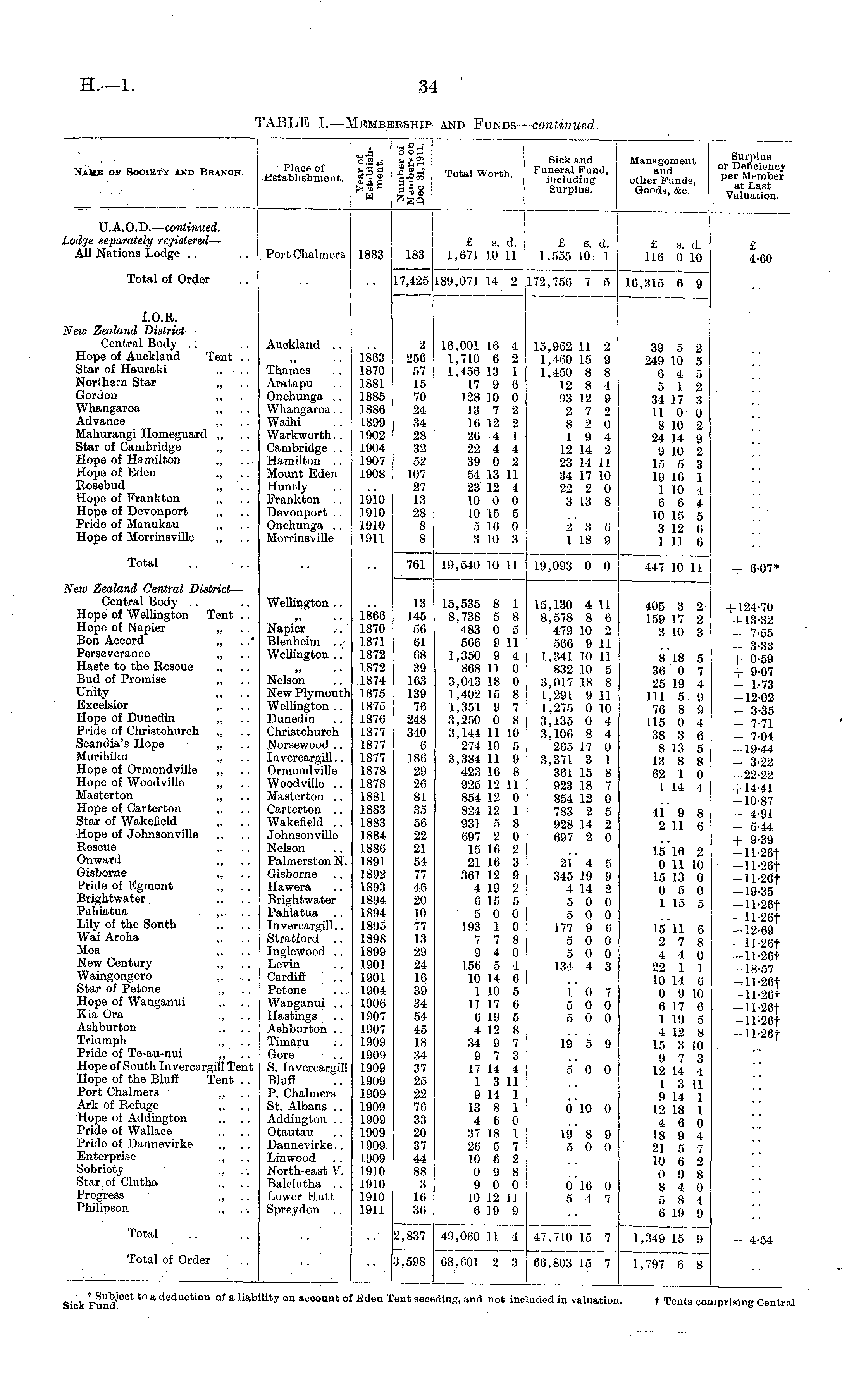 Name of Society and Bbanch. Place of Establishment. <H-3 d-= CD H 1-3 Hi" OOP IB II Total Worth. Sick and Funeral Fund, including Surplus. Management | 0I B £tZcy other Funds, I Per M*mber Goods, & e. I v^-'n . U. A. O.D.— continued. Lodge separately registered — All Nations Lodge £ s. d. 1,671 10 11 £ s. d. 1,555 10 1 £ s. d. 116 0 10 Port Chalmers 1883 183 £ - 4-60 Total of Order 17,425 189,071 14 2 172,756 7 5 16,315 6 9 I.O.R. New Zealand District — Central Body Hope of Auckland Tent .. Star of Hauraki ,. Northern Star „ Gordon „ Whangaroa ,, Advance Mahurangi Homeguard „ Star of Cambridge Hope of Hamilton Hope of Eden „ Rosebud „ Hope of Frankton ,, Hope of Devonport Pride of Manukau ,, Hope of Morrinsville Auckland .. Thames Aratapu Onehunga .. Whangaroa. . Waihi Warkworth. . Cambridge .. Hamilton Mount Eden Huntly Frankton Devonport .. Onehunga . . Morrinsville 1863 1870 1881 1885 1886 1899 1902 1904 1907 1908 2 256 57 15 70 24 34 28 32 52 107 27 13 28 8 8 16,001 16 4 1,710 6 2 1,456 13 1 17 9 6 128 10 0 13 7 2 16 12 2 26 4 1 22 4 4 39 0 2 54 13 11 23 12 4 10 0 0 10 15 5 5 16 0 3 10 3 15,962 11 2 1,460 15 9 1,450 8 8 12 8 4 93 12 9 2 7 2 8 2 0 1 9 4 12 14 2 23 14 11 34 17 10 22 2 0 3 13 8 39 5 2 249 10 5 6 4 5 5 1 2 34 17 3 11 0 0 8 10 2 24 14 9 9 10 2 15 5 3 19 16 1 1 10 4 6 6 4 10 15 5 3 12 6 1 11 6 1910 1910 1910 1911 2 3 6 1 18 9 Total 761 19,540 10 11 19,093 0 0 447 10 11 + 6-07* New Zealand Central District — Central Body Hope of Wellington Tent . . Hope of Napier ,, Bon Accord „ Perseverance Haste to the Rescue Bud of Promise „ Unity „ Excelsior ,, Hope of Dunedin ,, Pride of Christchurch Scandia's Hope Murihiku Hope of Ormondville Hope of Woodville ,, Masterton Hope of Carterton „ Star of Wakefield „ .. Hope of Johnsonville ,, Rescue „ Onward ,, Gisborne „ Pride of Egmont ,, Brightwater „ Pahiatua ,, Lily of the South ., Wai Aroha Moa New Century „ Waingongoro „ Star of Petone „ Hope of Wanganui ., Kia Ora „ Ashburton Triumph „ Pride of Te-au-nui „ Hope of South Invercargill Tent Hope of the Bluff Tent .. Port Chalmers „ .. Ark of Refuge ,, Hope of Addington Pride of Wallace „ Pride of Dannevirke ,, Enterprise „ Sobriety „ Star of Clutha ,, Progress „ Philipson „ Wellington .. Napier Blenheim .. Wellington .. Nelson New Plymouth Wellington .. Dunedin Christchurch Norsewood .. Invercargill.. Ormondville Woodville .. Masterton .. Carterton .. Wakefield .. Johnsonville Nelson Palmerston N. Gisborne Hawera Brightwater Pahiatua Invercargill.. Stratford .. Inglewood .. Levin Cardiff Petone Wanganui .. Hastings Ashburton .. Timaru Gore S. Invercargill Bluff P. Chalmers St. Albans .. Addington .. Otautau Dannevirke.. Linwood North-east V. Balclutha .. Lower Hutt Spreydon .. 1866 1870 1871 1872 1872 1874 1875 1875 1876 1877 1877 1877 1878 1878 1881 1883 1883 1884 1886 1891 1892 1893 1894 1894 1895 1898 1899 1901 1901 1904 1906 1907 1907 1909 1909 1909 1909 1909 1909 1909 1909 1909 1909 1910 1910 1910 1911 13 145 56 61 68 39 163 139 76 248 340 6 186 29 26 81 35 56 22 21 54 77 46 20 10 77 13 29 24 16 39 34 54 45 18 34 37 25 22 76 33 20 37 44 88 3 16 36 15,535 8 1 8,738 5 8 483 0 5 566 9 11 1.350 9 4 868 11 0 3,043 18 0 1,402 15 8 1.351 9 7 3,250 0 8 3,144 11 10 274 10 5 3,384 11 9 423 16 8 925 12 11 854 12 0 824 12 1 931 5 8 697 2 0 15 16 2 21 16 3 361 12 9 4 19 2 6 15 5 5 0 0 193 I 0 7 7 8 9 4 0 156 5 4 10 14 6 1 10 5 11 17 6 6 19 5 4 12 8 34 9 7 9 7 3 17 14 4 1 3 11 9 14 1 13 8 1 4 6 0 37 18 1 26 5 7 10 6 2 0 9 8 9 0 0 10 12 11 6 19 9 15,130 4 11 8,578 8 6 479 10 2 566 9 11 1,341 10 11 832 10 5 3,017 18 8 1,291 9 11 1,275 0 10 3,135 0 4 3,106 8 4 265 17 0 3,371 3 1 361 15 8 923 18 7 854 12 0 783 2 5 928 14 2 697 2 0 21 4 5 345 19 9 4 14 2 5 0 0 5 0 0 177 9 6 5 0 0 5 0 0 134 4 3 405 3 2 159 17 2 3 10 3 8 18 5 36 0 7 25 19 4 111 5. 9 76 8 9 115 0 4 38 3 6 8 13 5 13 8 8 62 1 0 1 14 4 41 9 8 2 11 6 15 16 2 0 11 10 15 13 0 0 5 0 1 15 5 + 124-70 + 13-32 - 7-55 - 3-33 + 0-59 + 9-07 - 1-73 -12-02 - 3-35 - 7-71 - 7-04 -19-44 - 3-22 -22-22 + 14-41 -10-87 - 4-91 - 5-44 + 9-39 -ll-26f -ll-26t -11-26-f -19-35 -ll-26f -11-26-f--12-69 -ll-26t - ll-26f -18-57 -11-26J -ll-26t -ll-26f -11-26-f -11-26-f" 1 0 7 5 0 0 5 0 0 19' 5 9 5 0 0 15 11 6 2 7 8 4 4 0 22 1 1 10 14 6 0 9 10 6 17 6 1 19 5 4 12 8 15 3 10 9 7 3 12 14 4 1 3 11 9 14 1 12 18 1 4 6 0 18 9 4 21 5 7 10 6 2 0 9 8 8 4 0 5 8 4 6 19 9 6'10 0 19' 8 9 5 0 0 016 0 5 4 7 Total 2,837 49,060 11 4 47,710 15 7 1,349 15 9 - 4-54 Total of Order 3,598 68,601 2 3 66,803 15 7 1,797 6 8 * Subject to a deduction of a liabi ility on account oJ Eden 'ent seceding, and not included in valuation. lii t Tents comprising Centra]