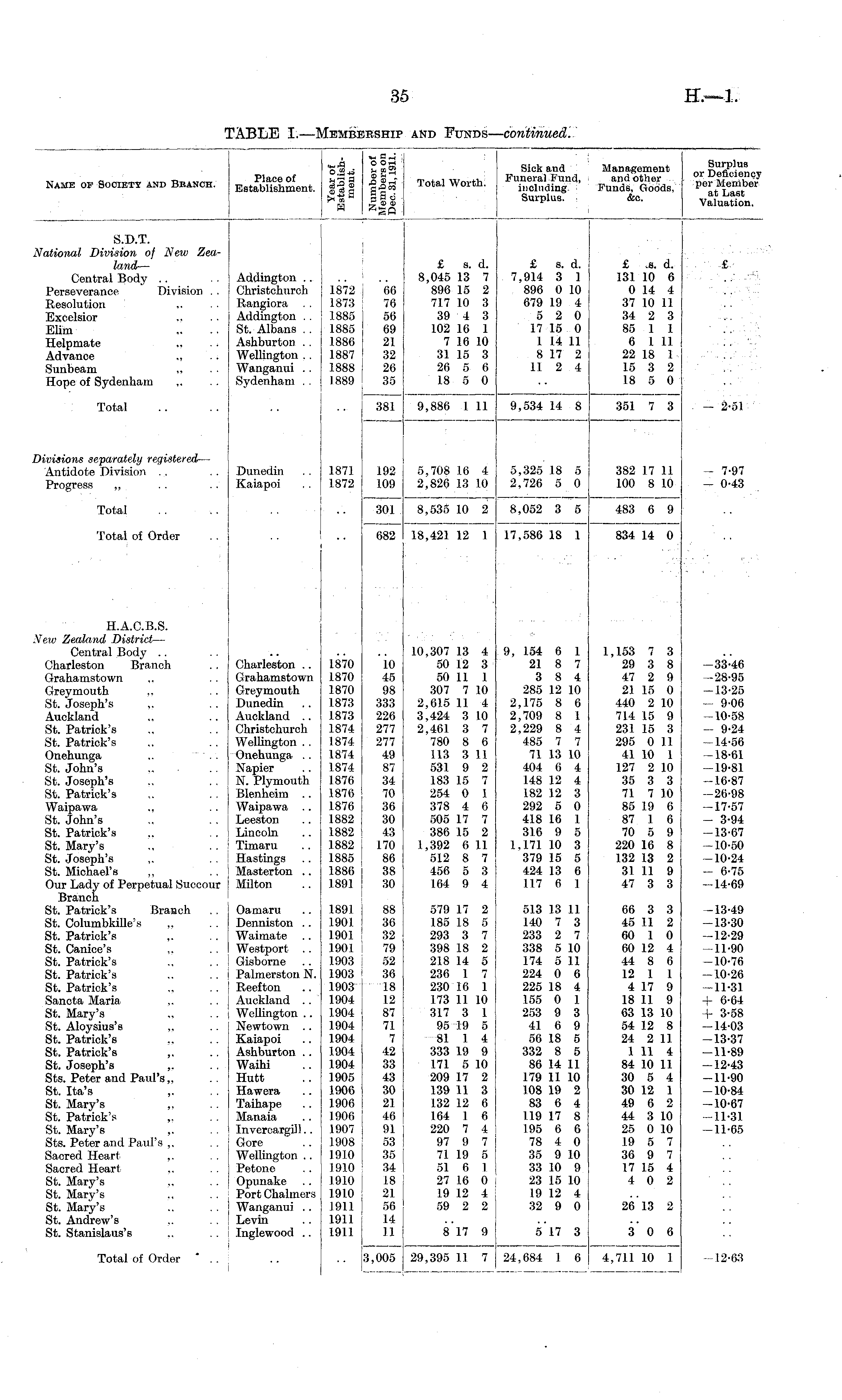 Name of Society and Bbanch. Place of Establishment. ■HH4 Ht en H >- "2 CD H I a !nII gSci ! £ CD CD ; Total Worth. Sick and Management Funeral Fund, and other including Funds, Goods, Surplus. &c. Surplus or Deficiency per Member at Last Valuation. S.D.T. National Division of New Zealand — Central Body Perseverance Division . . Resolution Excelsior Elim Helpmate „ Advance „ Sunbeam „ Hope of Sydenham Addington .. Christchurch Rangiora Addington . . St. Albans . . Ashburton .. Wellington .. Wanganui . . Sydenham . . 1872 1873 1885 1885 1886 1887 1888 1889 66 76 56 69 21 32 26 35 £ s. d. 8,045 13 7 896 15 2 717 10 3 39 4 3 102 16 1 7 16 10 31 15 3 26 5 6 18 5 0 £ s. d. 7,914 3 1 896 0 10 679 19 4 5 2 0 17 15 0 1 14 11 8 17 2 1.1 2 4 £ .s. d. 131 10 6 0 14 4 37 10 11 34 2 3 85 I 1 6 1 11 22 18 1 15 3 2 18 5 0 ; £- Total 381 9,886 1 11 9,534 14 8 351 7 3 - 2-51 Divisions separately registered — Antidote Division Progress „ Dunedin Kaiapoi 5,708 16 4 2,826 13 10 5,325 18 5 2,726 5 0 382 17 11 100 8 10 - 7-97 - 0-43 1871 1872 192 109 Total 301 8,535 10 2 8,052 3 5 483 6 9 Total of Order 682 18,421 12 1 1 17,586 18 1 834 14 0 H.A.C.B.S. .Veto Zealand District — Central Body Charleston Branch Grahamstown Greymouth ,, St. Joseph's Auckland St. Patrick's St. Patrick's Onehunga .. . . St. John's St. Joseph's St. Patrick's Waipawa ., St. John's St. Patrick's St. Mary's St. Joseph's St. Michael's ,, Our Lady of Perpetual Succour Branch St. Patrick's Branch St. Columbkille's St. Patrick's St. Canice's St. Patrick's St. Patrick's St. Patrick's ., Sancta Maria St. Mary's St. Aloysius's St. Patrick's St. Patrick's St. Joseph's ,. Sts. Peter and Paul's,. St. Ita's St. Mary's St. Patrick's St. Mary's ,. Sts. Peter and Paul's ,, Sacred Heart ,. Sacred Heart St. Mary's St. Mary's St. Mary's St. Andrew's St. Stanislaus's ,. Charleston .. Grahamstown Greymouth Dunedin Auckland .. Christchurch Wellington . . Onehunga .. Napier N. Plymouth Blenheim .. Waipawa .. Leeston Lincoln Timaru Hastings Masterton .. Milton Oamaru Denniston .. Waimate Westport Gisborne Palmerston N. Reefton Auckland .. Wellington .. Newtown .. Kaiapoi Ashburton .. Waihi Hutt Hawera Taihape Manaia Invercargill.. Gore Wellington .. Petone Opunake Port Chalmers Wanganui .. Levin Inglewood .. 1870 1870 1870 1873 1873 1874 1874 1874 1874 1876 1876 1876 1882 1882 1882 1885 1886 1891 1891 1901 1901 1901 1903 1903 1903 1904 1904 1904 1904 1904 1904 1905 1906 1906 1906 1907 1908 ]910 1910 1910 1910 1911 1911 1911 i 10 45 98 333 226 277 277 49 87 34 70 36 30 43 170 86 I 38 30 i 88 36 32 79 52 36 18 12 87 71 7 42 33 43 30 21 46 91 53 35 34 18 21 56 14 11 10,307 13 4 50 12 3 50 11 1 307 7 10 2,615 11 4 3,424 3 10 2,461 3 7 780 8 6 113 3 11 531 9 2 183 15 7 254 0 1 378 4 6 505 17 7 386 15 2 1,392 6 11 512 8 7 456 5 3 164 9 4 579 17 2 185 18 5 293 3 7 398 18 2 218 14 5 236 1 7 230 16 1 173 11 10 317 3 1 95 19 5 81 1 4 333 19 9 171 5 10 209 17 2 139 11 3 132 12 6 164 1 6 220 7 4 1 97 9 7 I 71 19 5 I 51 6 1 ; 27 16 0 I 19 12 4 ; 59 2 2 9, 154 6 1 21 8 7 3 8 4 285 12 10 2,175 8 6 2,709 8 1 2,229 8 4 485 7 7 71 13 10 404 6 4 148 12 4 182 12 3 292 5 0 418 16 1 316 9 5 1,171 10 3 379 15 5 424 13 6 117 6 1 513 13 11 140 7 3 233 2 7 338 5 10 174 5 11 224 0 6 225 18 4 155 0 1 253 9 3 41 6 9 56 18 5 332 8 5 86 14 11 179 11 10 108 19 2 83 6 4 119 17 8 195 6 6 78 4 0 35 9 10 33 10 9 23 15 10 19 12 4 32 9 0 1,153 7 3 29 3 8 47 2 9 21 15 0 440 2 10 714 15 9 231 15 3 295 on 41 10 1 127 2 10 35 3 3 71 7 10 85 19 6 87 1 6 70 5 9 220 16 8 132 13 2 31 11 9 47 3 3 66 3 3 45 11 2 60 1 0 60 12 4 44 8 6 12 1 1 4 17 9 18 11 9 63 13 10 54 12 8 24 2 11 1 11 4 84 10 11 30 5 4 30 12 1 49 6 2 44 3 10 25 0 10 19 5 7 36 9 7 17 15 4 4 0 2 -33-46 -28-95 -13-25 - 9-06 -10-58 - 9-24 -14-56 -18-61 -19-81 -16-87 -26-98 -17-57 - 3-94 -13-67 -10-50 -10-24 - 6-75 -14-69 -13-49 -13-30 -12-29 -11-90 -10-76 -10-26 -11-31 + 6-64 + 3-58 -14-03 -13-37 -11-89 -12-43 -11-90 -10-84 -10-67 -11-31 -11-65 26 13 2 8 17 9 5 17 3 3 0 6 Total of Order " . . 3,005 29,395 11 7 24,684 1 6 4,711 10 1 -12-63