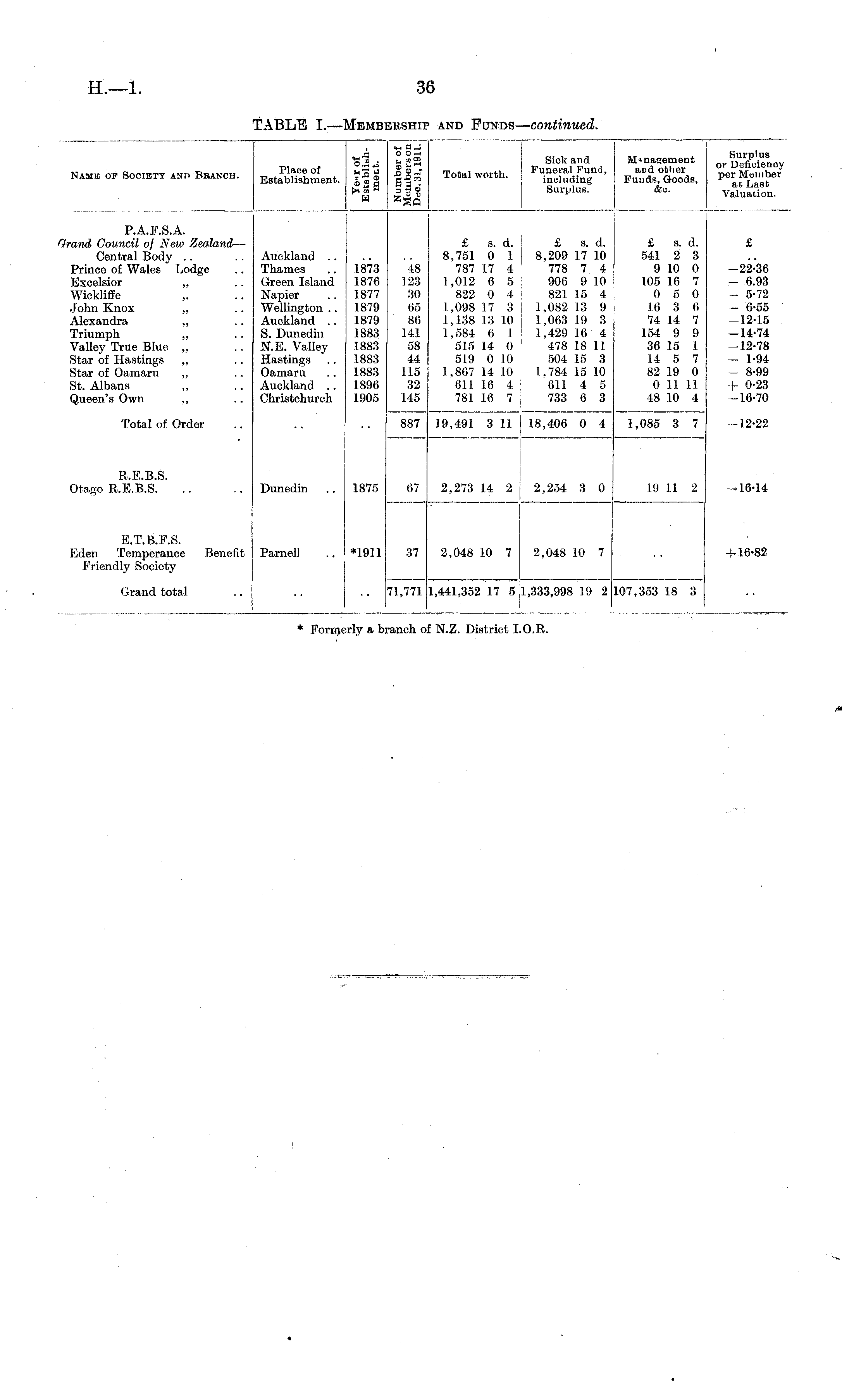 Namk of Society and Bbanch. Place of Establishment. i-^ T H ffl cogd H O Oh Ij en 2 JJ-- = 3 U " ~ 9 v Sick and Total worth. : Surplus. orSi'eney and other Mmnhnr Funds Goods, Valuation. P.A.F.S.A. 'rand Council of New Zealand — Central Body Prince of Wales Lodge Excelsior ,, Wickliffe ,, John Knox „ Alexandra „ Triumph „ Valley True Blue „ Star of Hastings „ Star of Oamaru „ St. Albans ,, Queen's Own Auckland .. Thames Green Island Napier Wellington .. Auckland .. S. Dunedin N.E. Valley Hastings Oamaru Auckland .. Christchurch 1873 1876 1877 1879 1879 1883 1883 1883 1883 1896 1905 48 123 30 65 86 141 58 44 115 32 145 £ s. d. i £ s. d. 8,751 0 1 j 8,209 17 10 787 17 4 778 7 4 1,012 6 5 906 9 10 822 0 4 821 15 4 1,098 17 3 j 1,082 13 9 1,138 13 10 I 1,063 19 3 1,584 6 1 ! 1,429 16 4 515 14 0 : 478 18 11 519 0 10 504 15 3 1,867 14 10 1,784 15 10 611 16 4 611 4 5 781 16 7 733 6 3 £ s. d. £ 541 2 3 9 10 0 -22-36 105 16 7 - 6.93 0 5 0 - 5-72 16 3 6 - 6-55 74 14 7 -12-15 154 9 9 -14-74 36 15 1 -12-78 14 5 7 - 1-94 82 19 0 - 8-99 0 II 11 + 0-23 48 10 4 -16-70 Total of Order 887 19,491 3 11 18,406 0 4 1,085 3 7 -12-22 R.E.B.S. Otago R.E.B.S. Dunedin 1875 67 2,273 14 2 j 2,254 3 0 19 11 2 -16-14 E.T.B.F.S. Eden Temperance Benefit Friendly Society Parnell 2,048 10 7 2,048 10 7 + 16-82 •1911 37 Grand total 1,441,352 17 5'l,333,998 19 2 107,353 18 3 71,771 * Fori terl; >ranch if N.Z. District I.O.R.
