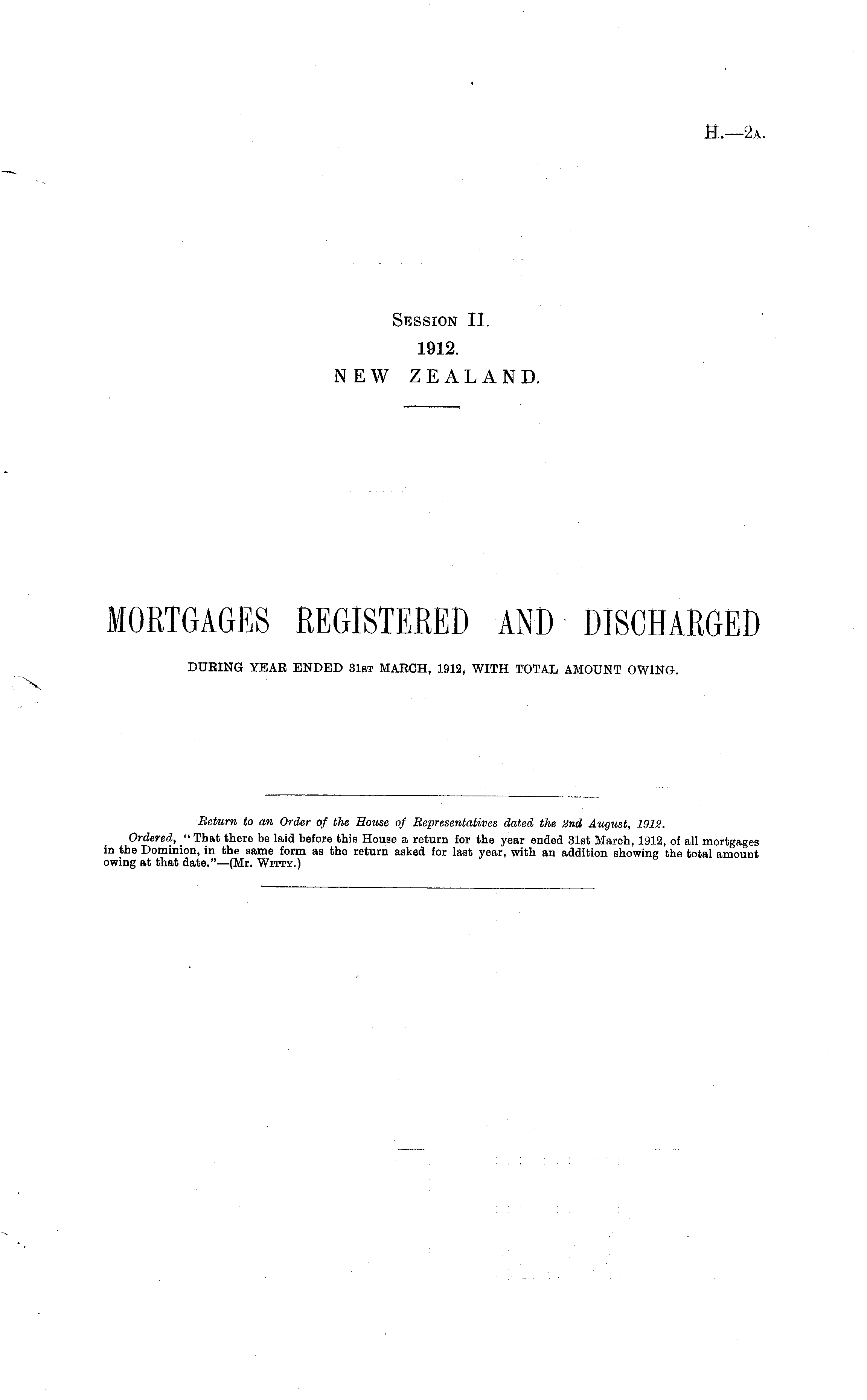 Return to an Order of the House of Representatives dated the 2nd August, 1912. Ordered, "That there be laid before this House a return for the year ended 31st March, 1912, of all mortgages in the Dominion, in the same form as the return asked for last year, with an addition showing the total amount owing at that date."—(Mr. Witty.)