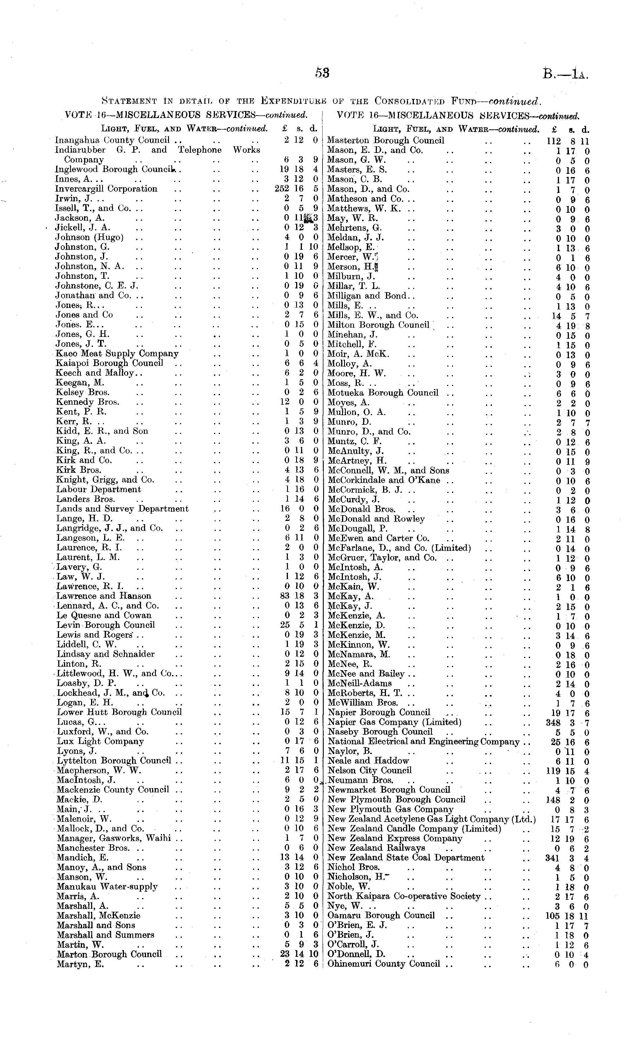 Statement in detail of the Expenditure of the Consolidated Fund — continued. VOTE 16—MISCELLANEOUS SERVlCES— continued. VOTE 16—MISCELLANEOUS SERVlCES— continued. Light, Fuel, and Watkb— continued. £ 8. d. Light, Fuel, and Water— continued. £ s. d. Inangahua County Council .. .. . . 212 0 i Masterton Borough Council .. .. 112 811 Indiarubber G. P. and Telephone Works Mason, E. D., and Co. .. .. .. 1 17 0 Company .. .. .. .. 6 3 9 Mason, 6. W. .. .. .. .. 0 5 0 Inglewood Borough Council.. .. .. 19 1.8 4 Masters, E. S. .. . . .. .. 0 16 6 Innes, A. .. .. .. .. .. 312 0 Mason, C. B. .. .. .. .. 117 0 Jlnvercargill Corporation .. . . .. 252 16 5 Mason, D., and Co. .. .. .. 17 0 Irwin, J. .. .. .. .. .. 2 7 0 Matheson and Co. .. .. .. .. 0 9 6 tssell, T., and Co. .. .. .. .. 0 5 9 Matthews, W. K. .. .. .. .. 010 0 Jackson, A. .. .. .. .. 0 May, W. R. .. .. .. .. 0 9 6 Jickell, J. A. .. .. .. .. 012 3 Mehrtens, G. .. .. .. .. 3 0 0 Johnson (Hugo) .. .. .. .. 4 0 0 Meldan, J. J. .. .. .. .. 010 0 Johnston, G. .. .. .. .. 1 110 Mellsop, E. .. .. .. .. 113 6 Johnston, J. . . . . .. .. 0 19 6 Mercer, W. .. .. .. .. 016 Johnston, N. A. .. . . . . .. 0 119 Merson, H.J .. .. .. 610 0 Johnston, T. . . .. .. . . 1 10 0 Milburn, J. .. .. .. 4 0 0 Johnstone, C. E. J. .. .. .. 0 19 0 Millar, T. L. .. .. .. .. 4 10 6 Jonathan and Co. .. .. .. .. 0 9 6 Milligan and Bond. . .. .. 0 5 0 Jones, R... .. .. .. .. 0 13 0 Mills, E. .. .. .. .. .. 1 13 0 Jones and Co .. .. .. .. 2 7 6 Mills, E. W., and Co. .. .. .. 14 5 7 Jones. E... .. .. .. .. 0 15 0 Milton Borough Council .. .. .. 419 8 Jones, G. H. .. .. .. .. 10 0 Minehan, J. .. .. .. .. 0 15 0 Jones, J. T. .. .. .. .. 0 5 0 Mitchell, F. .. .. .. .. 1 15 0 Kaeo Meat Supply Company .. .. 10 0 Moir, A. McK. .. .. .. .. 013 0 Kaiapoi Borough Council . . .. .. 6 6 4 Molloy, A. .. .. .. .. 0 9 6 Keech and Malloy.. .. .. .. 6 2 0 Moore, H. W. .. .. .. .. 3 0 0 Keegan, M. .. . . .. .. 15 0 Moss, R. .. .. . . . . .. 0 9 6 Kelsey Bros. .. .. .. .. 0 2 6 Motueka Borough Council .. .. .. 6 6 0 Kennedy Bros. .. .. .. .. 12 0 0 Moyes, A. .. .. .. .. 2 2 0 Kent, P. R. .. .. .. .. 15 9 Mullon, O. A. .. .. .. .. 110 0 Kerr, R. . . .. .. .. .. 13 9 Munro, D. .. .. .. .. 2 7 7 Kidd, E. R., and Son .. .. .. 013 0 Munro, D., and Co. . . .. .. 2 8 0 King, A. A. .. .. .. .. 3 6 0 Muntz, C. F. .. .. .. .. 012 6 King, R., and Co. .. .. .. .. 0 11 0 McAnulty, J. .. .. .. .. 0 15 0 Kirk and Co. .. .. .. .. 018 9 McArtney, H. .. .. .. 0 119 Kirk Bros. .. .. .. .. 413 6 McConnell, W. M., and Sons .. .. 0 3 0 Knight, Grigg, and Co. .. .. . . 4 18 0 McCorkindale and O'Kane . . .. .. 0 10 6 Labour Department .. .. .. 116 0 McCormick, B. J. .. .. ... .. 020 Landers Bros. .. .. .. .. 114 6 McCurdy, J. .. .. .. .. 112 0 Lands and Survey Department .. .. 16 0 0 McDonald Bros. .. .. .. ~ 3 6 0 Lange, H. D. .. .. . . . . 2 8 0 McDonald and Rowley .. .. .. 016 0 Langridge, J. J., and Co. .. .. .. 0 2 6 McDougall, P. .. ' .. .. 114 8 Langeson, L. E. .. .. . . .. 6 110 McEwen and Carter Co. .. .. .. 2 11 0 Laurence, R. I. . . .. .. 2 0 0 McFarlane, D., and Co. (Limited) .. .. 014 0 Laurent, L. M. .. .. .. .. 13 0 McGruer, Taylor, and Co. .. .. .. 112 0 Lavery, G. .. .. .. .. 10 0 Mclntosh, A. .. .. .. .. 0 9 6 Law, W. J. .. .. .. .. 112 6 Mclntosh, J. .. .. .. .. 610 0 Lawrence, R. I. .. .. .. .. 010 0 McKain, W. .. .. .. .. 2 16 Lawrence and Hanson .. .. . . 83 18 3 McKay, A. . . .. . . .. 10 0 Lennard, A. C, and Co. .. .. .. 013 6 McKay, J. .. .. .. .. 215 0 Le Quesne and Cowan .. .. .. 0 2 3 McKenzie, A. .. .. .. .. 17 0 Levin Borough Council .. .. .. 25 5 1 McKenzie, D. .. .. .. .. 010 0 Lewis and Rogers .. .. .. .. 019 3 McKenzie, M. .. .. .. .. 314 6 Liddell, C. W. .. .. .. .. 119 3 McKinnon, W. .. .. .. .. 0 9 6 Lindsay and Schnaider .. .. .. 012 0 McNamara, M. .. .. .. .. 018 0 Linton, R. . . .. .. .. 215 0 McNee, R. .. .. .. 216 0 Littlewood, H. W., and (J0... .. .. 914 0 McNee and Bailey .. .. .. .. 010 0 Loasby, D. P. . . .. .. .. 110 MoNeill-Adams .. .. .. .. 214 0 Lockhead, J. M., and, Co. .. .. .. 810 0 Mcßoberts, H. T. .. .. .. .. 4 0 0 Logan, E. H. .. .. .. .. 2 0 0 McWilliam Bros. .. .. ... 17 6 Lower Hutt Borough Council .. .. 15 7 1 Napier Borough Council .. .. .. 19 17 6 Lucas, G... .. .. .. .. 012 6 Napier Gas Company (Limited) .. .. 348 3 7 Luxford, W., and Co. .. .. .. 0 3 0 Naseby Borough Council .. .. .. 5 5 0 Lux Light Company .. .. .. 0 17 6 National Electrical and Engineering Company .. 25 16 6 Lyons, J. .. .. .. .. 7 6 0 Naylor, B. .. .. .... 011 0 Lyttelton Borough Council .. .. .. 11 15 1 Neale and Haddow .. .. .. 6 110 Macpherson, W.W. .. .. .. 217 6 Nelson City Council .. ... .. 119 15 4 Macintosh, J. .. .. .. .. 6 0 .Neumann Bros. .. .. .. .. 110 0 Mackenzie County Council .. . . .. 9 2 2 Newmarket Borough Council .. .. 4 7 6 Maekie, D. .. .. . . .. 2 5 0 New Plymouth Borough Council .. .. 148 2 0 Main, J. .. .. .. . . .. 016 3 New Plymouth Gas Company .. .. 0 8 3 Malenoir, W. .. .. .. .. 0129 New Zealand Acetylene Gas Light Company (Ltd.) .17 17 6 Mallock, D., and Co. .. .. . . 010 6 New Zealand Candle Company (Limited) .. 15 7 2 Manager, Gasworks, Waihi . . .. .. 17 0 New Zealand Express Company .. .. 12 19 6 Manchester Bros. .. .. . . .. 0 6 0 New Zealand Railways .. .. .. 0 6 2 Mandich, E. .. .. . . .. 13 14 0 New Zealand State Coal Department .. 341 3 4 Manoy, A., and Sons .. .. .. 312 6 Nichol Bros. .. .. .. .. 4 8 0 Manson, W. .. .. .. .. 010 0 Nicholson, H.~ .. .. .. .. 15 0 Manukau Water-supply .. .. .. 310 0 Noble, W. .. .. .. .. 118 0 Marris, A. .. .. .. .. 210 0 North Kaipara Co-operative Society .. .. 217 6 Marshall, A. .. .. .. .. 5 5 0 Nye, W. .. .. .. .. .. 3 6 0 Marshall, McKenzie .. .. .. 310 0 Oamaru Borough Council .. .. .. 105 18 11 Marshall and Sons .. .. .. 0 3 0 O'Brien, E. J. .. .. .. .. 117 7 Marshall and Summers .. .. .. 0 16 O'Brien, J. .. .. .. .. 118 0 Martin, W. .. .. .. .. 5 9 3 O'Carroll, J. .. .. .. .. 1 12 6 Marton