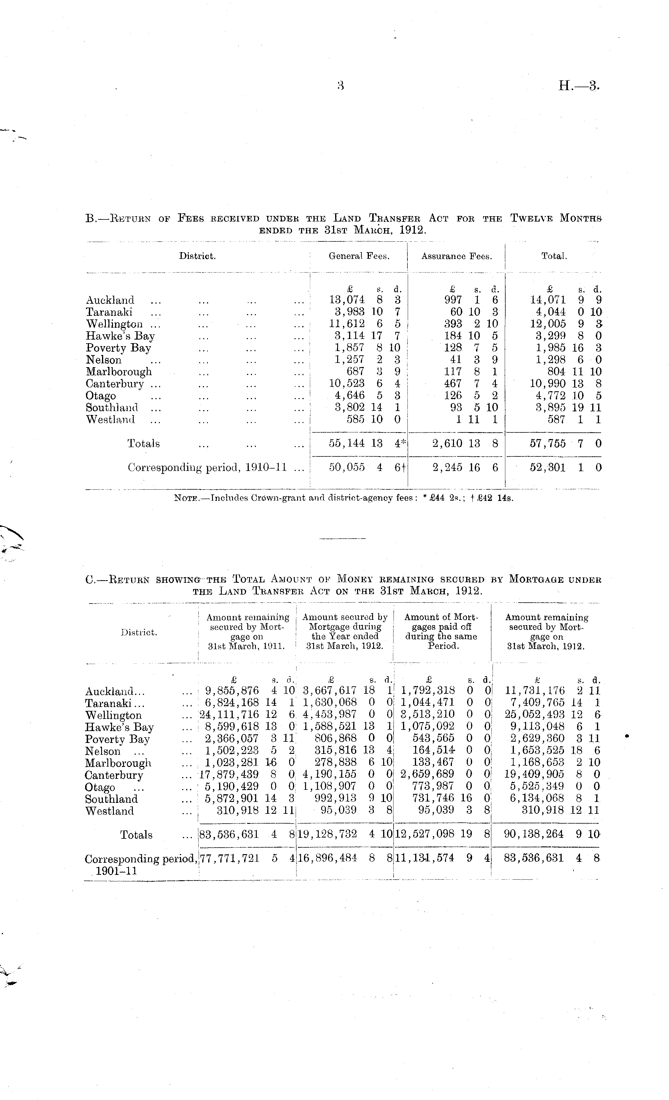 District. Amount remaining i Amount secured by secured by Mort- Mortgage during gage on the Year ended 31st March, 1911. ! 31st March, 1912. Amount of Mort- Amount remaining gages paid off secured by Mortduring the same gage on Period. 31st March, 1912. Auckland... Taranaki... Wellington Hawke's Bay Poverty Bay Nelson ... Marlborough Canterbury Otago Southland Westland £ s. d. £ s. d. ... 9,855,876 4 10 3,667,617 18 1' ... 6,824,168 14 1 1,630,068 0 0 ... 24,111,716 12 6 4.453,987 0 0 ... ! 8,599,618 13 0 1,588,521 13 1 ... 2,366,057 3 11 806,868 0 0 ... 1,502,223 5 2 315,816 13 4! ... 1,023,281 113 0 278,838 6 10 : ... 17,879,439 8 0 4,190,155 0 0 : ... 5,190,429 0 0, 1,108,907 0 0\ ... 5,872,901 14 3 992,913 9 10 310,918 12 111 95,039 3 8 £ s. d. £ s. d. 1,792,318 0 0: 11,731,176 2 11 1,044,471 0 0 : 7,409,765 14 1 3,513,210 0 0! 25,052,493 12 6 1,075,092 0 Ol 9,113,048 6 1 543,565 0 0 : 2,629,360 3 11 164,514 0 o: 1,653,525 18 6 133,467 0 0 1 1,168,653 2 10 : 2,659,689 0 0 ! 19,409,905 8 0 773,987 0 0 5,525,349 0 0 731,746 16 0 6,134,068 8 1 95,039 3 8 310,918 12 11 Totals Totals ... 83,536,631 4 819,128,732 4 10 12,527,098 19 8 90,138,264 9 10 Corresponding period, 77,771,721 1901-11 5 4!l6,896,484 8 8 11,131,574 9 4 83,536,631 4 8