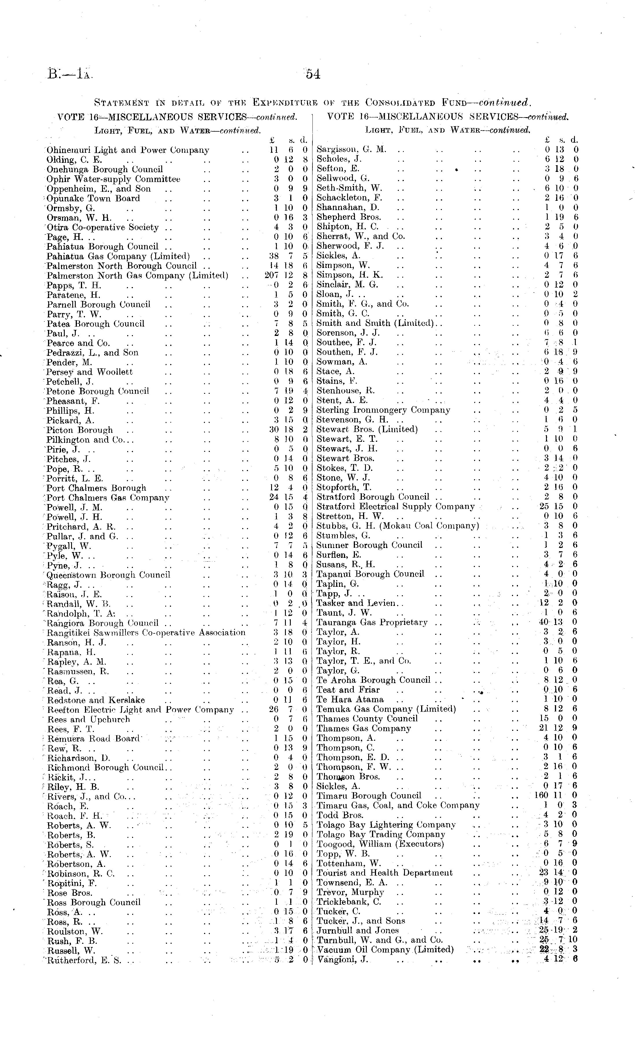 Statement i.x detail of the Expenditure of the Consolidated Fund— continued. VOTE 16—-MISCELLANEOUS SERVlCES— continued. VOTE Lβ—MISCELLANEOUS SERVlCES— continued. Lioht, KuEL, and Wateb— continued. Light, Fubl. and Water — continued, •i s. (1. £ s. (1. Ohinemuri Light and Power Company .. 11 6 0 Sargisson, G. M. .. .. .. .. 013 0 Olding, C. E. .. . . .. .. 012 8 Scholes, J. .. .. .. ..0120 Onehunga Borough Council . . .. 2 0 0 Sefton, E. .. ..... .. 318 0 Ophir Water-supply Committee .. .. I! 0 0 Sellwood, G. .. .. .. .. 0 !) 6 Oppenheim, E., and Son .. .. . . 0 9 9 Seth-Smith, W. .. . . .. ... 6 10 0 Opunake Town Board .. .. .. 3 10 Sehackleton, F. .. .. .. .. 216 0 Ormsby, G. .. ' .. .. .. I 10 0 Shannahan, l>. .. .. .. .. 10 0 Orsman, W. H. .. .. .. .. 016 3 Shepherd Bros. .. .. .. .. 1 19 6 Otira Co-operative Society .. .. .. 4 3 0 Shipton, H. C. .. .. . . .. 2 5 0 Page, H. .. .. .. .. .. 0 10 6 Sherrat, W., and Co. .. .. .. 3 4 0 Pahiatua Borough Council . . .. .. 110 0 Sherwood, ¥. J. . . .. . . 4 (i 0 Pahiatua Gas Company (Limited) .. .. 38 7 5 Sickles, A. .. .'. .. .. 017 6 Pahnerston North Borough Council . . .. 1 4 i S (i Simpson, VV". .. .. .. .. 4 7 6 Palmerston North Gas Company (Limited) .. 207 12 8 Simpson, H. K. .. .. .. . . 2 7 (i Papps, T. H. .. .. .. .. 0 2 (i Sinclair, M. G. .. .. .. . . 012 0 Pafatene, H. . . . . . . . . I r> 0 Sloan, .1. .. . . .. .. . . 0 10 2 Parnell Borough Council .. .. .. :i 2 0 Smith, F. G., and Co. .. .. .. 0 4 0 Parry, T. W. .. .. .. .. 0 9 0 Smith, G. C. .. .. .. .. 0 5 0 Patea Borough Council .. .. .. 7 8 5 Smith and Smith (Limited). . .. .. 0 8 0 Paul, J. .. .. .. .. .. 2 8 0 Sorenson, j. J. .. . . .. .. (i (i 0 Pearce and Co. .. .. .. 114 0 Southee, F. J. .. . . .. .. 7 8 1 Pedrazzi. L., and Son .. .. .. 0 10 0 Southen, I<\ J. .. .. ~ .. 6 18/9 Tender, M. .. .. .. .. I 10 0 Sowman, A. .. .. .. .. 0 4 (5 Persey and Woollett .. . . . . 018 (j Stace, A. .. .. .. .. 2 9 9 Petchell, J. . . . . . . . . 0 9 6 Stains, I". . . . . .. . . 0 lti 0 Petone Borough Council .. .. .. 719 4 Stenhouse, R. .. .. .. .. 2 0 0 Pheasant, F. ' .. .. .. .. 0 12 0 Stent, A. E. .. •.. .. .. 440 Phillips, H. .. .. .. .. 0 2 9 Sterling Ironmongery Company .. .. 0 2 5 Pickard, A. .. .. .. .. 315 Q Stevenson, G. R. .. .. .. . . 16 0 Picton Borough . . .. .. .. 30 18 2 Stewart Bros. (Limited) . . .. .. 5 9 1 Pilkington and C 0 ... .. .. .. 810 Q Stewart, E. T. .. .. .. .. 1 10 0 Pirie, J. .. .. .. .. .. 0 5 0 Stewart, J. H. .. .. .. .. 00 6 Pitches,.!. .. .. .. .. 0 14 0 Stewart Bros. .. .. .. .. 3 I+o Pope, R, .. .. .. .. .. 5 10 0 Stokes, T. D. .. .. .. .. 2.2 0 Porritt, L. E. .. .. .. .. 0 8 (i Stone, W. J. . . . . .. .. 410 0 Port Chalmers Borough .. ..- .. 12 4 0 Stopforth, T. .. .. .. .. 216 0 Port Chalmers Gas Company .. .. 24 15 4 Stratford Borough Council .. .. .. 2 8 0 Powell, ,I. M. .. '. . .. .. 015 0 Stratford Electrical Supply Company .. 25 15 0 Powell, J. H. .. .. .. .. 13 8 Stretton, E. W. .. .. .. .. 0 10 (i Pritchard, A. R. . . .. .. .. 4 2 0 Stubbs, G. H. (Mokau Coal Company) ..., 3 8 0 PuHar. J. and (J. .. .. .. .. 0 12 6 Stumbles, G. .. .. .. .. 13 6 Pygall, w. .. .. .. .. 7 7 5 Simmer Borough Council .. .. .. J 2 6 Pyle, W. .. .. .. .. .. t> 14 6 Surflen, E. .. .. .. .. 3 7 6 Pyne, J. .. . . . . . . . . 18 0 Susans, R.. H. . . . . . . .. 4 2 6 Qu'eeriatown Borough Council .. .. 3 10 3 Tapanui Borough Council .. .. .. 4 0 0 ■Ragg, J. .. .. .. .. .. 014 0 Taplin, G. .. .. .. .. 110 0 Raison. J. E. .. .. .. . . 10 0 Tapp, J. .. . . .. .. ... .. ' 2- 0 0 Randall, W. IS. .. .. .. .. 0 2 0 Tasker and Levien.. .. .. .. 12 2 0 Randolph, T. A: .. .. .. .. I 12 0 Taunt, J. VV. .. .. .. -. 10 6 Rahgibra Borough Council .. .. .. 7 114 Tauranga Gas Proprietary .. .. ~ 40 13 0 Rangiisikei Sawmillors Co-operative Association 3 18 0 Taylor, A. .. .. .. .. 3 2 6 Ranson, H. J. .. .. .. .. 2 10 0 Taylor, H. .. .. .. .. 3.0 0 Rapana, H. .. .. .. .. I 11 (i Taylor, R. .. .. .. . . 0 5 0 Rapley, A. M. .. .. .. .. 3 13 Q Taylor, T. E., and Co. .. .. .. 1 10 6 Rasnmssen, R. .. .. .. .. 2 0 0 Taylor, G. .. .. .. .. 0 6 0 Rea, G. .. .. .. .. .. 0 15 0 Te Aroha Borough Council .. .. .. 8 12 0 Read. J. . . .. .. . . 0 0 6, Teat and Friar . . .-■. .. 010 6 Redstone and Kerslake .. .. .. 011 6 Te Hara Atama .. .. * .. .. 1 10 0 Reefton Electric Light and Power Company .. 26 7 0 Temuka Gas Company (Limited) .. .. 812 6 Rees and Opchurch .. . . .. 0 7 (i ! Thames County Council .. .. .. 15 0 0 Rees, l> , . T. .. .. ,: .. 2 0 0 Thames Gas Company .. .. .. 21 12 9 Remuera Road Board .." .. .. I 15 0 Thompson, A. .. .. .. .. 4 10 0 Rew', R. .. .. .. .. .. 0 13 9 Thompson, C. .. .. .. .. 0106 Richardson,!). .. .. .. .. 0 4 0 Thompson, E. D. .. .. .. .. 3 16 Richmond Borough Council. . .. .. 2 0 0 Thompson, F. W. .. .. .. .. 2160 Rickit, ,1... .. .. .. ..280 Thomson Bros. .. .. .. .. 2 16 Riley, H. B. .. .. .. ... 3 8 0 Sickles, A. .. .. .. .. 0 17 6 Rivers, J., and C 0... .. .. .. 012 0 Timaru Borough Council .. .. .. 160 11 0 Roach, E. .. .. .'-. "--.-. 015 3 Timaru Gas, Coal, and Coke Company .. 10 3 Roach, F. H. .. : .. .. .. 015 0 Todd Bros. .. .. .'. .. 4 2 0 Roberts, A. VV. .. ■ .. .. .. 010 5 I Tolago Bay Lightering Company ... .. 310 0 Roberts, B. .. .. ~ .. 2 19 0 Tolago Bay Trading Company .. .. 5 8 0 Roberts, S. .. .. .. .. 0 10 Toogood, William (Executors) .. ~ 6 7 9 Roberts, A. W. .. .. .. .. OHi 0 Topp, W. B. .. .. .. .. : 0 5 0 Robertson, A. .. .. .. .. 014 6 Tottenham, VV. .. .. .. .. . 016 0 Robinson, R. C. .. .. .. .. 0 10 0 Tourist and Health Department .. .. 23 14 0 Rctpitini, F. .. .. .. .. 110 Townsend, E. A. .. .. .. .. 9 10 0 Rose Bros. .. " .. :. .. 0 7 9 Trevor, Murphy .. .. .. .. 0120 Ross Borough Council .. .. .. 110 Tricklebank, C. .. .. .. .... 312 0 Ross, A. .. .. .. .: .. 0 15 0 Tuoker, C. .. .. ....... 400 Ross, R. .. .. .. .. .. 18 6 Tucker, ,)., and Sons .. .. ... 14 7 6 Roulston. W. .. .. .. .. 3 17 6 Jurnhull and Jones