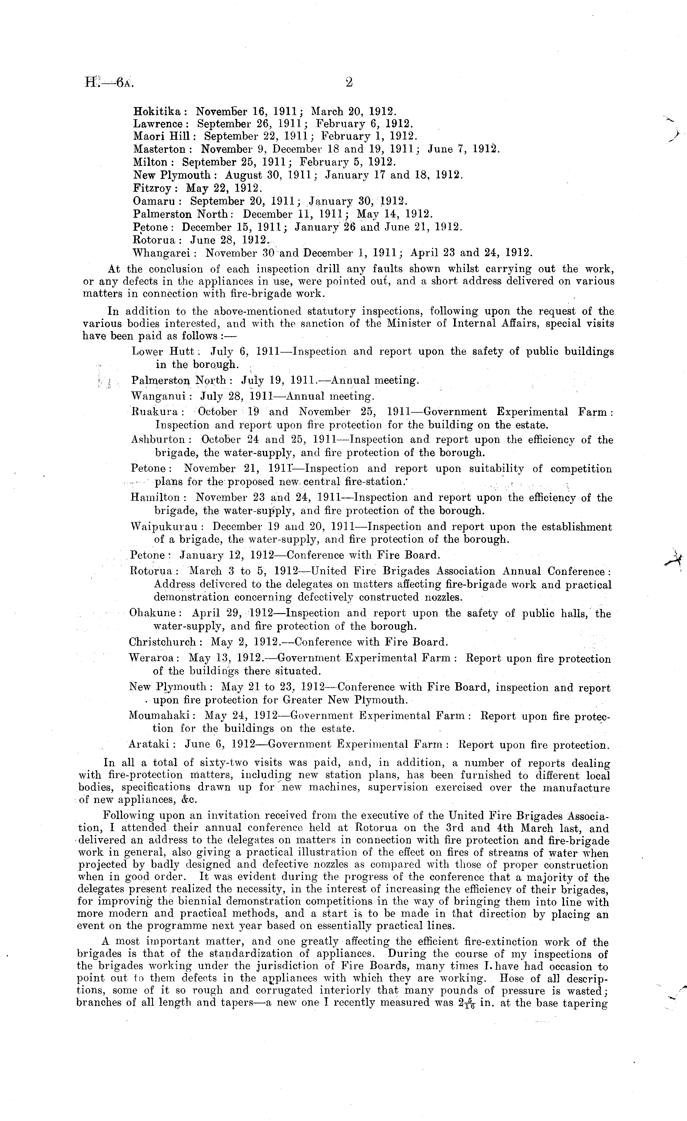 Hokitika: November 16, 1911; March 20, 1912. Lawrence: September 26, 1911; February 6, 1912. Maori Hill: September 22, 1911; February 1, 1912. Masterton : November 9, December 18 and 19, 1911; June 7, 1912. Milton: September 25, 1911; February 5, 1912. New Plymouth: August 30, 1911; January 17 and 18, 1912. Fitzroy: May 22, 1912. Oamaru : September 20, 1911; January 30, 1912. Palmerston North: December 11, 1911; May 14, 1912. Petone : December 15, 1911; January 26 and June 21, 1912. Rotorua : June 28, 1912. Whangarei : November 30 and December 1, 191.1; April 23 and 24, 1912. At the conclusion of each inspection drill any faults shown whilst carrying out the work, or any defects in the appliances in use, were pointed out, and a short address delivered on various matters in connection with fire-brigade work. In addition to the above-mentioned statutory inspections, following upon the request of the various bodies interested, and with the sanction of the Minister of Internal Affairs, special visits have been paid as follows : — Lower Hutt : July 6, 1911—Inspection and report upon the safety of public buildings in the borough. Palmerston North: July 19, 1911.—Annual meeting. Wanganui : July 28, 1911 —Annual meeting. Ruakura : October 19 and November 25, 1911—Government Experimental Farm: Inspection and report upon fire protection for the building on the estate. Ashburton : October 24 and 25, 1911—Inspection and report upon the efficiency of the brigade, the water-supply, and fire protection of the borough. Petone: November 21, 1911—Inspection and report upon suitability of competition - plans for the proposed new central fire-station.' , Hamilton : November 23 and 24, 1911—Inspection and report upon the efficiency of the brigade, the water-supply, and fire protection of the borough. Waipukurau : December 19 and 20, 1911—Inspection and report upon the establishment of a brigade, the water-supply, and fire protection of the borough. Petone: January 12, 1912 —Conference with Fire Board. Rotorua: March 3 to 5, 1912 —United Fire Brigades Association Annual Conference: Address delivered to the delegates on matters affecting fire-brigade work and practical demonstration concerning defectively constructed nozzles. Ohakune : April 29, 1912—Inspection and report upon the safety of public halls, the water-supply, and fire protection of the borough. Christchurch : May 2, 1912.—Conference with Fire Board. Weraroa : May 13, 1912. —Government Experimental Farm : Report upon fire protection of the buildings there situated. New Plymouth: May 21 to 23, 1912—Conference with Fire Board, inspection and report . upon fire protection for Greater New Plymouth. Moumahaki: May 24, 1912 —Government Experimental Farm : Report upon fire protection for the buildings on the estate. Arataki : June 6, I.9l2—Government Experimental Farm : Report upon fire protection. In all a total of sixty-two visits was paid, and, in addition, a number of reports dealing with fire-protection matters, including- new station plans, has been furnished to different local bodies, specifications drawn up for new machines, supervision exercised over the manufacture of new appliances, &c. Following upon an invitation received from the executive of the United Fire Brigades Association, I attended their annual conference held at Rotorua on the 3rd and 4th March last, and delivered an address to the delegates on matters in connection with fire protection and fire-brigade work in general, also giving a practical illustration of the effect on fires of streams of water when projected by badly designed and defective nozzles as compared with those of proper construction when in good order. It was evident during the progress of the conference that a majority of the delegates present realized the necessity, in the interest of increasing the efficiency of their brigades, for improving the biennial demonstration competitions in the way of bringing them into line with more modern and practical methods, and a start is to be made in that direction by placing an event on the programme next year based on essentially practical lines. A most important matter, and one greatly affecting the efficient fire-extinction work of the brigades is that of the standardization of appliances. During the course of my inspections of the brigades working under the jurisdiction of Fire Boards, many times I. have had occasion to point out to them defects in the appliances with which they are working. Hose of all descriptions, some of it so rough and corrugated interiorly that many pounds of pressure is wasted; branches of all length and tapers —a new one I recently measured was in. at the base tapering