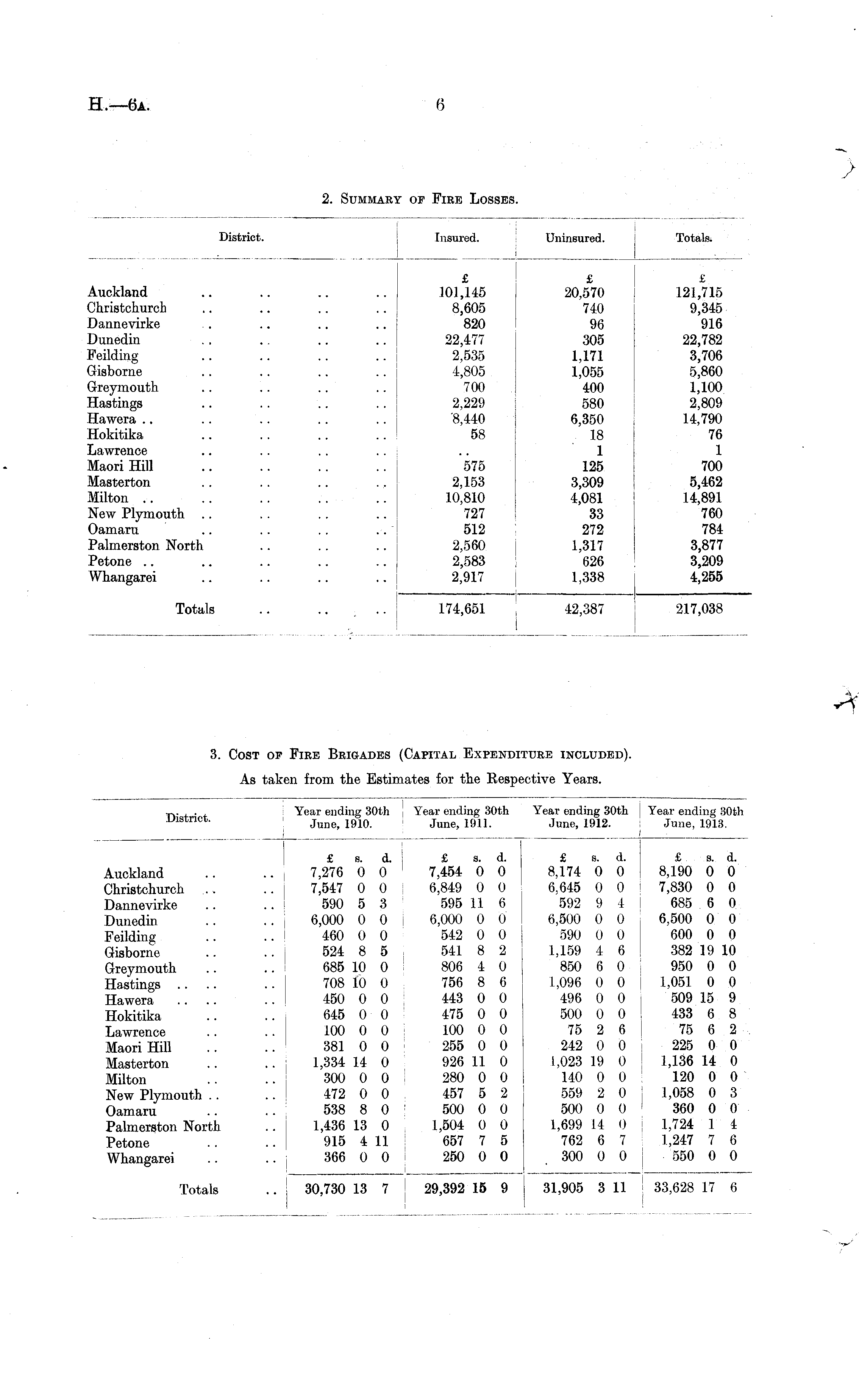 District. Insured. Uninsured. I Totals. Auckland Christchurch Dannevirke Dunedin Feilding Gisborne £ 101,145 8,605 820 22,477 2,535 4,805 700 2,229 '8,440 58 £ 20,570 740 96 305 1,171 1,055 400 580 6,350 18 1 125 3,309 4,081 33 272 1,317 626 1,338 £ 121,715 9,345 916 22,782 3,706 5,860 1,100 2,809 14,790 76 1 700 5,462 14,891 760 784 3,877 3,209 4,255 Greymouth Hastings Hawera Hokitika Lawrence Maori Hill Masterton Milton New Plymouth Oamaru Palmerston North Petone Whangarei 575 2,153 10,810 727 512 2,560 2,583 2,917 Totals 174,651 42,387 217,038