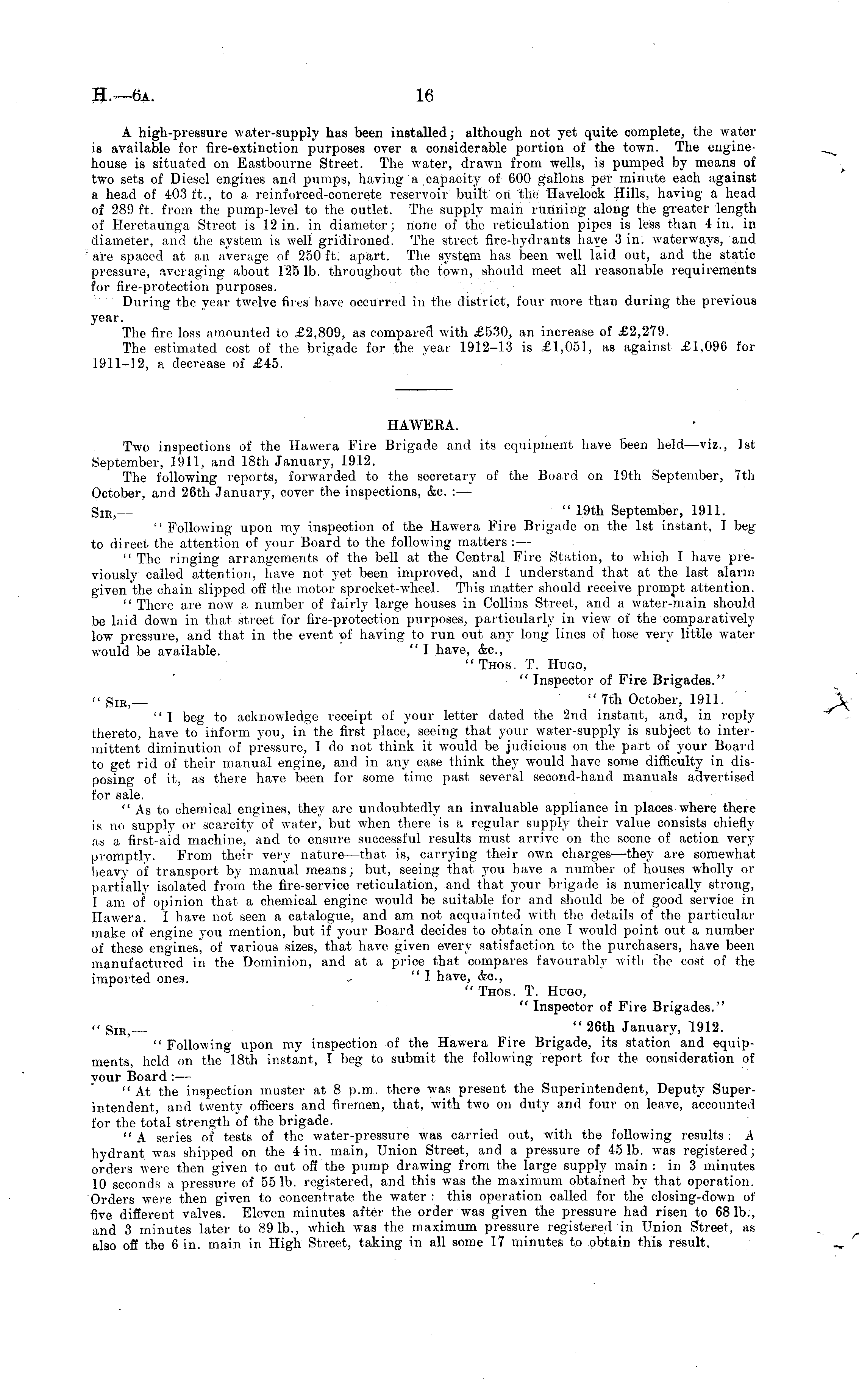 HAWERA. Two inspections of the Hawera Fire Brigade and its equipment have Been held —viz., Ist September, 1911, and 18th January, 1912. The following reports, forwarded to the secretary of the Board on 19th September, 7th October, and 26th January, cover the inspections, &c. : — Sir,— " 19th September, 1911. " Following upon my inspection of the Hawera B'ire Brigade on the Ist instant, I beg to direct the attention of your Board to the following matters : — " The ringing arrangements of the bell at the Central Fire Station, to which I have previously called attention, have not yet been improved, and I understand that at the last alarm given the chain, slipped off the motor sprocket-wheel. This matter should receive prompt attention. " There are now a number of fairly large houses in Collins Street, and a water-main should be laid down in that street for fire-protection purposes, particularly in view of the comparatively low pressure, and that in the event of having to run out any long lines of hose very little water would be available. " I have, &c, "Thos. T. Hugo, " Inspector of Fire Brigades." " Sir,— " 7fh October, 1911. " 1 beg to acknowledge receipt of your letter dated the 2nd instant, and, in reply thereto, have to inform you, in the first place, seeing that your water-supply is subject to intermittent diminution of pressure, I do not think it would be judicious on the part of your Board to get rid of their manual engine, and in any case think they would have some difficulty in disposing of it, as there have been for some time past several second-hand manuals advertised for sale. " As to chemical engines, they are undoubtedly an invaluable appliance in places where there is no supply or scarcity of water, but when there is a regular supply their value consists chiefly as a first-aid machine, and to ensure successful results must arrive on the scene of action very promptly. From their very nature —that is, carrying their own charges —they are somewhat heavy of transport by manual means; but, seeing that you have a number of houses wholly or partially isolated from the fire-service reticulation, and that your brigade is numerically strong, I am of opinion that a chemical engine would be suitable for and should be of good service in Hawera. I have not seen a catalogue, and am not acquainted with the details of the particular make of engine you mention, but if your Board decides to obtain one I would point out a number of these of various sizes, that have given every satisfaction to the purchasers, have been manufactured in the Dominion, and at a price that compares favourably with the cost of the imported ones. " I have, &c, "Thos. T. Hugo, " Inspector of Fire Brigades." "S IR ,_~ " 26th January, 1912. " Following upon my inspection of the Hawera Fire Brigade, its station and equipments held on the 18th instant, I beg to submit the following report for the consideration of your Board: — "At the inspection muster at 8 p.m. there was present the Superintendent, Deputy Superintendent, and twenty officers and firemen, that, with two on duty and four on leave, accounted for the total strength of the brigade. " A series of tests of the water-pressure was carried out, with the following results : A hydrant was shipped on the 4 in. main, Union Street, and a pressure of 45 lb. was registered ; orders were then given to cut off the pump drawing from the large supply main : in 3 minutes 10 seconds a pressure of 551b. registered, and this was the maximum obtained by that operation. Orders were then given to concentrate the water : this operation called for the closing-down of five different valves. Eleven minutes after the order was given the pressure had risen to 681b., and 3 minutes later to 891b., which was the maximum pressure registered in Union Street, as also off the 6 in. main in High Street, taking in all some 17 minutes to obtain this result,