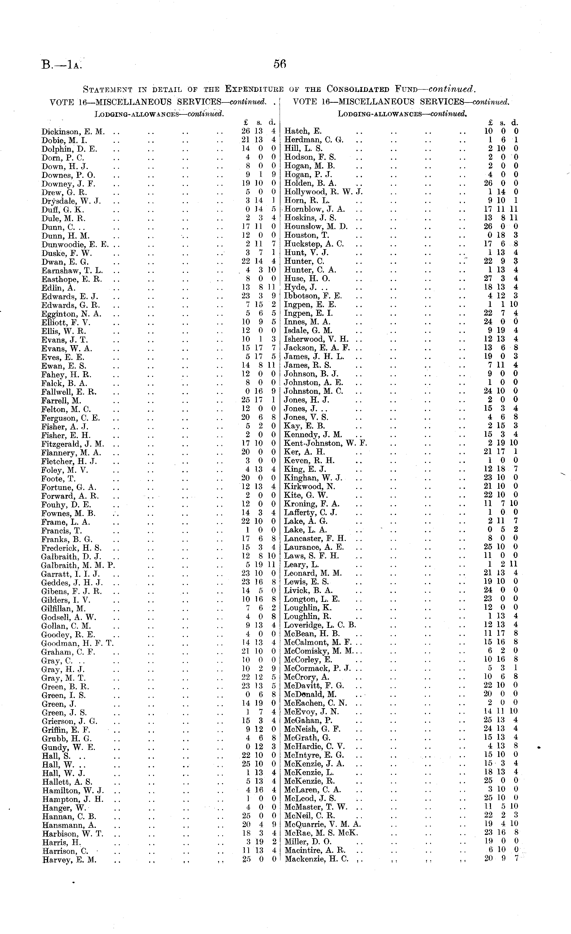 Statement in detail of the Expenditure of the Consolidated Fund— continued. VOTE 16—MISCELLANEOUS SERVlCES— continued. . \ VOTE 16—MISCELLANEOUS SERVlCES— continued. Lodging- allow as oes — continued. Lodging-allowances— continued. £ s. d. £ s. d. Dickinson, E. M. .. .. .. .. 26 13 4 Hatch, E. .. .. .. .. 10 0 0 Dobie, M. I. .. .. .. .. 21 13 4 Herdman, C. G. .. .. .. .. 16 1 Dolphin, D. E. .. . . .. . . 14 0 0 Hill, L. S. .. .. .. .. 210 0 Dorn, P. C. .. .. .. .. 4 0 0 Hodson, F. S. .. .. .. .. 2 0 0 Down, H. J. .. .. .. .. 8 0 0 Hogan, M. B. .. .. .. .. 2 0 0 Downes, P. O. .. .. . . .. 9 19 Hogan, P. J. .. .. .. .. 4 0 0 Downey, J. F. .. .. .. .. 19 10 0 Holden, B. A. .. .. .. .. 26 0 0 Drew, G. R. .. .. .. ■ ■ 5 0 0 Hollywood, R. W. J. .. .. .. 114 0 Drysdale, W. J. .. . . .. .. 314 ] Horn, R. L. .. .. .. .. 910 1 Duff, G. K. .. .. .. .. 014 5 Hornblow, J. A. .. .. .. .. 17 11 11 D'ule, M. R. . . .. .. .. 2 3 4 Hoskins, J. S. .. .. .. .. 13 811 Dunn, C. .. .. .. .. . • 17 110 Hounslow, M. D. .. .. .. .. 26 0 0 Dunn, H. M. .. .. .. .. 12 0 0 Houston, T. .. .. .. .. 018 3 Dunwoodie, E. E. . . .. .. .. 211 7 Huckstep, A. C. .. .. .. .. 17 6 8 Duske, F. W. .. .. .. • • 3 7 1 Hunt, V. J. .. .. .. .. 113 4 Dwan, E. G. .. .. .. .'. 22 14 4 Hunter, C. .. .. .. .." 22 9 3 Earnshaw, T. L. .. .. .. .. 4 310 Hunter, C. A. .. .. .. .. 113 4 Easthope, E. R. .. .. .. .. 8 0 0 Huse, H. O. .. .. .. .. 27 3 4 Edlin, A. .. .. .. .. 13 811 Hyde, J. .. .. .. .. .. 18 13 4 Edwards, E. J. .. .. .. 23 3 9 Ibbotson, F. E. .. .. .. 412 3 Edwards, G. R. .. .. .. • ■ 715 2 Ingpen, E. E. .. .. .. .. 1 110 Egginton, N. A. .. . . .. .. 5 6 5 Ingpen, E. I. .. .. .. .. 22 7 4 Elliott, F. V. .. .. .. .. 10 9 5 Innes, M. A. .. .. .. .. 24 0 0 Ellis, W. R. .. .. .. • • 12 0 0 Isdale, G. M. .. .. .. .. 919 4 Evans, J. T. .. .. .. .. 10 1 3 Isherwood, V. H. .. .. .. .. 12 13 4 Evans, W. A. .. .. .. .. 15 17 7 Jackson, E. A. F. . . .. .. .. 13 6 8 Eves, E. E. .. .. .. .. 517 5 James, J. H. L. .. .. .. .. 19 0 3 Ewan, E. S. .. .. .. .. 14 811 James, R. S. .. .. .. .. 711 4 Fahey, H. R. .. .. .. .. 12 0 0 Johnson, B. J. .. .. .'. . .. 9 0 0 Falck, B. A. .. .. .. .. 8 0 0 Johnston, A. E. .. .. .. .. 10 0 Fallwell, E. R. .. .. .. .. 016 9 Johnston, M. C. .. .. .. 24 10 0 Farrell, M. .. .. .. .. 25 17 1 Jones, H. J. .. .. .. .. 2 0 0 Felton, M. C. .. .. .. . . 12 0 0 Jones, J. .. .. .. .. .. 15 3 4 Ferguson, C. 1. .. . . .. .. 20 6 8 Jones, V. S. .. .. .. .. 4 6 8 Fisher, A. J. .. .. .. .. 5 2 0 Kay, E. B. .. .. .. .. 215 3 Fisher, E. H. .. . . .. .. 2 0 0 Kennedy, J. M. .. .. .. .. 15 3 4 Fitzgerald, J. M. .. .. .. .. 17 10 0 Kent-Johnston, W. F. .. .. .. 2 19 10 Flannery, M. A. .. .. . . . . 20 0 0 Ker, A. H. .. .. .. .. 21 17 1 Fletcher, H. J. .. .. .. . . 3 0 0 Keven, R. H. .. .. .. .. 10 0 Foley, M. V. .. .. .. .. 4 1.3 4 King, E. J. .. .. .. .. 12 18 7 Foote T .. .. .. • • 20 0 0 Kinghan, W. J. .. .. .. 23 10 0 Fortune, G. A. .. .. .. .. 12 13 4 Kirkwood, N. .. .. .. .. 21 10 0 Forward, A. R. .. -~- .. .. 200 Kite, G. W. .. .. .. .. 22 10 0 Fouhy, D. E. .. .'. .. .. 12 0 0 Kroning, F. A. .. .. .. .. 11 710 Fownes, M. B. .. .. .. .. 14 3 4 Lafferty, C. J. .. .. .. .. 10 0 Frame, L. A. .. .. .. .. 22 10 0 Lake, A. G. .. .. .. .. 2 11 7 Francis, T. .. .. . . .. 10 0 Lake, L. A. .. .. .. .. 0 5 2 Franks, B. G. .. .. . . .. 17 6 8 Lancaster, F. H. .. . . .. .. 8 0 0 Frederick, H. S. .. .. .. .. 15 3 4 Laurance, A. E. .. .. .. .. 25 10 0 Galbraith, D. J. . . .. .. .. 12 8 10 Laws, S. F. H. .. . . .. .. 110 0 Galbraith, M. M. P. .. .. .. 5 19 11 Leary, L. .. .. .. .. 1 2 11 Garratt, I. I. J. .. .. . . 23 10 0 Leonard, M. M. .. .. . . .. 21 13 4 Geddes, J. H. J. . . .. .. .. 23 16 8 Lewis, E. S. .. .. .. .. 19 10 0 Gibens, F. J. R. .. .. .. .. 14 5 0 Livick, B. A. .. .., .. .. 24 0 0 Gilders, I. V. .. .. .. .. 10 16 8 Longton, L. E. .. .. .. .. 23 0 0 Gilfillan, M. .. .. . . .. 7 6 2 Loughlin, K. .. .. .. .. 12 0 0 Godsell, A. W. .. .. .. .. 4 0 8 Loughlin, R. .. .. .. .. 113 4 Gollan, C. M. .. .. .. .. 9134 Loveridge, L. C. B. .. .. .. 12 13 4 Goodey, R. E. .. . . .. .. 4 0 0 Mcßean, H. B. .. .. .. .. 11 17 8 Goodman, H. F. T. .. .. .. 14 13 4 McCalmont, M. F. . . .. .. .. 15 16 8 Graham, C. F. .. .. .. .. 21 10 0 McComisky, M. M.. . .. .. .. 6 2 0 Gray, C. .. .. .. .. .. 10 0 0 McCorley, E. .. .. .. .. 10 16 8 Gray, H. J. .. .. .. .. 1029 McCormack, P. J. .. .. .. .. 5 3 1 Gray M T . . . . . . . 22 12 5 McCrory, A. .. . . .. .. 10 6 8 Green B. R. .. .. .. .. 23 13 5 McDavitt, F. G. .. .. .. .. 22 10 0 Green, I. S. .. . . .. . . 0 6 8 McDonald, M. .. .. .. .. 20 0 0 Green, J. .. .. .. .. 14 19 0 McEachen, C. N. .. .. .. .. 2 0 0 Green, J. S. . . .. . . .. 17 4 McEvoy, J. N. .. .. .. .. 14 11 10 Grierson, J. G. . . .. . . .. 15 3 4 McGahan, P. .. .. .. .. 25 13 4 Griffin, E. F. .. .. .. .. 912 0 McNeish, G. F. .. .. .. .. 24 13 4 Grubb, H. G. .. .. .. .. 4 6 8 McGrath, G. .. .. .. .. 15 13 4 Gundy, W. E. .. .. .. .. 012 3 McHardie, C. V. .. .. ~ .. 413 8 Hall, S. .. .. .. .. .. 22 10 0 Mclntyre, E. G. .. .. .. . .. 15 10 0 Hall, W. . .. .. .. .. 25 10 0 McKenzie, J. A. .. .. .. .. 15 3 4 Hall, W. J. .. .. .. . . 113 4 McKenzie, L. .. .. .. .. 18 13 4 Hallett, A. S. .. .. . . .. 513 4 McKenzie, R. .. .. .. .. 25 0 0 Hamilton, W. J. .. .. .. .. 416 4 McLaren, C. A. .. .. .. .. 310 0 Hampton, J. H. .. .. .. .. 10 0 McLeod, J. S. .. .. .. .. 25 10 0 Hanger, W. .. .. .. .. 400 McMaster, T. W. .. .. .. .. 11 5 10 Hannan, C. B. .. .. .. .. 25 0 0 McNeil, C. R. . . .. . . .. 22 2 3 Hansmann, A. .. .. .. .. 20 4 9 McQuarrie, V. M. A. . . .. .. 19 410 Harbison, W. T. . . . .. . . 18 3 4 Mcßae, M. S. McK. .. .. . . 23 16 8 Harris, H. .. .. .. .. 3 19 2 Miller, D. O. .. .. .. .. 19 0 0 Harrison, C. .. .. ~ .. 11 13 4 Macintire, A. R. .. .. .. .. 610 0 Harvey, E. M. .. ~ ~ ~ 25 00 I Mackenzie, H. C. ~ ~ ~ ~ 20 9 7