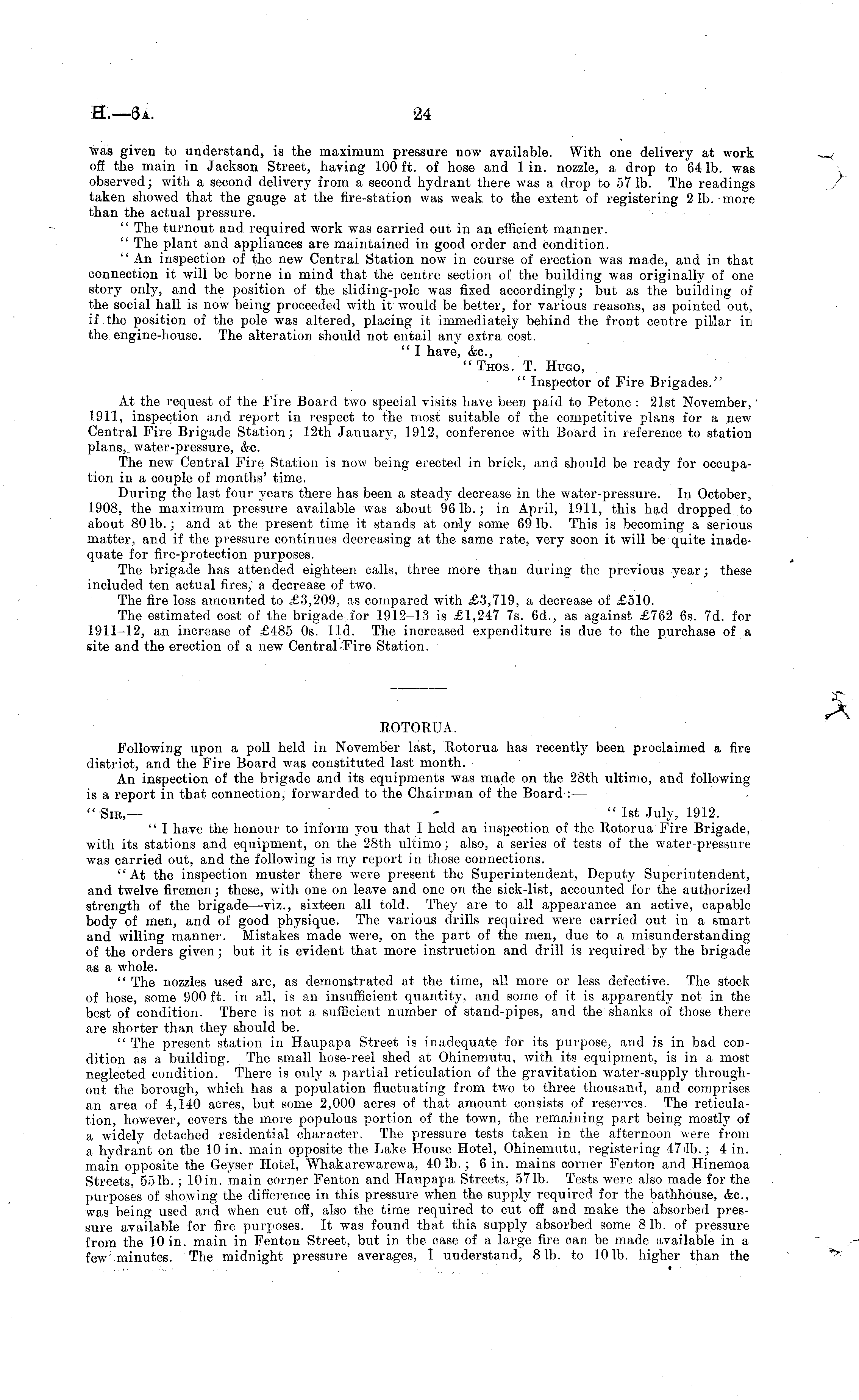 was given to understand, is the maximum pressure now available. With one delivery at work off the main in Jackson Street, having 100 ft. of hose and 1 in. nozzle, a drop to 641b. was oßserved; with a second delivery from a second hydrant there was a drop to 571b. The readings taken showed that the gauge at the fire-station was weak to the extent of registering 2 lb. more than the actual pressure. " The turnout and required work was carried out in an efficient manner. " The plant and appliances are maintained in good order and condition. "An inspection of the new Central Station now in course of erection was made, and in that connection it will be borne in mind that the centre section of the building was originally of one story only, and the position of the sliding-pole was fixed accordingly; but as the building of the social hall is now being proceeded with it would be better, for various reasons, as pointed out, if the position of the pole was altered, placing it immediately behind the front centre pillar in the engine-house. The alteration should not entail any extra cost. " I have, &c, " Thos. T. Hugo, " Inspector of Fire Brigades." At the request of the Fire Board two special visits have been paid to Petone : 21st November, 1911, inspection and report in respect to the most suitable of the competitive plans for a new Central Fire Brigade Station; 12th January, 1912, conference with Board in reference to station plans,, water-pressure, <fec. The new Central Fire Station is now being erected in brick, and should be ready for occupation in a couple of months' time. During the last four years there has been a steady decrease in the water-pressure. In October, 1908, the maximum pressure available was about 961b.; in April, 1911, this had dropped to about 80 lb.; and at the present time it stands at only some 69 lb. This is becoming a serious matter, and if the pressure continues decreasing at the same rate, very soon it will be quite inadequate for fire-protection purposes. The brigade has attended eighteen calls, three more than during the previous year; these included ten actual fires, a decrease of two. The fire loss amounted to £3,209, as compared with £3,719, a decrease of £510. The estimated cost of the brigade.for 1912-13 is £1,247 7s. 6d., as against £762 6s. 7d. for 1911-12, an increase of £485 os. lid. The increased expenditure is due to the purchase of a site and the erection of a new Central Fire Station.