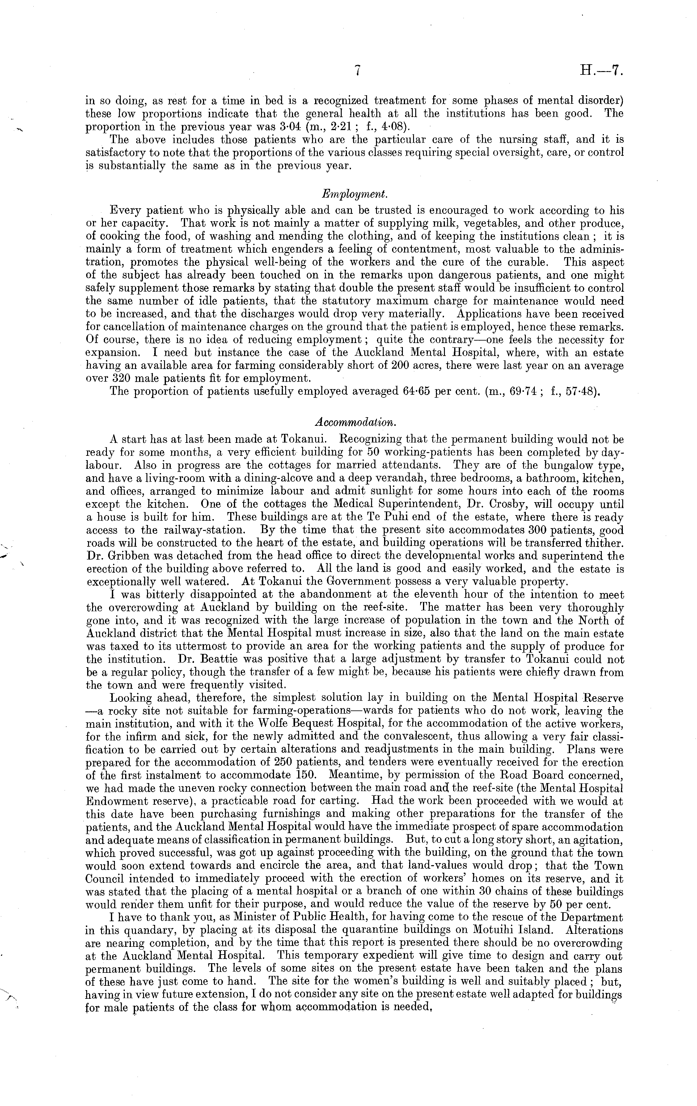 in so doing, as rest for a time in bed is a recognized treatment for some phases of mental disorder) these low proportions indicate that the general health at all the institutions has been good. The proportion in the previous year was 3-04 (m., 2-21 ; f., 4-08). The above includes those patients who are the particular care of the nursing staff, and it is satisfactory to note that the proportions of the various classes requiring special oversight, care, or control is substantially the same as in the previous year. Employment. Every patient who is physically able and can be trusted is encouraged to work according to his or her capacity. That work is not mainly a matter of supplying milk, vegetables, and other produce, of cooking the food, of washing and mending the clothing, and of keeping the institutions clean ; it is mainly a form of treatment which engenders a feeling of contentment, most valuable to the administration, promotes the physical well-being of the workers and the cure of the curable. This aspect of the subject has already been touched on in the remarks upon dangerous patients, and one might safely supplement those remarks by stating that double the present staff would be insufficient to control the same number of idle patients, that the statutory maximum charge for maintenance would need to be increased, and that the discharges would drop very materially. Applications have been received for cancellation of maintenance charges on the ground that the patient is employed, hence these remarks. Of course, there is no idea of reducing employment; quite the contrary —one feels the necessity for expansion. I need but instance the case of the Auckland Mental Hospital, where, with an estate having an available area for farming considerably short of 200 acres, there were last year on an average over 320 male patients fit for employment. The proportion of patients usefully employed averaged 64-65 per cent, (m., 69-74 ; 1, 57-48). Accommodation. A start has at last been made at Tokanui. Recognizing that the permanent building would not be ready for some months, a very efficient building for 50 working-patients has been completed by daylabour. Also in progress are the cottages for married attendants. They are of the bungalow type, and have a living-room with a dining-alcove and a deep verandah, three bedrooms, a bathroom, kitchen, and offices, arranged to minimize labour and admit sunlight for some hours into each of the rooms except the kitchen. One of the cottages the Medical Superintendent, Dr. Crosby, will occupy until a house is built for him. These buildings are at the Te Puhi end of the estate, where there is ready access to the railway-station. By the time that the present site accommodates 300 patients, good roads will be constructed to the heart of the estate, and building operations will be transferred thither. Dr. Gribben was detached from the head office to direct the developmental works and superintend the erection of the building above referred to. All the land is good and easily worked, and the estate is exceptionally well watered. At Tokanui the Government possess a very valuable property. I was bitterly disappointed at the abandonment at the eleventh hour of the intention to meet the overcrowding at Auckland by building on the reef-site. The matter has been very thoroughly gone into, and it was recognized with the large increase of population in the town and the North of Auckland district that the Mental Hospital must increase in size, also that the land on the main estate was taxed to its uttermost to provide an area for the working patients and the supply of produce for the institution. Dr. Beattie was positive that a large adjustment by transfer to Tokanui could not be a regular policy, though the transfer of a few might be, because his patients were chiefly drawn from the town and were frequently visited. Looking ahead, therefore, the simplest solution lay in building on the Mental Hospital Reserve —a rocky site not suitable for farming-operations —wards for patients who do not work, leaving the main institution, and with it the Wolfe Bequest Hospital, for the accommodation of the active workers, for the infirm and sick, for the newly admitted and the convalescent, thus allowing a very fair classification to be carried out by certain alterations and readjustments in the main building. Plans were prepared for the accommodation of 250 patients, and tenders were eventually received for the erection of the first instalment to accommodate 150. Meantime, by permission of the Road Board concerned, we had made the uneven rocky connection between the main road and the reef-site (the Mental Hospital Endowment reserve), a practicable road for carting. Had the work been proceeded with we would at this date have been purchasing furnishings and making other preparations for the transfer of the patients, and the Auckland Mental Hospital would have the immediate prospect of spare accommodation and adequate means of classification in permanent buildings. But, to cut a long story short, an agitation, which proved successful, was got up against proceeding with the building, on the ground that the town would soon extend towards and encircle the area, and that land-values would drop; that the Town Council intended to immediately proceed with the erection of workers' homes on its reserve, and it was stated that the placing of a mental hospital or a branch of one within 30 chains of these buildings would render them unfit for their purpose, and would reduce the value of the reserve by 50 per cent. I have to thank you, as Minister of Public Health, for having come to the rescue of the Department in this quandary, by placing at its disposal the quarantine buildings on Motuihi Island. Alterations are nearing completion, and by the time that this report is presented there should be no overcrowding at the Auckland Mental Hospital. This temporary expedient will give time to design and car