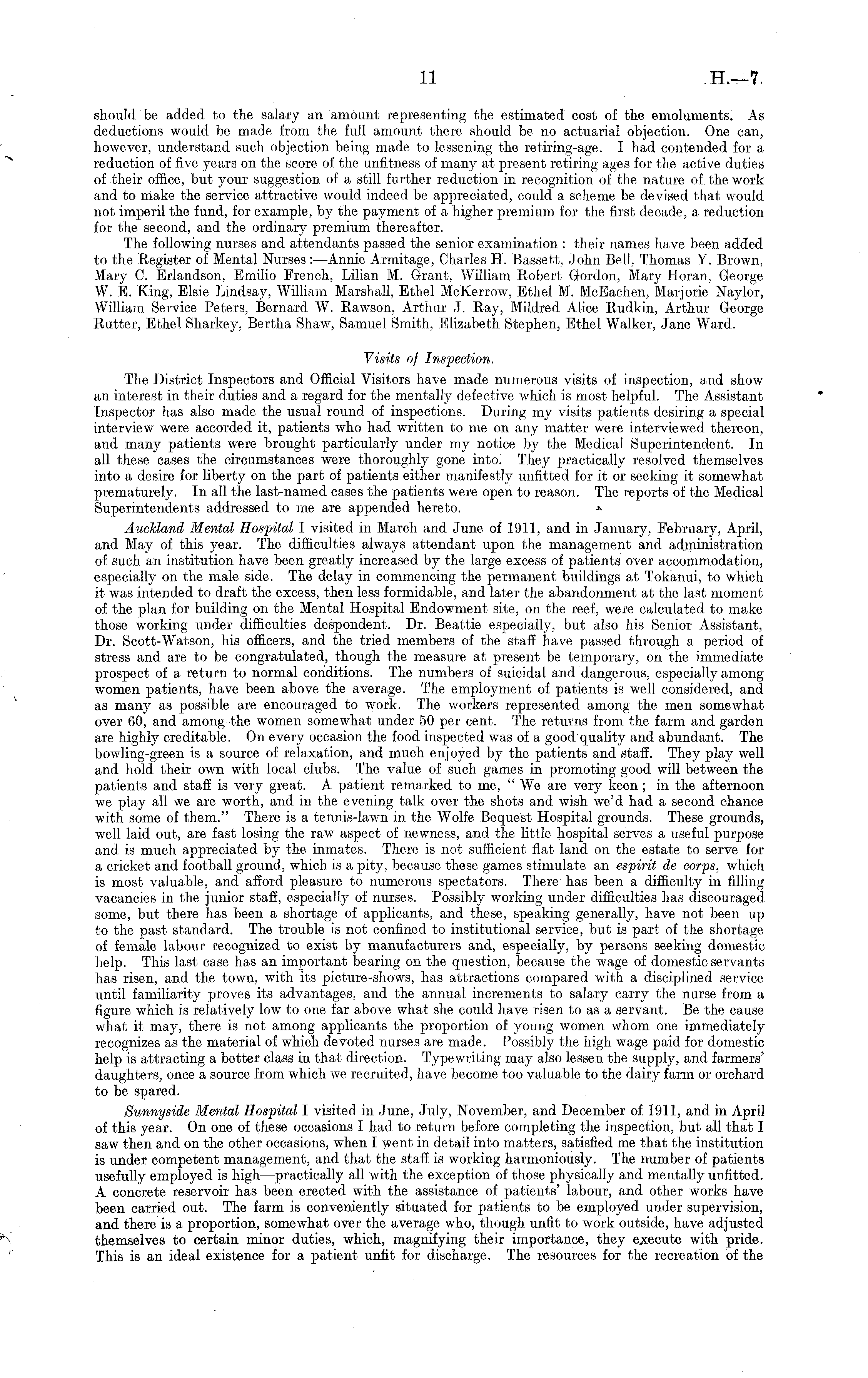 should be added to the salary an amount representing the estimated cost of the emoluments. As deductions would be made from the full amount there should be no actuarial objection. One can, however, understand such objection being made to lessening the retiring-age. I had contended for a reduction of five years on the score of the unfitness of many at present retiring ages for the active duties of their office, but your suggestion of a still further reduction in recognition of the nature of the work and to make the service attractive would indeed be appreciated, could a scheme be devised that would not imperil the fund, for example, by the payment of a higher premium for the first decade, a reduction for the second, and the ordinary premium thereafter. The following nurses and attendants passed the senior examination : their names have been added to the Register of Mental Nurses: —Annie Armitage, Charles H. Bassett, John Bell, Thomas Y. Brown, Mary C. Erlandson, Emilio French, Lilian M. Grant, William Robert Gordon, Mary Horan, George W. E. King, Elsie Lindsay, William Marshall, Ethel McKerrow, Ethel M. McEachen, Marjorie Naylor, William Service Peters, Bernard W. Rawson, Arthur J. Ray, Mildred Alice Rudkin, Arthur George Rutter, Ethel Sharkey, Bertha Shaw, Samuel Smith, Elizabeth Stephen, Ethel Walker, Jane Ward. Visits of Inspection. The District Inspectors and Official Visitors have made numerous visits of inspection, and show an interest in their duties and a regard for the mentally defective which is most helpful. The Assistant Inspector has also made the usual round of inspections. During my visits patients desiring a special interview were accorded it, patients who had written to me on any matter were interviewed thereon, and many patients were brought particularly under my notice by the Medical Superintendent. In all these cases the circumstances were thoroughly gone into. They practically resolved themselves into a desire for liberty on the part of patients either manifestly unfitted for it or seeking it somewhat prematurely. In all the last-named cases the patients were open to reason. The reports of the Medical Superintendents addressed to me are appended hereto. Auckland Mental Hospital I visited in March and June of 1911, and in January, February, April, and May of this year. The difficulties always attendant upon the management and administration of such an institution have been greatly increased by the large excess of patients over accommodation, especially on the male side. The delay in commencing the permanent buildings at Tokanui, to which it was intended to draft the excess, then less formidable, and later the abandonment at the last moment of the plan for building on the Mental Hospital Endowment site, on the reef, were calculated to make those working under difficulties despondent. Dr. Beattie especially, but also his Senior Assistant, Dr. Scott-Watson, his officers, and the tried members of the staff have passed through a period of stress and are to be congratulated, though the measure at present be temporary, on the immediate prospect of a return to normal conditions. The numbers of suicidal and dangerous, especially among women patients, have been above the average. The employment of patients is well considered, and as many as possible are encouraged to work. The workers represented among the men somewhat over 60, and among the women somewhat under 50 per cent. The returns from the farm and garden are highly creditable. On every occasion the food inspected was of a good quality and abundant. The bowling-green is a source of relaxation, and much enjoyed by the patients and staff. They play well and hold their own with local clubs. The value of such games in promoting good will between the patients and staff is very great. A patient remarked to me, "We are very keen ; in the afternoon we play all we are worth, and in the evening talk over the shots and wish we'd had a second chance with some of them." There is a tennis-lawn in the Wolfe Bequest Hospital grounds. These grounds, well laid out, are fast losing the raw aspect of newness, and the little hospital serves a useful purpose and is much appreciated by the inmates. There is not sufficient flat land on the estate to serve for a cricket and football ground, which is a pity, because these games stimulate an espirit de corps, which is most valuable, and afford pleasure to numerous spectators. Here has been a difficulty in filling vacancies in the junior staff, especially of nurses. Possibly working under difficulties has discouraged some, but there has been a shortage of applicants, and these, speaking generally, have not been up to the past standard. The trouble is not confined to institutional service, but is part of the shortage of female labour recognized to exist by manufacturers and, especially, by persons seeking domestic help. This last case has an important bearing on the question, because the wage of domestic servants has risen, and the town, with its picture-shows, has attractions compared with a disciplined service until familiarity proves its advantages, and the annual increments to salary carry the nurse from a figure which is relatively low to one far above what she could have risen to as a servant. Be the cause what it may, there is not among applicants the proportion of young women whom one immediately recognizes as the material of which devoted nurses are made. Possibly the high wage paid for domestic help is attracting a better class in that direction. Typewriting may also lessen the supply, and farmers' daughters, once a source from which we recruited, have become too valuable to the dairy farm or orchard to be spared. Sunnyside Mental Hospital I visited in June, July, November, and December of 1911, and in April of this year. On one of these occasions I had to return before completing the inspection, but all that I saw then and on the other occasions, when I went in detail into matters, satisf