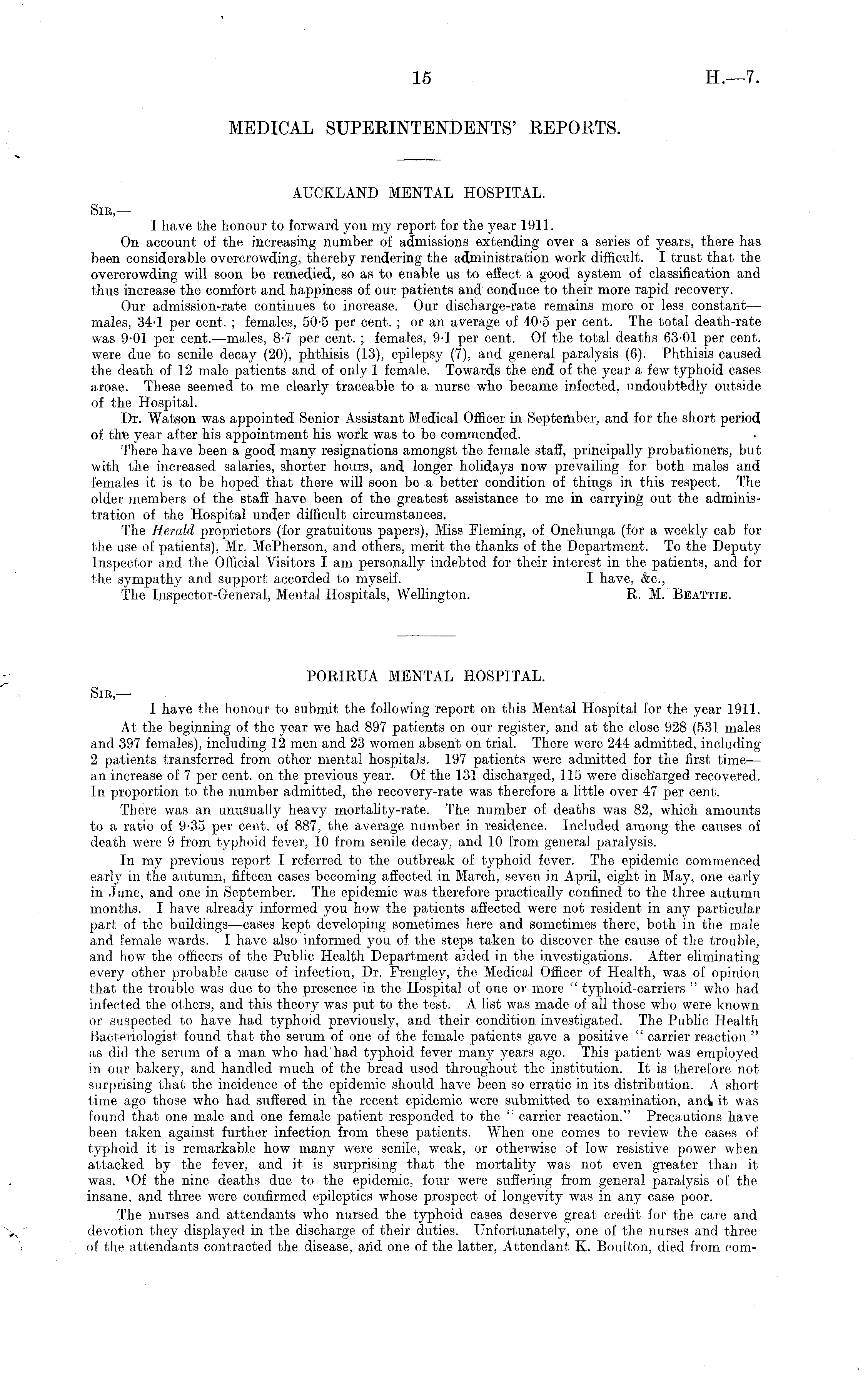AUCKLAND MENTAL HOSPITAL. Sir — I have the honour to forward you my report for the year 1911. On account of the increasing number of admissions extending over a series of years, there has been considerable overcrowding, thereby rendering the administration work difficult. I trust that the overcrowding will soon be remedied, so as to enable us to effect a good system of classification and thus increase the comfort and happiness of our patients and conduce to their more rapid recovery. Our admission-rate continues to increase. Our discharge-rate remains more or less constant — males, 34-1 per cent. ; females, 50-5 per cent. ;or an average of 40-5 per cent. The total death-rate was 9-01 per cent. —males, 8-7 per cent. ; females, 9-1 per cent. Of the total deaths 63-01 per cent, were due to senile decay (20), phthisis (13), epilepsy (7), and general paralysis (6). Phthisis caused the death of 12 male patients and of only 1 female. Towards the end of the year a few typhoid cases arose. These seemed to me clearly traceable to a nurse who became infected, undoubtedly outside of the Hospital. Dr. Watson was appointed Senior Assistant Medical Officer in September, and for the short period of the year after his appointment his work was to be commended. There have been a good many resignations amongst the female staff, principally probationers, but with the increased salaries, shorter hours, and longer holidays now prevailing for both males and females it is to be hoped that there will soon be a better condition of things in this respect. The older members of the staff have been of the greatest assistance to me in carrying out the administration of the Hospital under difficult circumstances. The Herald proprietors (for gratuitous papers), Miss Fleming, of Onehunga (for a weekly cab for the use of patients), Mr. McPherson, and others, merit the thanks of the Department. To the Deputy Inspector and the Official Visitors I am personally indebted for their interest in the patients, and for the sympathy and support accorded to myself. I have, &c, The Inspector-General, Mental Hospitals, Wellington. R. M. Beattie.